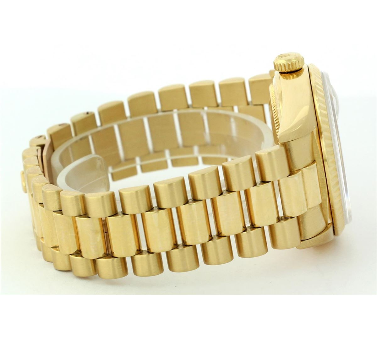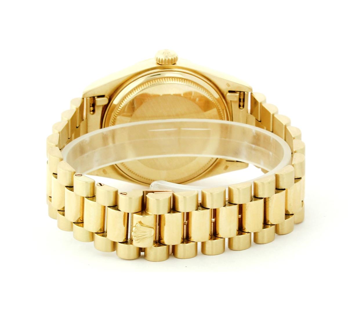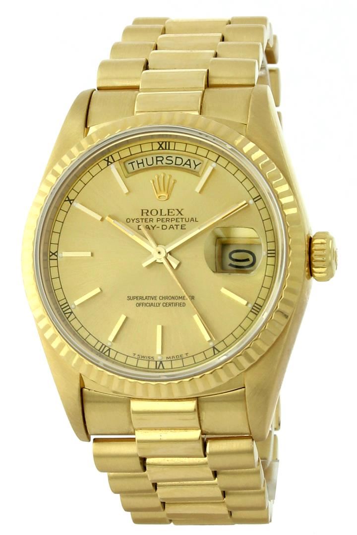 One Mens Rolex Day Date President Polished, Serviced & Electronically Tested, Yellow Gold Case:36mm, Yellow Gold Crown, Bezel: 18K Yellow Gold Fluted Bezel, Custom Crystal: Acrylic Cyclops Lens. Movement: Automatic Winding Movement Caliber 3055. Dial: Champagne With Index Hour Markers and Square Roman Track, Date Window: 3 O'Clock Position, Day Display: 12 O'Clock Position, Model: 18038, Single Quickset, Condition: G-6 Extra Fine. Bracelet: Yellow Gold President Hidden Clasp With Crown Logo. Bright Polish. 6.5 Inch Length