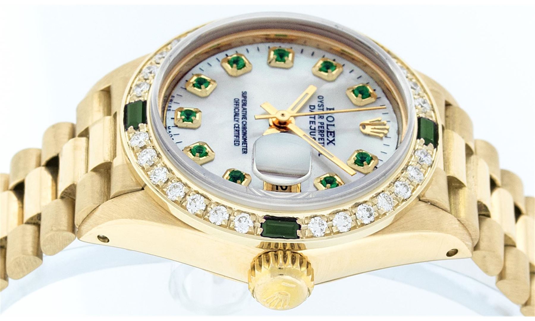 One Ladies 18K Rolex President Polished, Serviced & Electronically Tested, Yellow Gold Case: 26mm, 18K Yellow Gold Crown, Custom Bezel: 18K Yellow Gold Emerald Bead Set Diamond Bezel, Diamond + Stone Count: 28 Diamonds + 4 Emeralds. Total Weight .70 Carat, Clarity: SI-VS, Color: G to H. Custom Crystal: Synthetic Sapphire Cyclops Lens. Movement: Automatic Winding Movement Caliber 2030. Custom Dial: Mother Of Pearl With Emeralds, Stone Count: 10 Emeralds In Dial. Date Window: 3 O'Clock Position, Model: Datejust, Condition: G-6 Extra Fine. Bracelet: 18K Yellow Gold President With Hidden Clasp, Bright & Satin Polish. 5.5 Inch Length, Standard President Clasp (Hidden Clasp), With Rolex Logo. Comes with 6 month warranty.