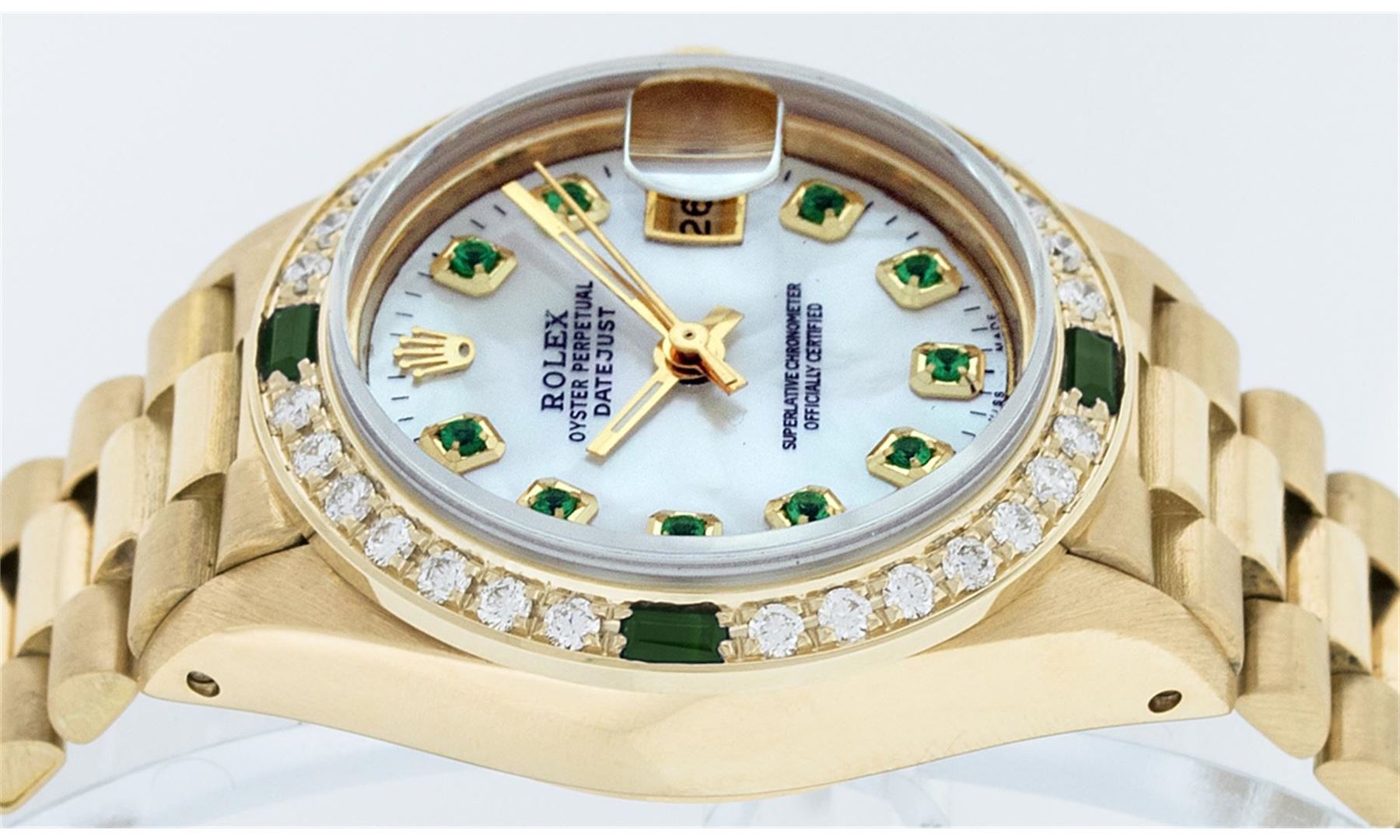 One Ladies 18K Rolex President Polished, Serviced & Electronically Tested, Yellow Gold Case: 26mm, 18K Yellow Gold Crown, Custom Bezel: 18K Yellow Gold Emerald Bead Set Diamond Bezel, Diamond + Stone Count: 28 Diamonds + 4 Emeralds. Total Weight .70 Carat, Clarity: SI-VS, Color: G to H. Custom Crystal: Synthetic Sapphire Cyclops Lens. Movement: Automatic Winding Movement Caliber 2030. Custom Dial: Mother Of Pearl With Emeralds, Stone Count: 10 Emeralds In Dial. Date Window: 3 O'Clock Position, Model: Datejust, Condition: G-6 Extra Fine. Bracelet: 18K Yellow Gold President With Hidden Clasp, Bright & Satin Polish. 5.5 Inch Length, Standard President Clasp (Hidden Clasp), With Rolex Logo. Comes with 6 month warranty.