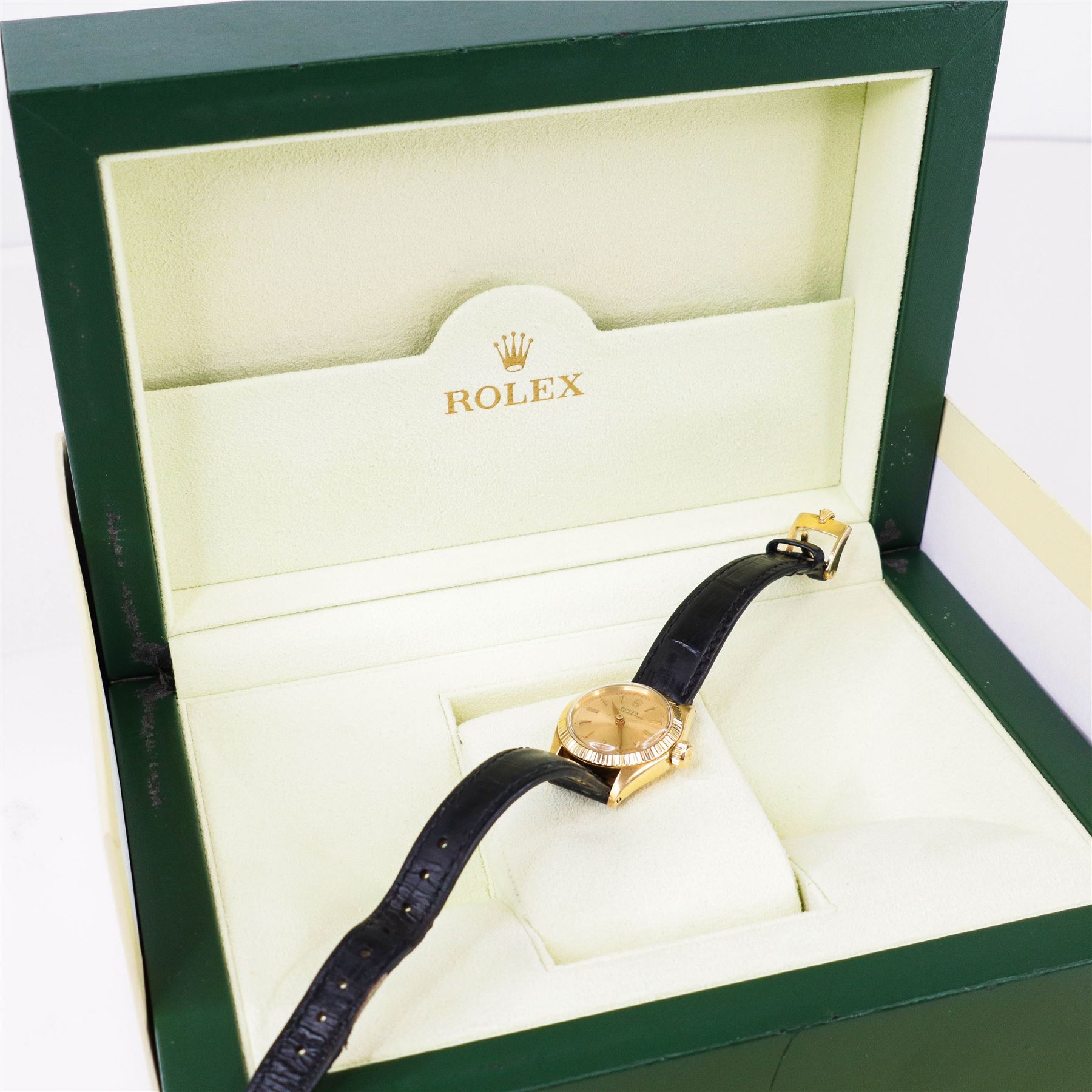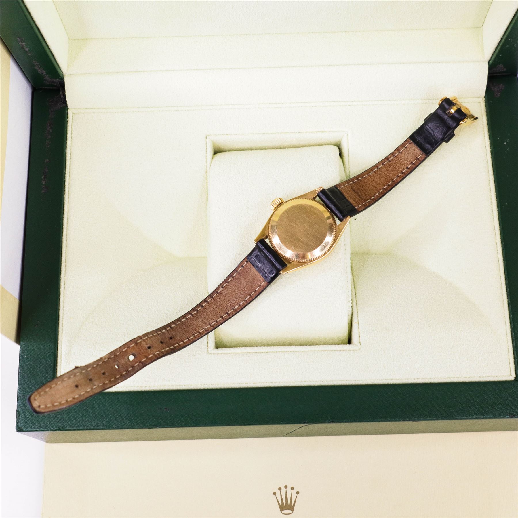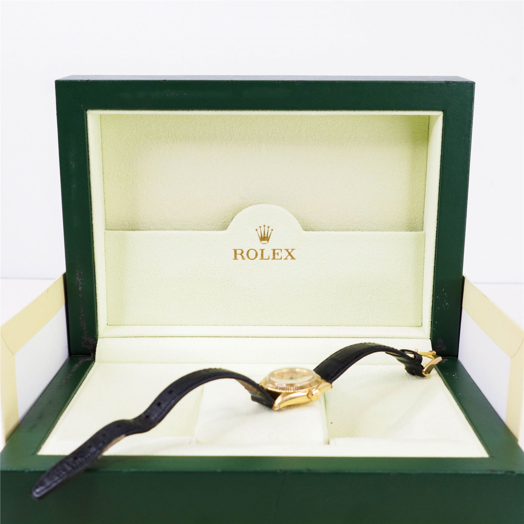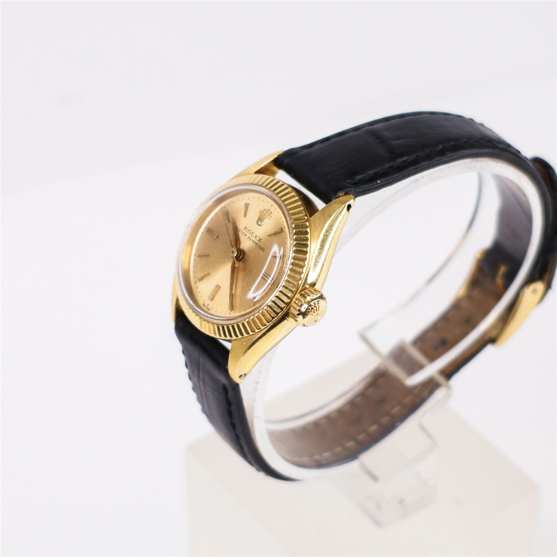 Ladies 18k Rolex watch. Having a newer band with the original gold Rolex buckle. Model number 2726. The watch was just fully serviced. Caliber is 1130 and serial # 448483