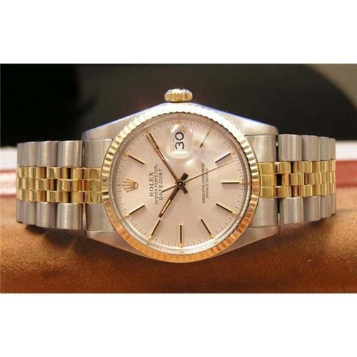 Gentleman's 18kt gold and stainless steel Datejust 16013 wristwatch, with a 27 Jewel automatic Swiss quickset movement model #3035, with a fluted 18kt gold bezel model #16013, mother pearl dial with gold bar hour designations, slender gold tone hands, sweep seconds, date function, new crystal, original 18K/ss jubilee band and original box and papers and would make a handsome gift or addition to any fine collection.