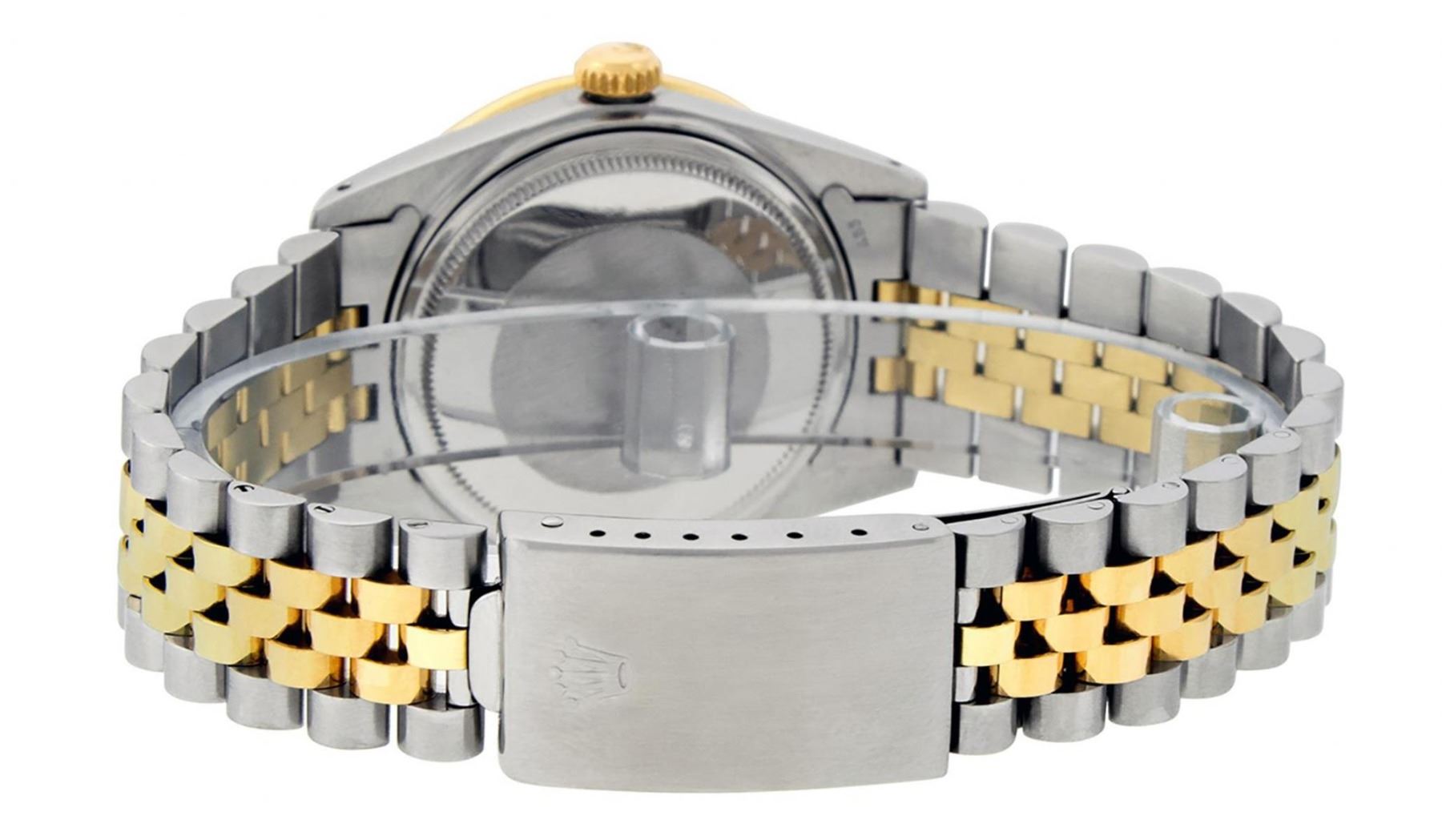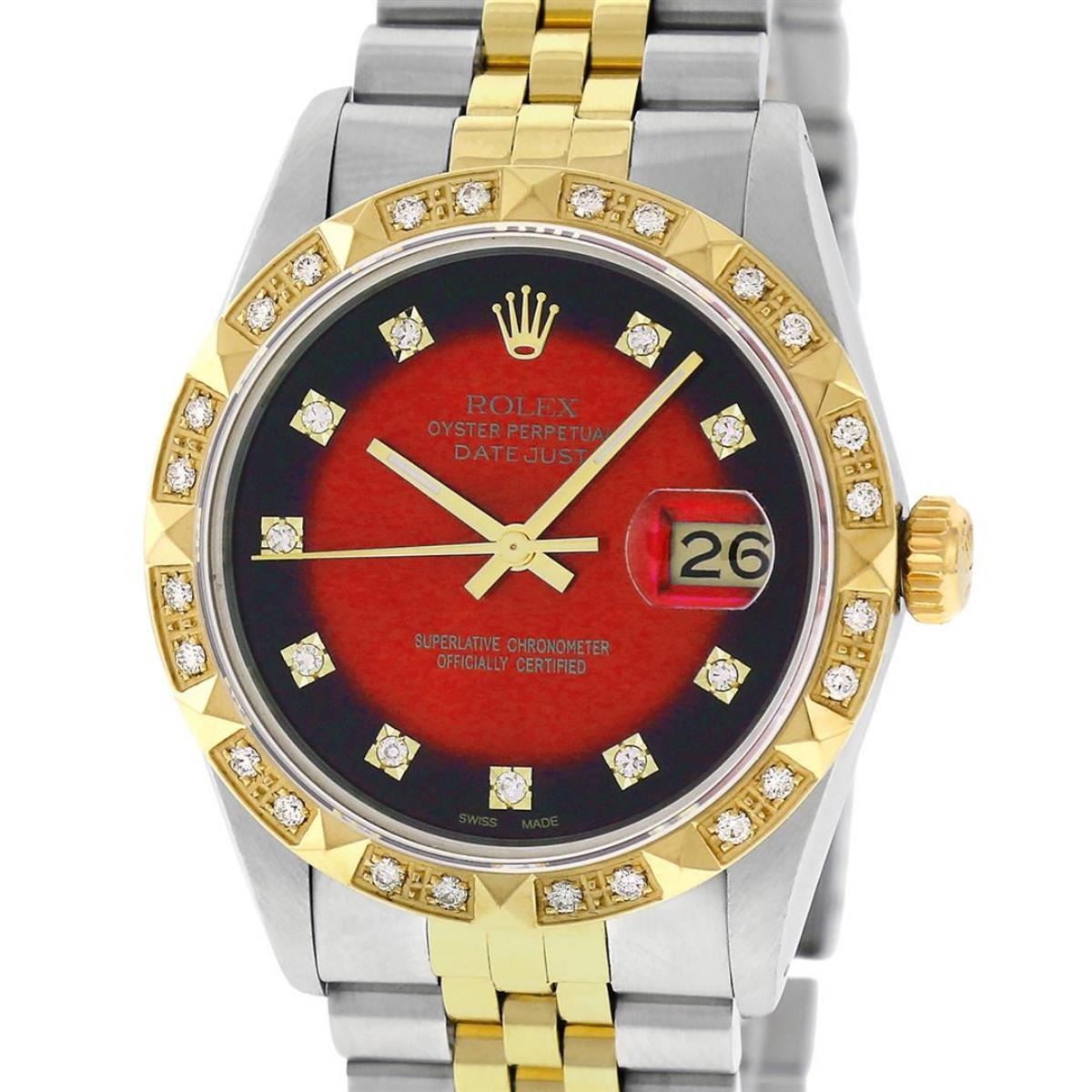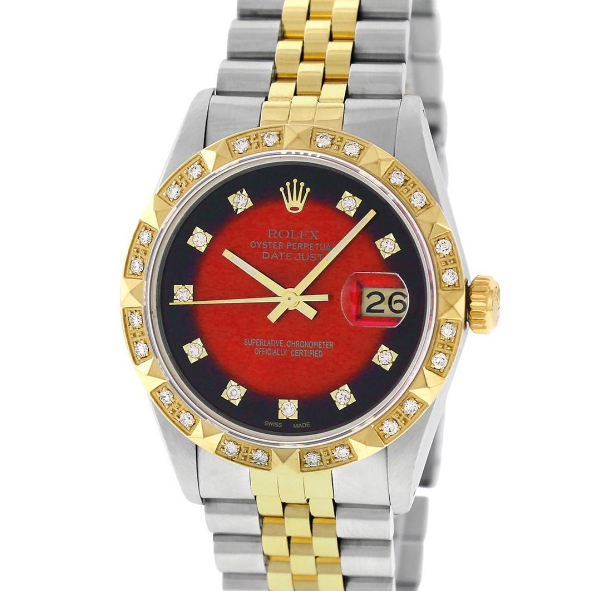 One Mens Yellow Gold Rolex Datejust Polished Bright with Satin Finish, Serviced & Electronically Tested, Stainless Steel Case: 36mm, Yellow Gold Crown, Custom Bezel: New 18K Yellow Gold Pyramid Diamond Bezel, Diamond Count: 24 Diamonds In Bezel, Total Weight .75 Carat, Clarity: SI-VS, Color: G to H. Custom Crystal: New Scratch Resistant Synthetic Sapphire Cyclops Lens. Custom Hands: New Luminecent Hands. Movement: Automatic Winding Movement. Custom Dial: Red Vignette Single Cut Diamond Dial, Diamond Count: 10 Diamonds On Dial, Color: G to H, Clarity: VS. Date Window: 3 O'Clock Position Date Display, Quickset, Model: Datejust. Condition: G-6 Extra Fine. Bracelet: Yellow Gold And Stainless Steel Jubilee Band. Bright Polish & Satin Finish. 7.0 Inch Length, Adjustable. Standard Clasp, With Rolex Logo. This Watch Has Been Serviced And Polished It Is Free Of All Scratches And Dents.