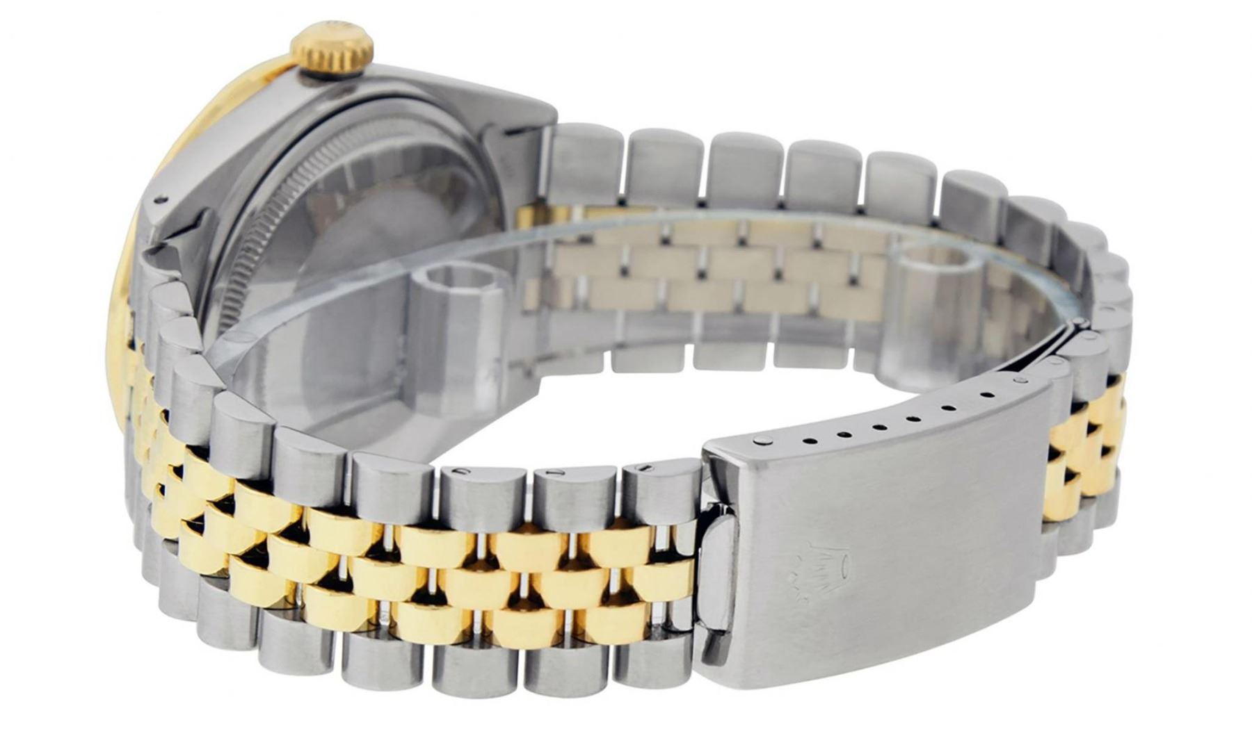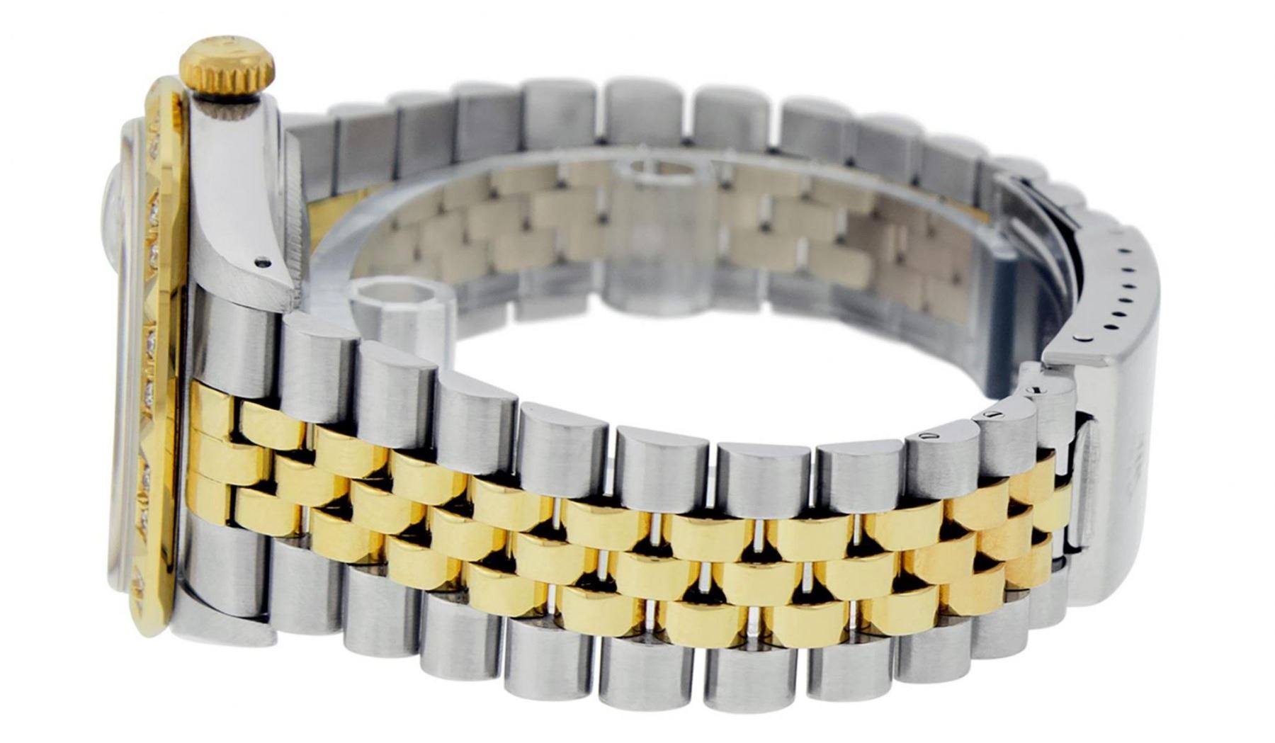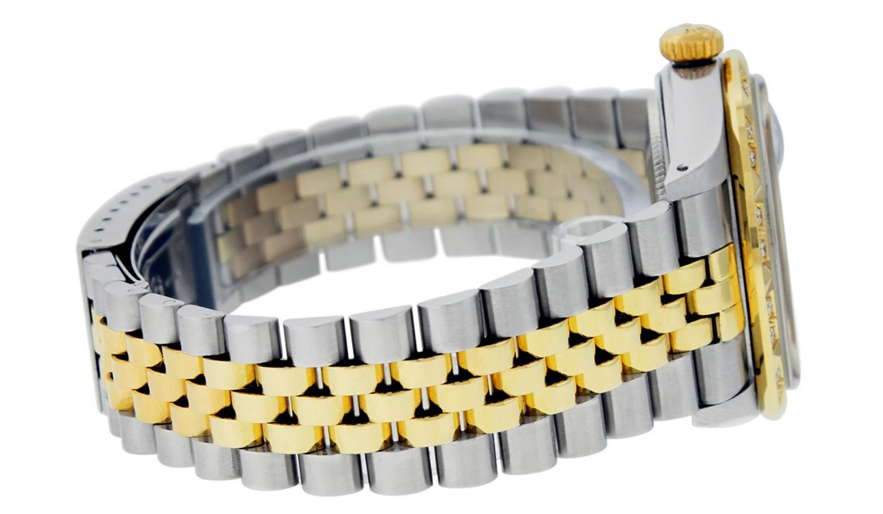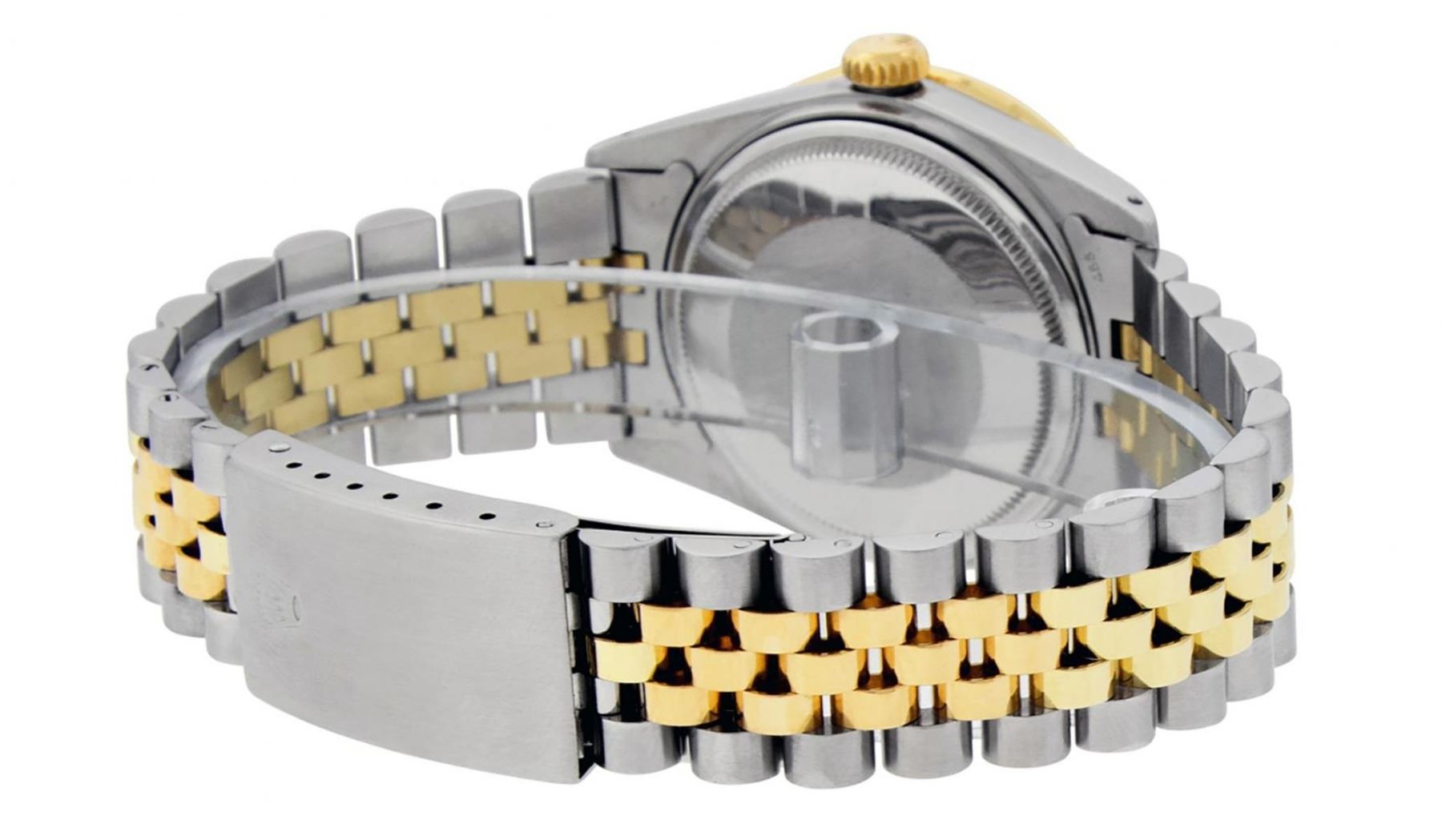 One Mens Yellow Gold Rolex Datejust Polished Bright with Satin Finish, Serviced & Electronically Tested, Stainless Steel Case: 36mm, Yellow Gold Crown, Custom Bezel: New 18K Yellow Gold Pyramid Diamond Bezel, Diamond Count: 24 Diamonds In Bezel, Total Weight .75 Carat, Clarity: SI-VS, Color: G to H. Custom Crystal: New Scratch Resistant Synthetic Sapphire Cyclops Lens. Custom Hands: New Luminecent Hands. Movement: Automatic Winding Movement. Custom Dial: Red Vignette Single Cut Diamond Dial, Diamond Count: 10 Diamonds On Dial, Color: G to H, Clarity: VS. Date Window: 3 O'Clock Position Date Display, Quickset, Model: Datejust. Condition: G-6 Extra Fine. Bracelet: Yellow Gold And Stainless Steel Jubilee Band. Bright Polish & Satin Finish. 7.0 Inch Length, Adjustable. Standard Clasp, With Rolex Logo. This Watch Has Been Serviced And Polished It Is Free Of All Scratches And Dents.
