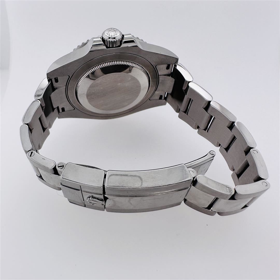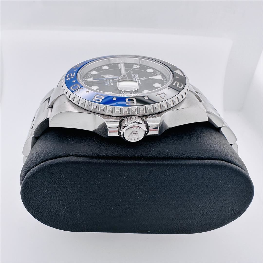 One Rolex 2022 GMT-Master II Batman Stainless Steel Oyster Bracelet. Rolex-GMT-Master II comes with warranty card. This full set includes box and papers. Stainless steel case with a stainless steel Oyster bracelet. Bi-directional rotating stainless steel bezel with a black and blue ring showing 24 hour markers. Black dial with luminous silver-tone hands and dot hour markers. Minute markers around the outer rim. Luminescent hands and markers. Date display at the 3 o'clock position. Rolex caliber 3285 automatic movement with a 70-hour power reserve. Scratch resistant sapphire crystal. Screw down crown. Solid case back. Round case shape. Case size: 40 mm. Folding Oysterlock clasp. Water resistant at 100 meters / 330 feet. Functions-date, hour, minute, second, 24 hours GMT movement. The photo shown is of the actual piece, this watch is in excellent condition!