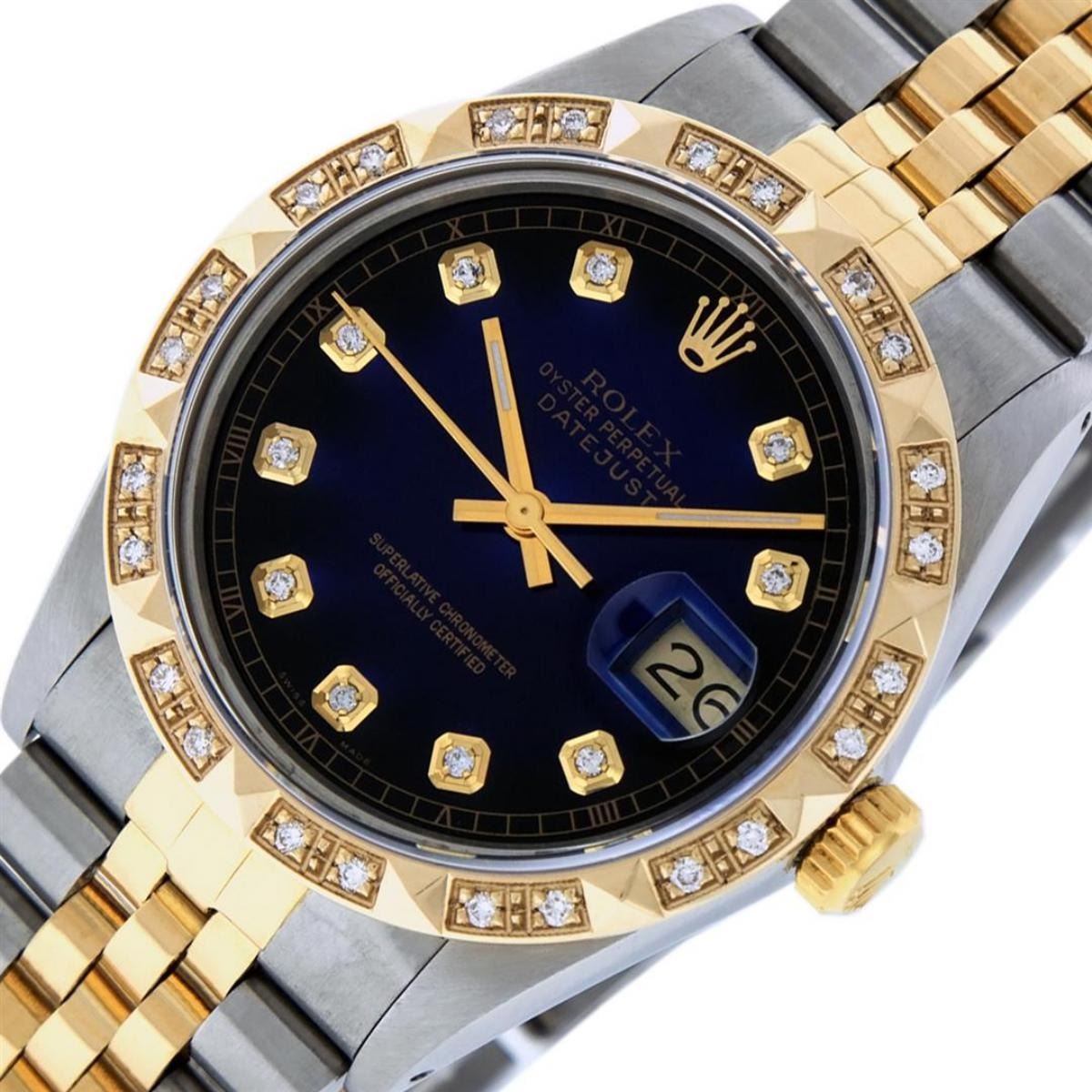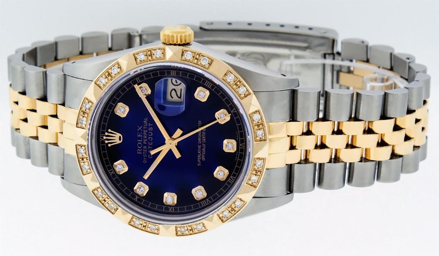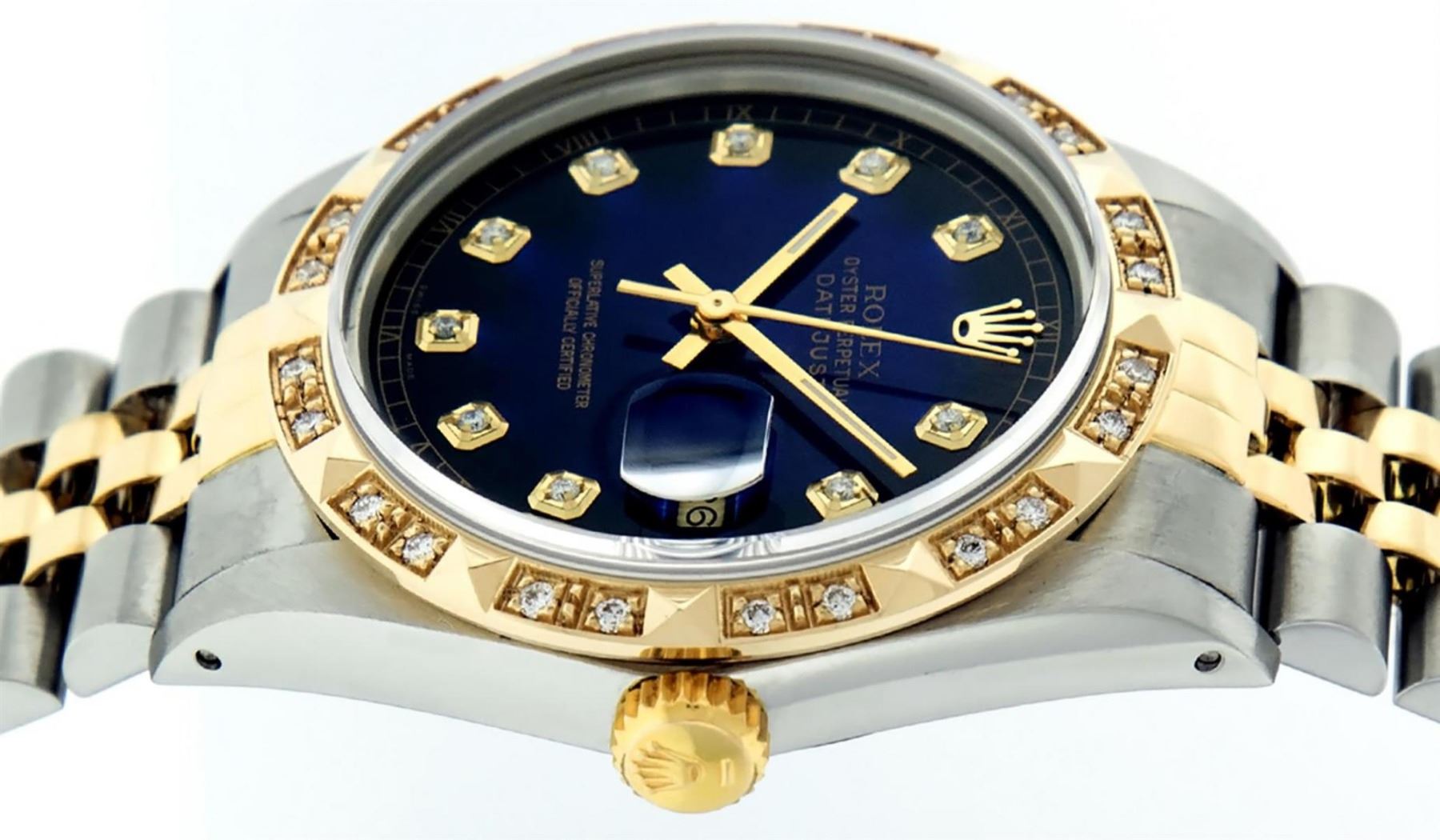 One Mens Yellow Gold Rolex Datejust Polished Bright with Satin Finish, Serviced & Electronically Tested, Stainless Steel Case: 36mm, Yellow Gold Crown, Custom Bezel: New 18K Yellow Gold Pyramid Diamond Bezel, Diamond Count: 24 Diamonds, Total Weight .75 Carat, Clarity: SI-VS, Color: G to H. Custom Crystal: New Scratch Resistant Synthetic Sapphire Cyclops Lens. Custom Hands: New Luminecent Hands. Movement: Automatic Winding Movement. Custom Dial: Blue Vignette Diamond Dial With Roman Track, Diamond Count: 10 Diamonds In Dial, Color: G to H, Clarity: VS. Date Window: 3 O'Clock Position Date Display, Quickset, Model: Datejust. Condition: G-6 Extra Fine. Bracelet: Yellow Gold And Stainless Steel Jubilee Band. Bright Polish & Satin Finish. 7.0 Inch Length, Adjustable. Standard Clasp, With Rolex Logo. This Watch Has Been Serviced And Polished It Is Free Of All Scratches And Dents.