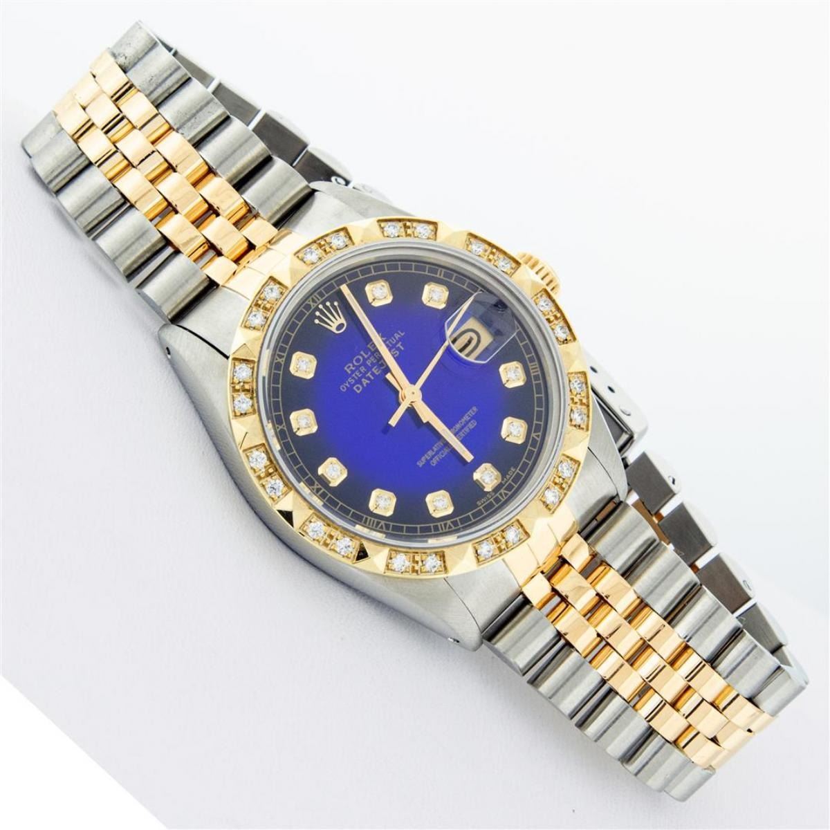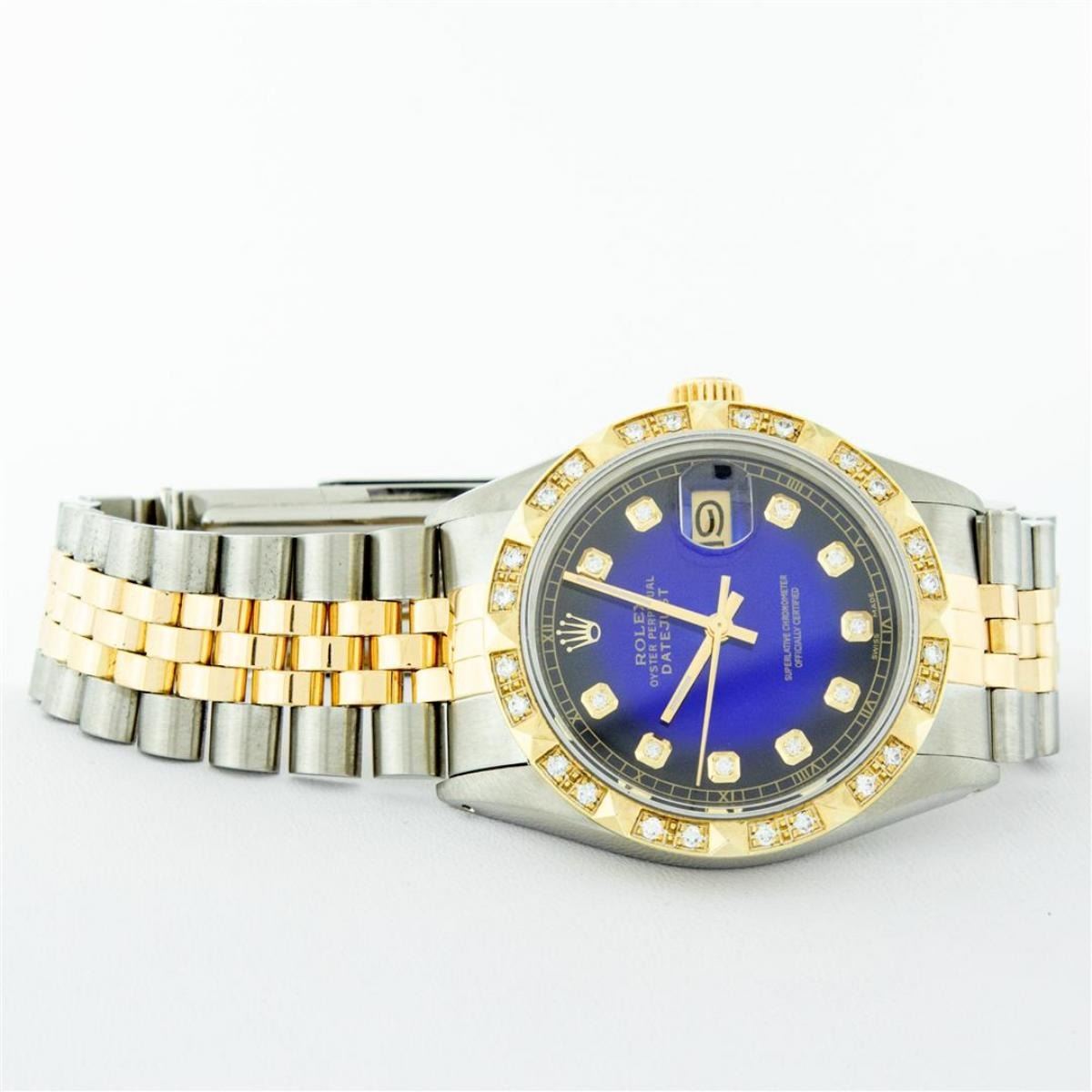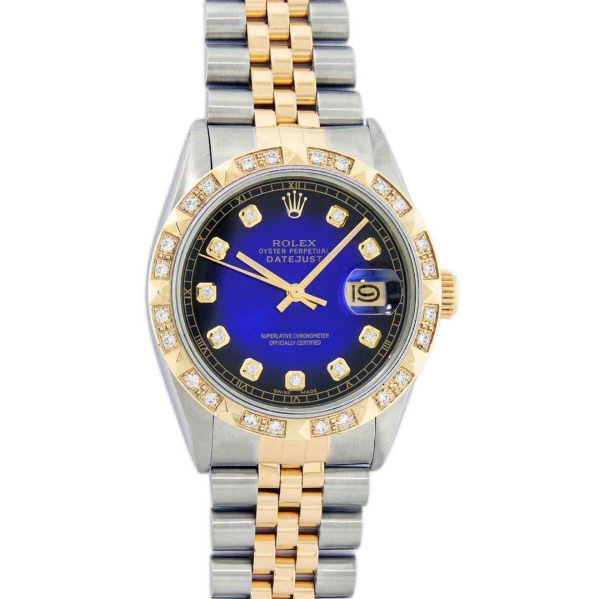 One Mens Yellow Gold Rolex Datejust Polished Bright with Satin Finish, Serviced & Electronically Tested, Stainless Steel Case: 36mm, Yellow Gold Crown, Custom Bezel: New 18K Yellow Gold Pyramid Diamond Bezel, Diamond Count: 24 Diamonds, Total Weight .75 Carat, Clarity: SI-VS, Color: G to H. Custom Crystal: New Scratch Resistant Synthetic Sapphire Cyclops Lens. Custom Hands: New Luminecent Hands. Movement: Automatic Winding Movement. Custom Dial: Blue Vignette Diamond Dial With Roman Track, Diamond Count: 10 Diamonds In Dial, Color: G to H, Clarity: VS. Date Window: 3 O'Clock Position Date Display, Quickset, Model: Datejust. Condition: G-6 Extra Fine. Bracelet: Yellow Gold And Stainless Steel Jubilee Band. Bright Polish & Satin Finish. 7.0 Inch Length, Adjustable. Standard Clasp, With Rolex Logo. This Watch Has Been Serviced And Polished It Is Free Of All Scratches And Dents.