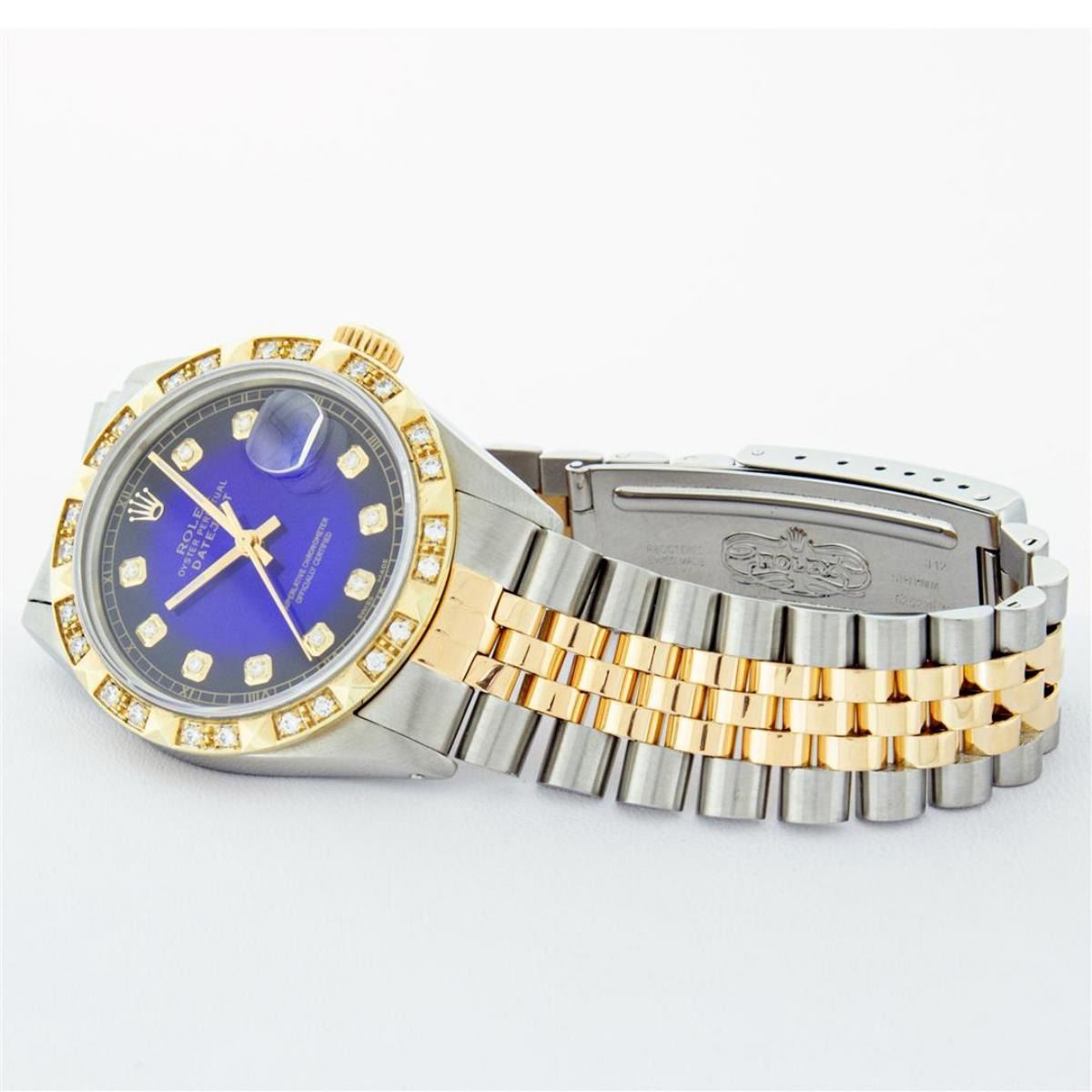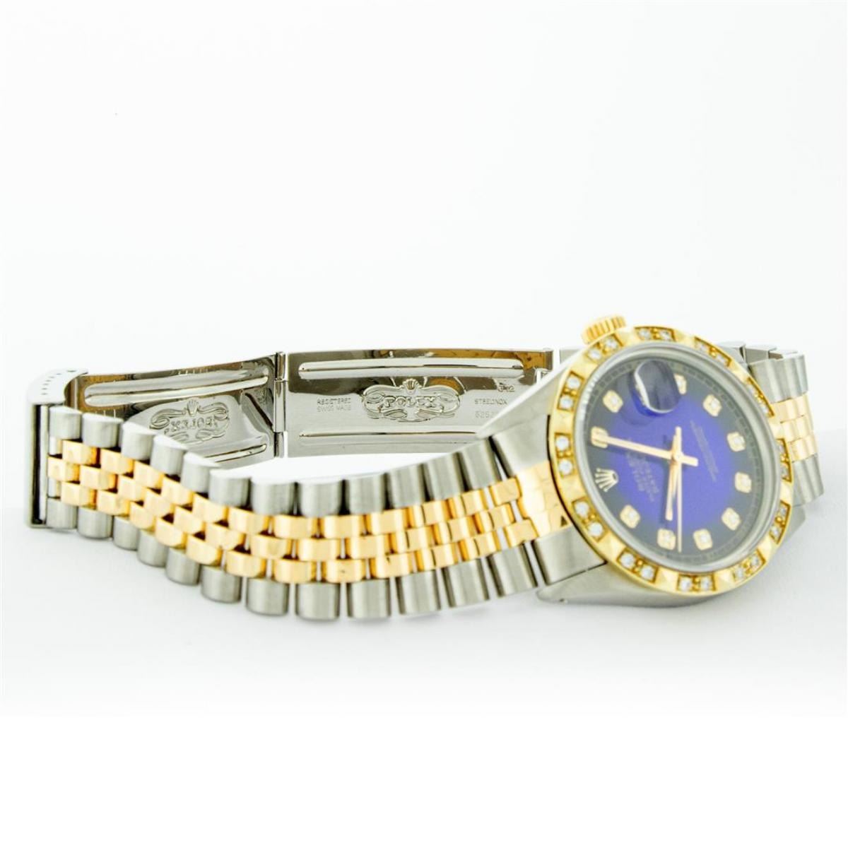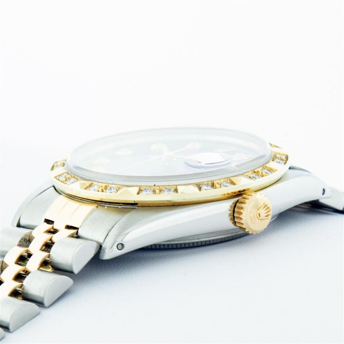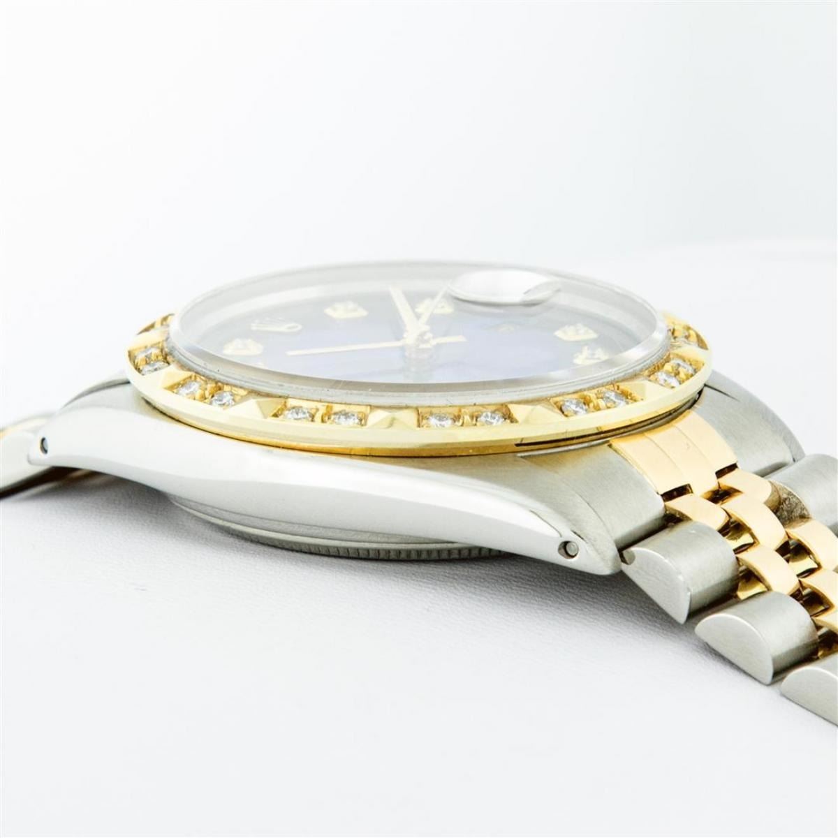 One Mens Yellow Gold Rolex Datejust Polished Bright with Satin Finish, Serviced & Electronically Tested, Stainless Steel Case: 36mm, Yellow Gold Crown, Custom Bezel: New 18K Yellow Gold Pyramid Diamond Bezel, Diamond Count: 24 Diamonds, Total Weight .75 Carat, Clarity: SI-VS, Color: G to H. Custom Crystal: New Scratch Resistant Synthetic Sapphire Cyclops Lens. Custom Hands: New Luminecent Hands. Movement: Automatic Winding Movement. Custom Dial: Blue Vignette Diamond Dial With Roman Track, Diamond Count: 10 Diamonds In Dial, Color: G to H, Clarity: VS. Date Window: 3 O'Clock Position Date Display, Quickset, Model: Datejust. Condition: G-6 Extra Fine. Bracelet: Yellow Gold And Stainless Steel Jubilee Band. Bright Polish & Satin Finish. 7.0 Inch Length, Adjustable. Standard Clasp, With Rolex Logo. This Watch Has Been Serviced And Polished It Is Free Of All Scratches And Dents.