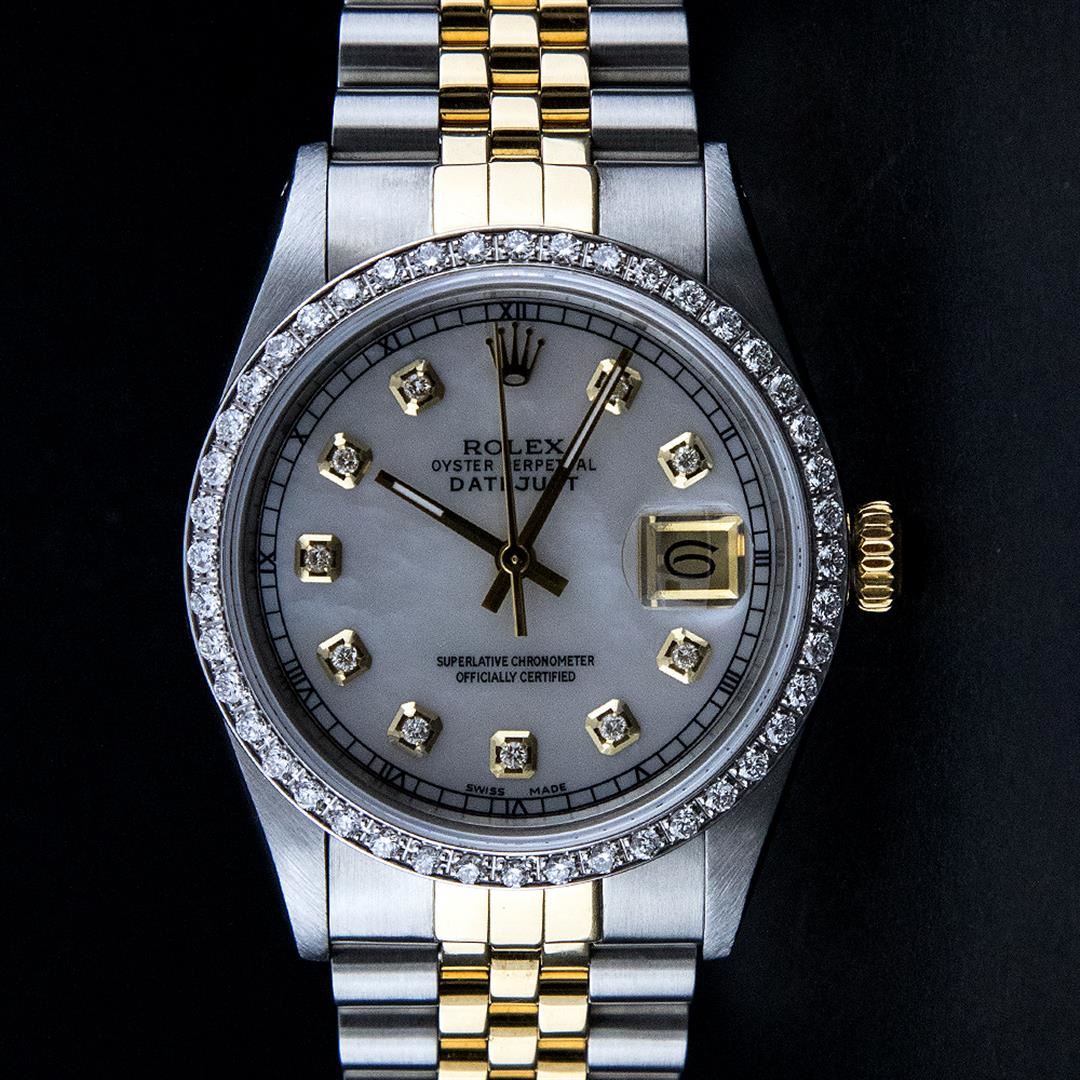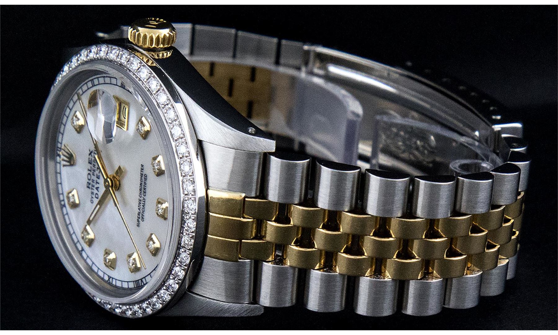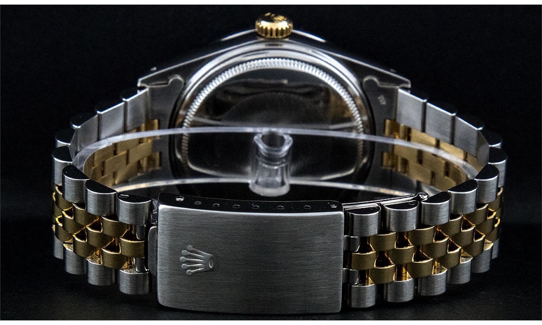 One Mens Pre Owned Yellow Gold Two Tone Rolex Datejust Polished, Serviced & Electronically Tested, Rolex Yellow Gold & Stainless Steel Case: 36mm, Rolex Yellow Gold Crown, Custom Bezel: New 18K White Gold Beadset Diamond Bezel, Diamond Count: 44 Diamonds,