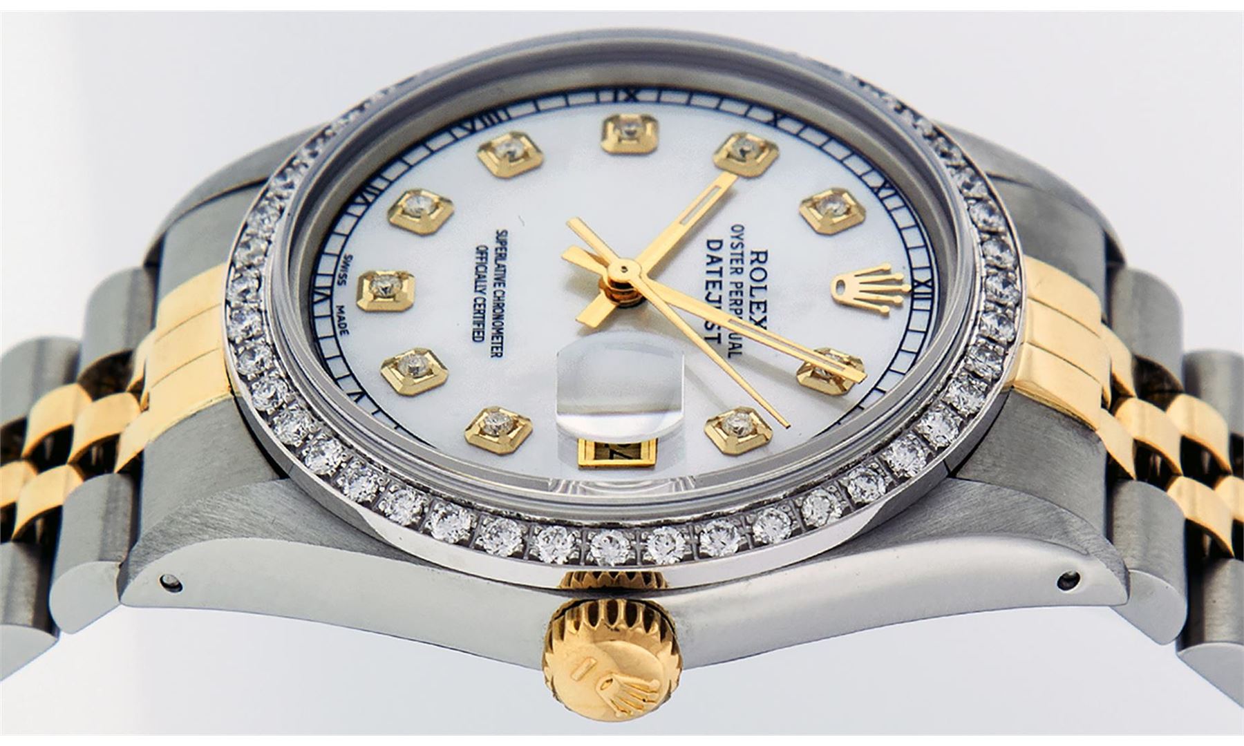 One Mens Yellow Gold Two Tone Rolex Datejust Polished, Serviced & Electronically Tested, Yellow Gold & Stainless Steel Case: 36mm, Yellow Gold Crown, Custom Bezel: 18K White Gold Beadset Diamond Bezel, Diamond Count: 44 Diamonds, Total Weight 1.00 Carat, Clarity: SI-VS, Color: G to H. Custom Crystal: New Synthetic Sapphire Cyclops Lens. Custom Hands: New Luminecent Hands. Movement: Automatic Winding Movement. Custom Dial: Mother Of Pearl Diamond Dial, 10 Diamonds in Dial G To H In Color, SI-VS Clarity, Date Window: 3 O'Clock Position Date Display, Quickset, Model: Datejust. Condition: G-6 Extra Fine. Bracelet:Two Tone Yellow Gold & Stainless Steel Jubilee. Bright Polish. 7.0 Inch Length, Adjustable. Standard Clasp, With Rolex Logo. This Watch Has Been Serviced Time Tested And Is In Excellent Condition It Is Free Of All Scratches And Dents.