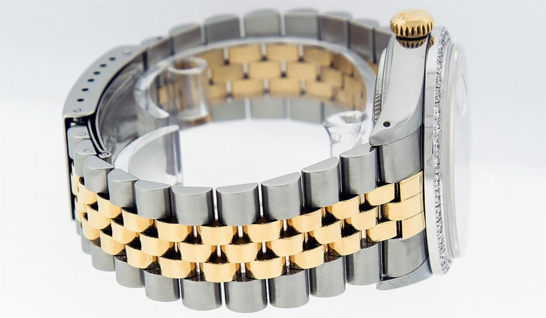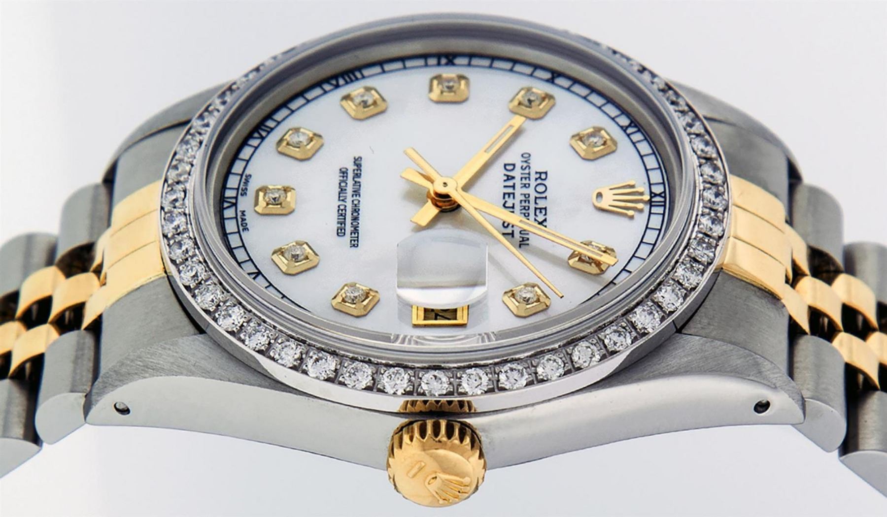 One Mens Yellow Gold Two Tone Rolex Datejust Polished, Serviced & Electronically Tested, Yellow Gold & Stainless Steel Case: 36mm, Yellow Gold Crown, Custom Bezel: 18K White Gold Beadset Diamond Bezel, Diamond Count: 44 Diamonds, Total Weight 1.00 Carat, Clarity: SI-VS, Color: G to H. Custom Crystal: New Synthetic Sapphire Cyclops Lens. Custom Hands: New Luminecent Hands. Movement: Automatic Winding Movement. Custom Dial: Mother Of Pearl Diamond Dial, 10 Diamonds in Dial G To H In Color, SI-VS Clarity, Date Window: 3 O'Clock Position Date Display, Quickset, Model: Datejust. Condition: G-6 Extra Fine. Bracelet:Two Tone Yellow Gold & Stainless Steel Jubilee. Bright Polish. 7.0 Inch Length, Adjustable. Standard Clasp, With Rolex Logo. This Watch Has Been Serviced Time Tested And Is In Excellent Condition It Is Free Of All Scratches And Dents.