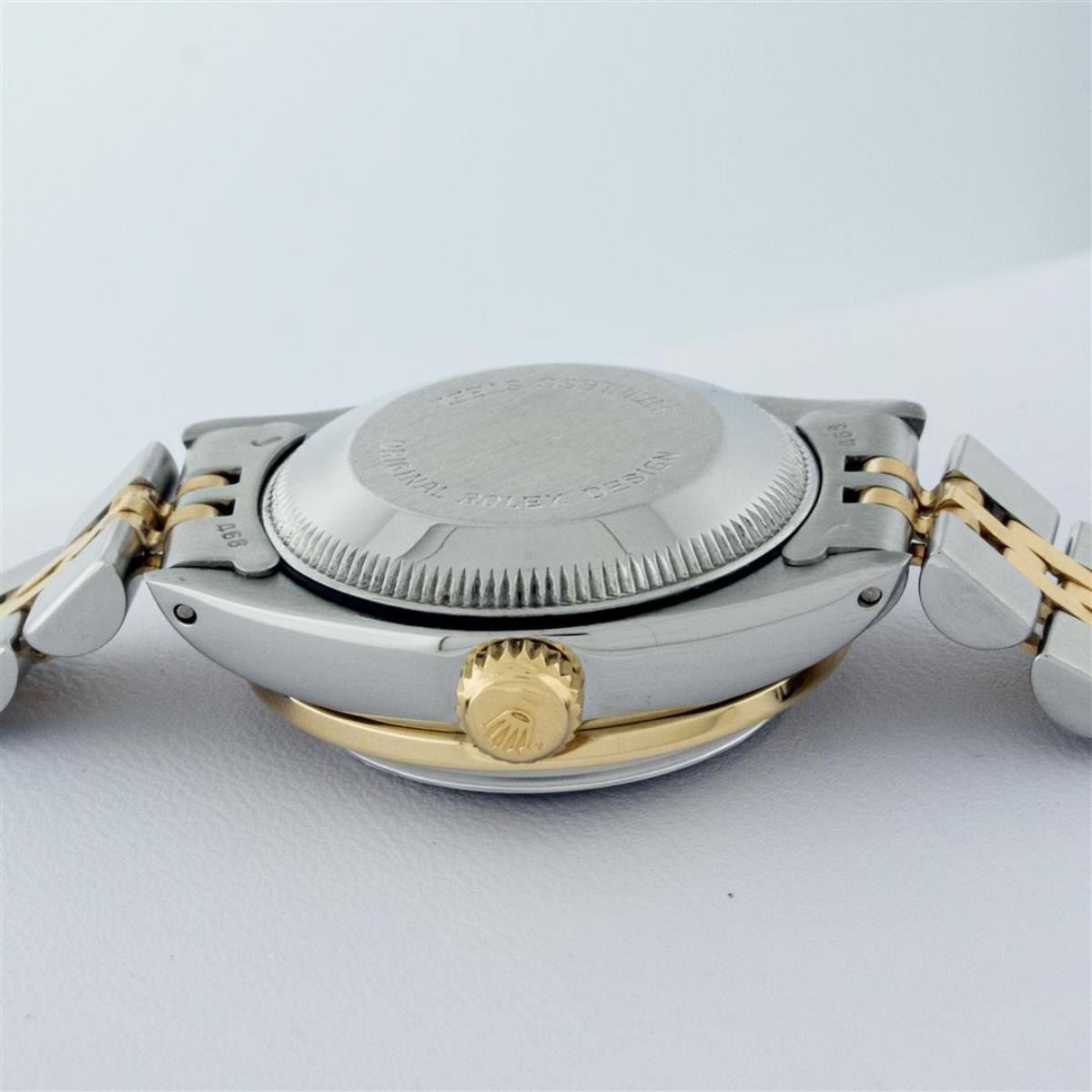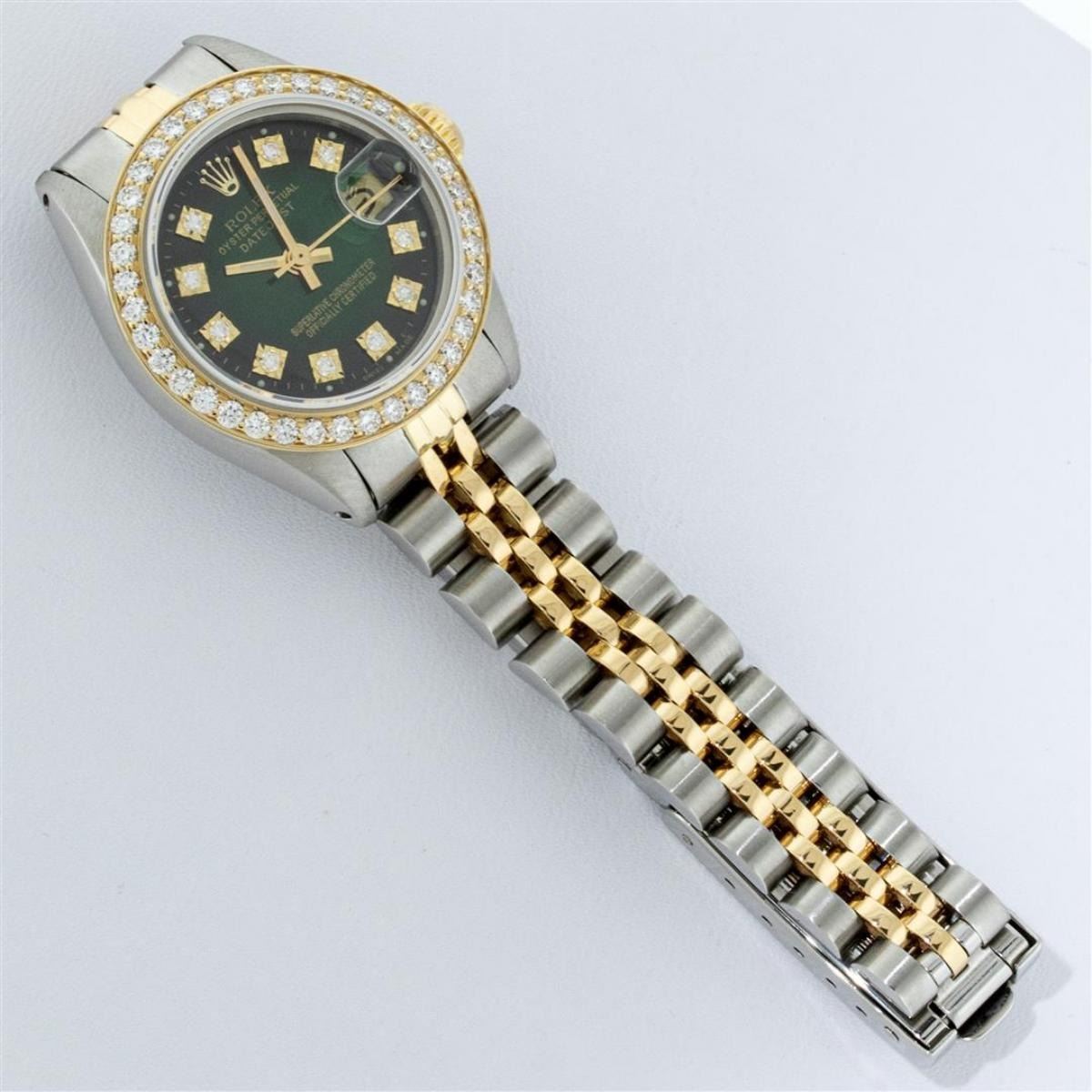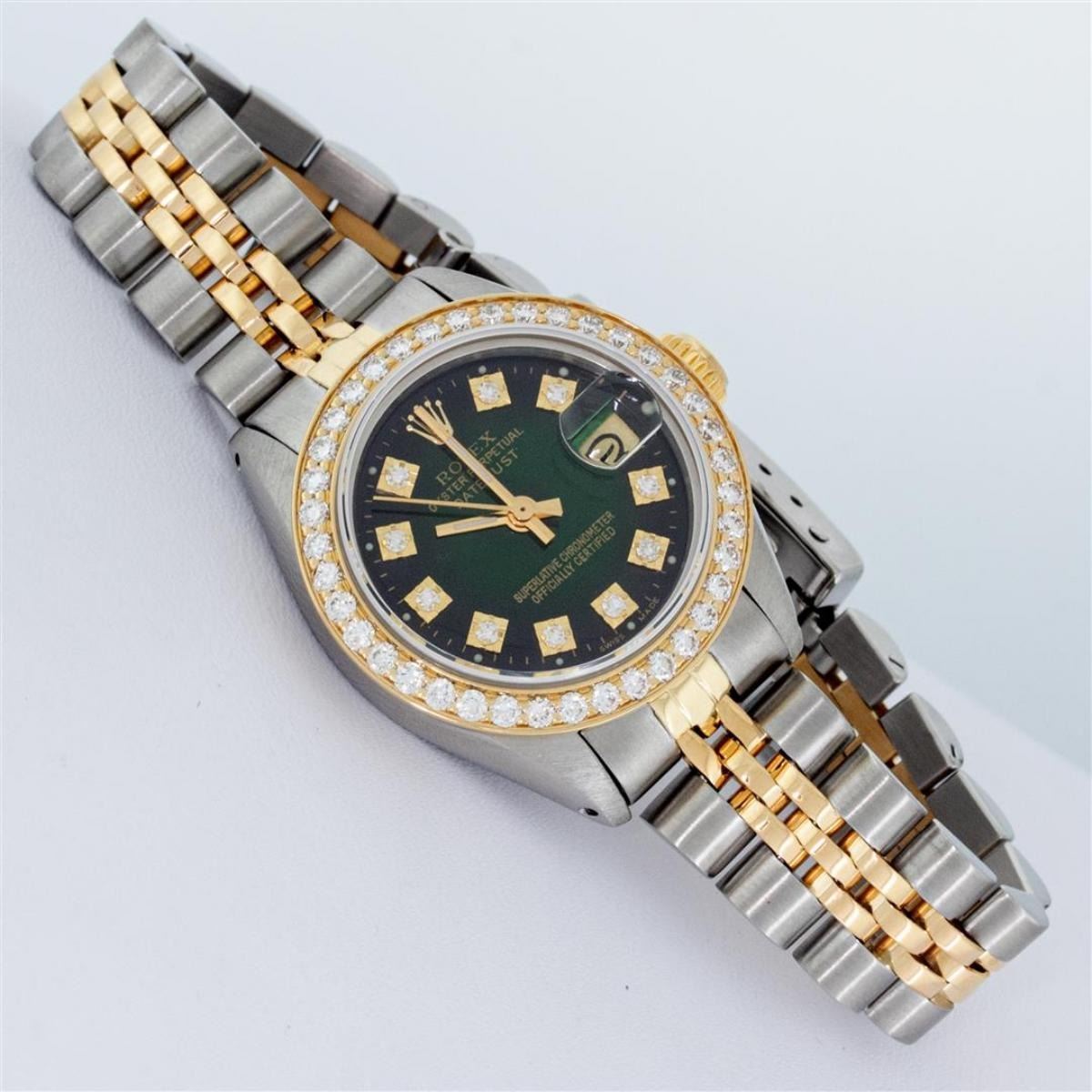 One Ladies Two Tone Rolex Oyster Perpetual Datejust Polished, Serviced & Electronically Tested, Yellow Gold & Stainless Steel Case: 26mm, Yellow Gold Crown, Custom Bezel: New 18K 1ctw Yellow Gold Beadset Diamond Bezel, Diamond Count: 42 Diamonds, Total Weight 1.00 Carat, Clarity: SI-VS, Color: G to H. Custom Crystal: New Synthetic Sapphire Cyclops Lens. Custom Hands: New Luminescent Hands. Movement: Automatic Winding Movement. Custom Dial: Green Vignette VS Diamond Dial, Diamond Count: 10 Single Cut Diamonds in Dial, G To H In Color, VS Clarity. Date Window: 3 O'Clock Position Date Display, Model: Datejust, Condition: G-6 Extra Fine. Bracelet: Two Tone Yellow Gold & Stainless Steel Jubilee. Bright Polish. 6.0 Inch Length, Adjustable. Standard Clasp, With Rolex Logo. This Watch Has Been Serviced Time Tested And Is In Excellent Condition It Is Free Of All Scratches And Dents.