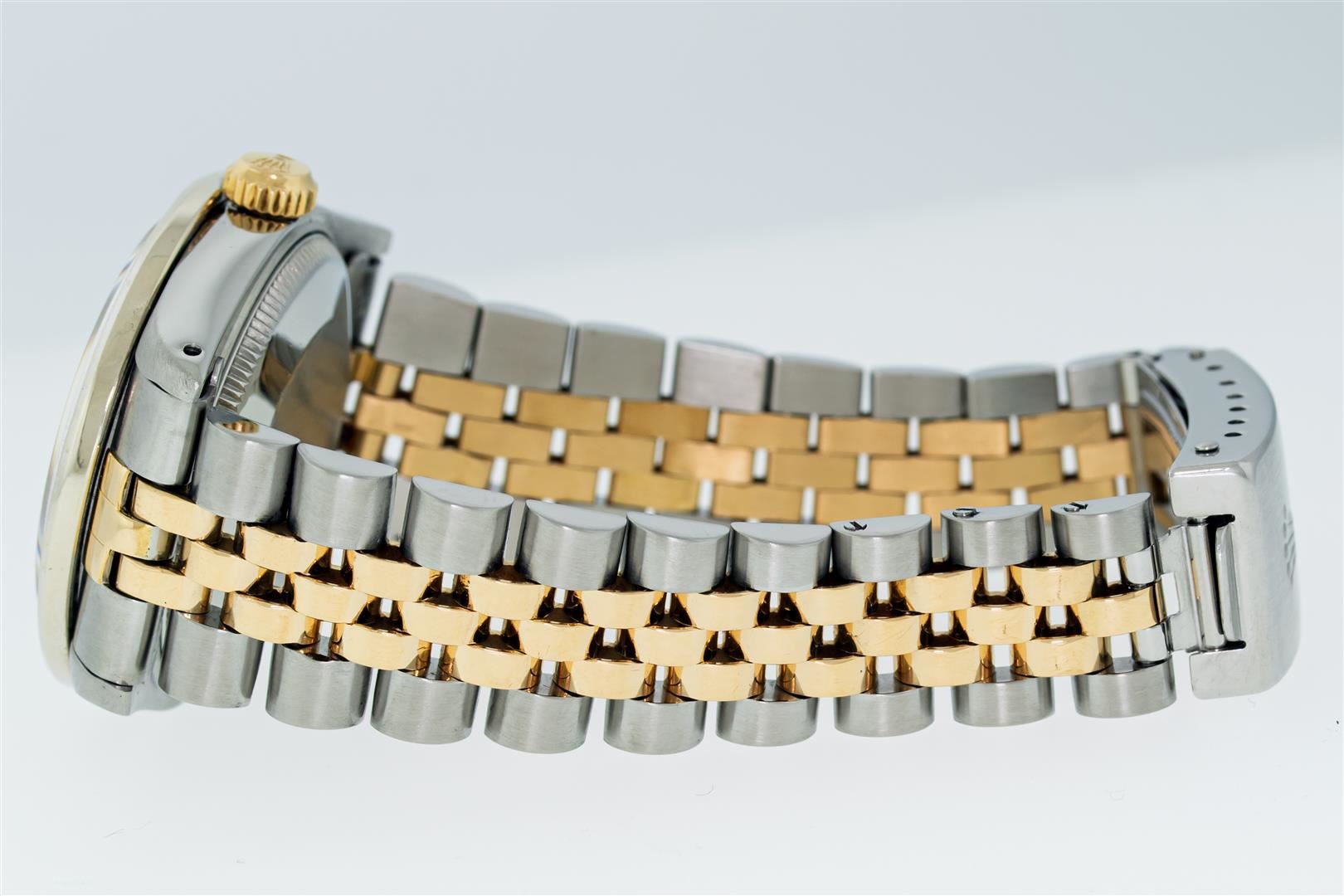 One Women's Pre Owned Midsize Stainless Steel and 18K Yellow Gold Rolex Datejust Polished, Serviced & Electronically Tested, Rolex Stainless Steel And Yellow Gold Case: 31mm, Rolex Yellow Gold Crown, Custom Bezel: White Gold Channel Set Diamond Bezel , Color: G To H, Clarity: VS2-SI1. Custom Crystal: New Sapphire With Magnified Date Window. Hands: Luminescent Hands. Rolex Movement: Automatic Winding Movement Caliber 2135. Rolex Dial: Champagne Index Dial With Lumi Dots, Date Window: 3 O'Clock Position Date Display, Quickset, Model: Midsize Datejust. Condition: G-6 Extra Fine. Rolex Bracelet: Stainless Steel and Yellow Gold Jubilee Band. Bright Polish. 6.0 Inch Length, Adjustable. Standard Clasp, With Rolex Logo. This Pre Owned Watch Has Been Serviced Time Tested And Is In Excellent Condition It Is Free Of All Scratches And Dents. This Watch Comes With A Rolex Box, Wallet, & Booklet.