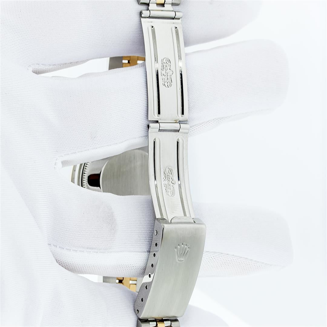 One Women's Pre Owned Midsize Stainless Steel and 18K Yellow Gold Rolex Datejust Polished, Serviced & Electronically Tested, Rolex Stainless Steel And Yellow Gold Case: 31mm, Rolex Yellow Gold Crown, Custom Bezel: White Gold Channel Set Diamond Bezel , Color: G To H, Clarity: VS2-SI1. Custom Crystal: New Sapphire With Magnified Date Window. Hands: Luminescent Hands. Rolex Movement: Automatic Winding Movement Caliber 2135. Rolex Dial: Champagne Index Dial With Lumi Dots, Date Window: 3 O'Clock Position Date Display, Quickset, Model: Midsize Datejust. Condition: G-6 Extra Fine. Rolex Bracelet: Stainless Steel and Yellow Gold Jubilee Band. Bright Polish. 6.0 Inch Length, Adjustable. Standard Clasp, With Rolex Logo. This Pre Owned Watch Has Been Serviced Time Tested And Is In Excellent Condition It Is Free Of All Scratches And Dents. This Watch Comes With A Rolex Box, Wallet, & Booklet.