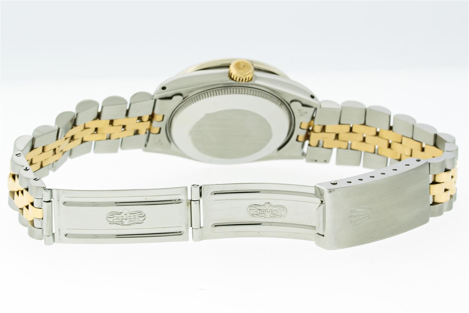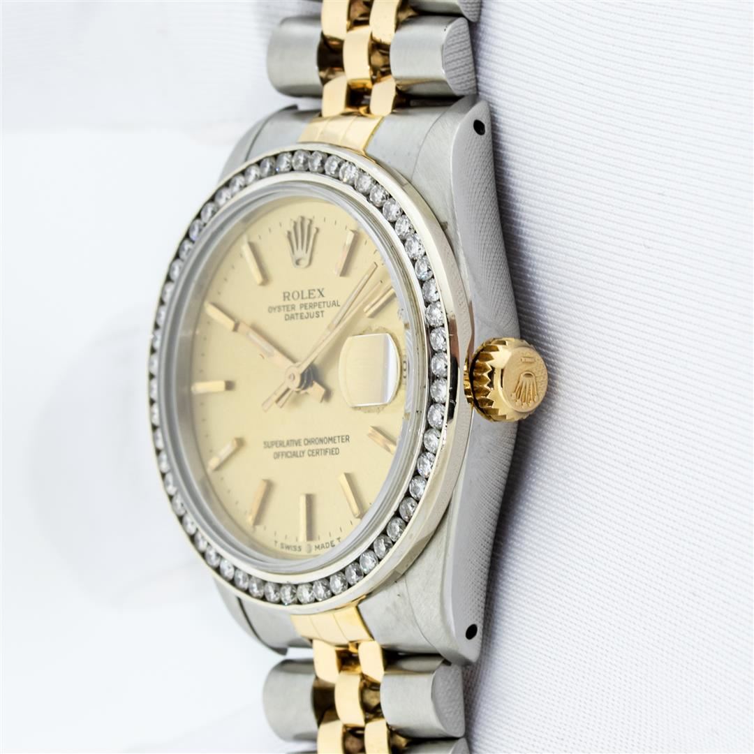 One Women's Pre Owned Midsize Stainless Steel and 18K Yellow Gold Rolex Datejust Polished, Serviced & Electronically Tested, Rolex Stainless Steel And Yellow Gold Case: 31mm, Rolex Yellow Gold Crown, Custom Bezel: White Gold Channel Set Diamond Bezel , Color: G To H, Clarity: VS2-SI1. Custom Crystal: New Sapphire With Magnified Date Window. Hands: Luminescent Hands. Rolex Movement: Automatic Winding Movement Caliber 2135. Rolex Dial: Champagne Index Dial With Lumi Dots, Date Window: 3 O'Clock Position Date Display, Quickset, Model: Midsize Datejust. Condition: G-6 Extra Fine. Rolex Bracelet: Stainless Steel and Yellow Gold Jubilee Band. Bright Polish. 6.0 Inch Length, Adjustable. Standard Clasp, With Rolex Logo. This Pre Owned Watch Has Been Serviced Time Tested And Is In Excellent Condition It Is Free Of All Scratches And Dents. This Watch Comes With A Rolex Box, Wallet, & Booklet.
