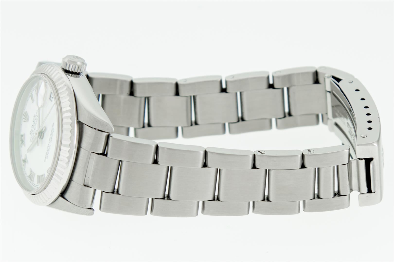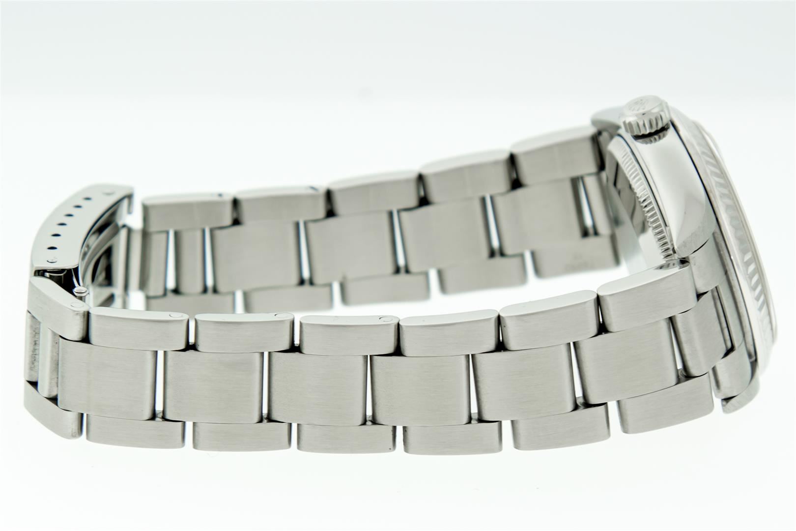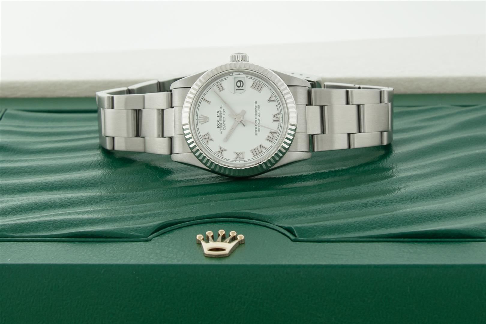 One Women's Pre Owned Midsize 31MM Stainless Steel Rolex Datejust Polished, Serviced & Electronically Tested, Rolex Stainless Steel Case Case: 31mm, Rolex Stainless Steel Crown, Rolex Bezel: 18K White Gold Fluted Bezel, Crystal: Sapphire With Cyclops Lens. Hands: Lumi Hands. Rolex Movement: Automatic Winding Movement 2235. Rolex Dial: White Roman With Index Hour Markers. Date Window: 3 O'Clock Position Date Display, Quickset, Model: Midsize Datejust. Condition: G-6 Extra Fine. Rolex Bracelet: Stainless Steel Oyster Band. Bright Polish. 6.0 Inch Length, Adjustable. Standard Clasp, With Rolex Logo. This Watch Has Been Serviced Time Tested And Is In Excellent Condition It Is Free Of All Scratches And Dents. This Watch Comes With A Rolex Box, Wallet, & Booklet.