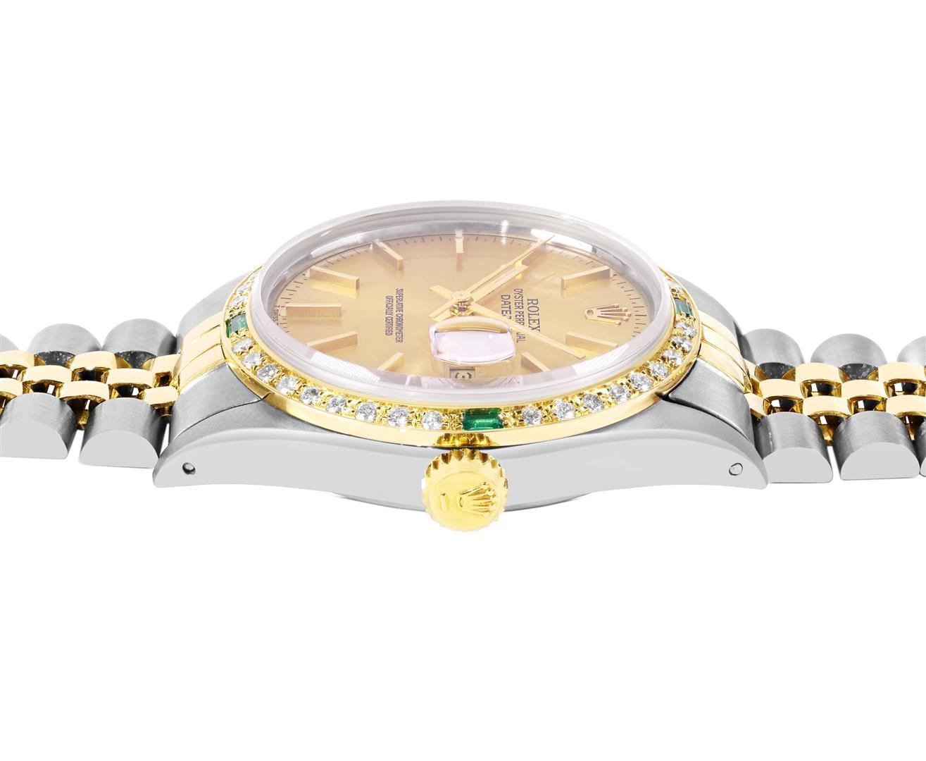 One Mens Pre Owned Two Tone Yellow Gold & Stainless Steel Rolex Datejust Polished, Serviced & Electronically Tested, Yellow Gold & Stainless Steel Case: 36mm, Rolex Yellow Gold Crown, Custom Bezel: New 18K Yellow Gold Emerald Beadset Diamond Bezel, Diamon
