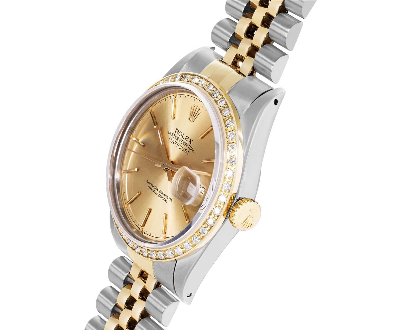 One Mens Pre Owned Yellow Gold And Steel Two Tone Rolex Datejust Polished, Serviced & Electronically Tested, Rolex Yellow Gold & Stainless Steel Case: 36mm, Rolex Yellow Gold Crown, Custom Bezel: New 18K Yellow Gold Beadset Diamond Bezel, Diamond Count: 4