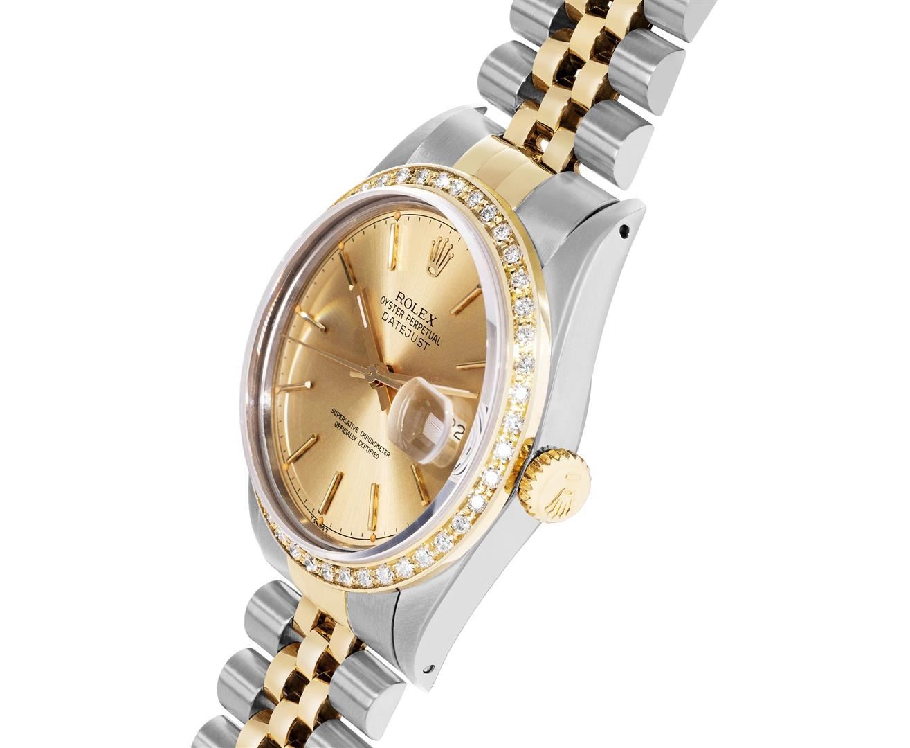 One Mens Pre Owned Yellow Gold And Steel Two Tone Rolex Datejust Polished, Serviced & Electronically Tested, Rolex Yellow Gold & Stainless Steel Case: 36mm, Rolex Yellow Gold Crown, Custom Bezel: New 18K Yellow Gold Beadset Diamond Bezel, Diamond Count: 44 Diamonds, Clarity: SI-VS, Color: G to H. Custom Crystal: New Sapphire With Magnified Date Window. Custom Hands: New Luminecent Hands. Rolex Movement: Automatic Winding Movement 3035. Rolex Dial: Champagne Dial With Index Hour Markers and Dash Track With Lumi Dots. Date Window: 3 O'Clock Position Date Display, Quickset, Model: Quickset Datejust. Condition: G-6 Extra Fine. Rolex Bracelet: Two Tone Yellow Gold & Stainless Steel Jubilee Band. Bright Polish. 7.0 Inch Length, Adjustable. Fold Clasp, With Rolex Logo. This Watch Has Been Serviced Time Tested And Is In Excellent Condition It Is Free Of All Scratches And Dents.