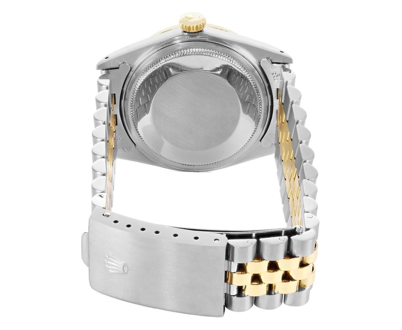 One Mens Pre Owned Yellow Gold Two Tone And Steel Rolex Datejust Polished, Serviced & Electronically Tested, Rolex Yellow Gold & Stainless Steel Case: 36mm, Rolex Yellow Gold Crown, Custom Bezel: New 18K Yellow Gold Beadset Diamond Bezel, Diamond Count: 4