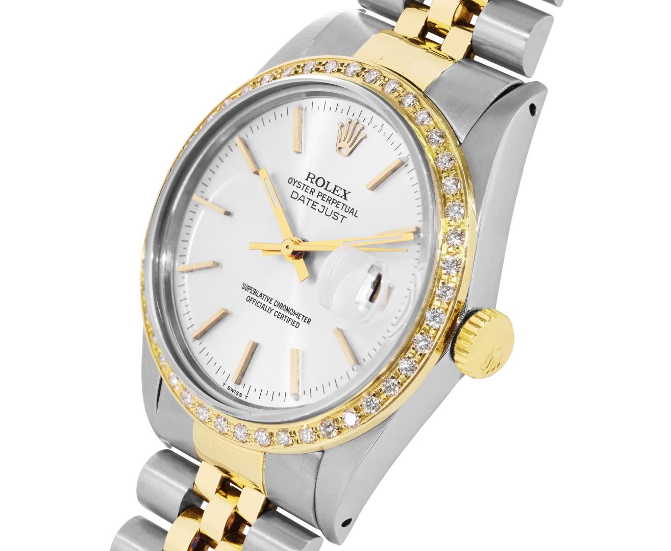 One Mens Pre Owned Yellow Gold Two Tone And Steel Rolex Datejust Polished, Serviced & Electronically Tested, Rolex Yellow Gold & Stainless Steel Case: 36mm, Rolex Yellow Gold Crown, Custom Bezel: New 18K Yellow Gold Beadset Diamond Bezel, Diamond Count: 44 Diamonds, Clarity: SI-VS, Color: G to H. Custom Crystal: New Sapphire With Magnified Date Window. Custom Hands: New Luminecent Hands. Rolex Movement: Automatic Winding Movement 3035. Rolex Dial: Silver Dial With Index Hour Markers and Dash Track With Lumi Dots. Date Window: 3 O'Clock Position Date Display, Quickset, Model: Quickset Datejust. Condition: G-6 Extra Fine. Rolex Bracelet: Two Tone Yellow Gold & Stainless Steel Jubilee Band. Bright Polish. 7.0 Inch Length, Adjustable. Standard Clasp, With Rolex Logo. This Watch Has Been Serviced Time Tested And Is In Excellent Condition It Is Free Of All Scratches And Dents. This Watch Comes With A Rolex Box.