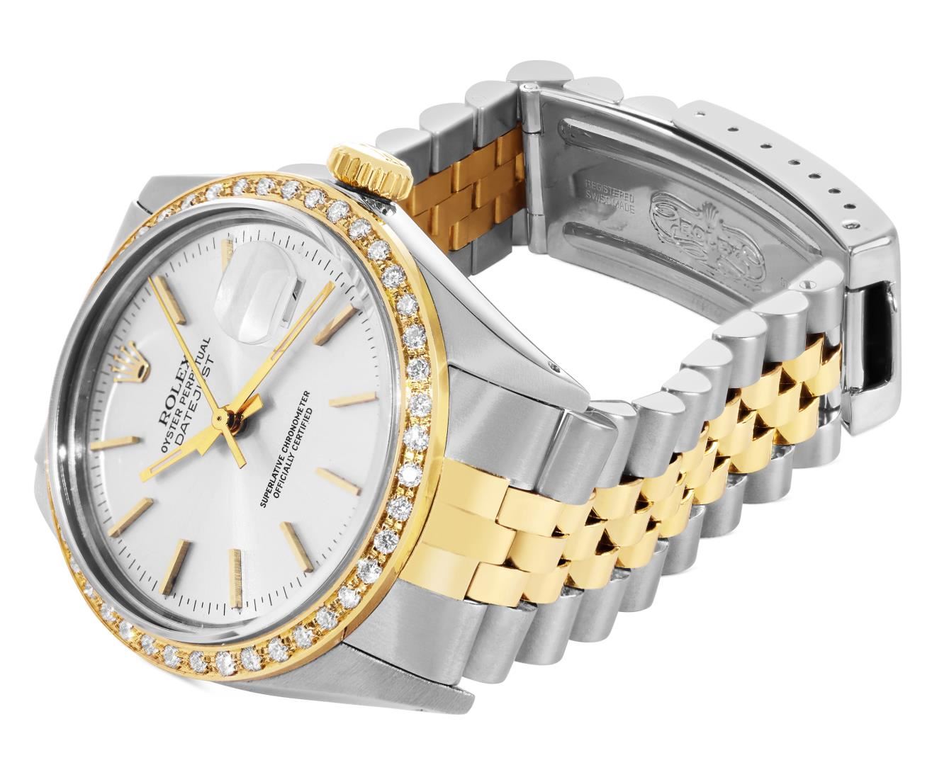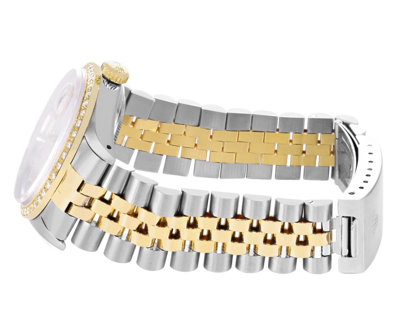 One Mens Pre Owned Yellow Gold Two Tone And Steel Rolex Datejust Polished, Serviced & Electronically Tested, Rolex Yellow Gold & Stainless Steel Case: 36mm, Rolex Yellow Gold Crown, Custom Bezel: New 18K Yellow Gold Beadset Diamond Bezel, Diamond Count: 44 Diamonds, Clarity: SI-VS, Color: G to H. Custom Crystal: New Sapphire With Magnified Date Window. Custom Hands: New Luminecent Hands. Rolex Movement: Automatic Winding Movement 3035. Rolex Dial: Silver Dial With Index Hour Markers and Dash Track With Lumi Dots. Date Window: 3 O'Clock Position Date Display, Quickset, Model: Quickset Datejust. Condition: G-6 Extra Fine. Rolex Bracelet: Two Tone Yellow Gold & Stainless Steel Jubilee Band. Bright Polish. 7.0 Inch Length, Adjustable. Standard Clasp, With Rolex Logo. This Watch Has Been Serviced Time Tested And Is In Excellent Condition It Is Free Of All Scratches And Dents. This Watch Comes With A Rolex Box.