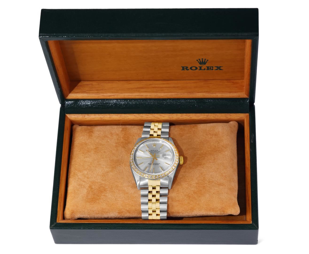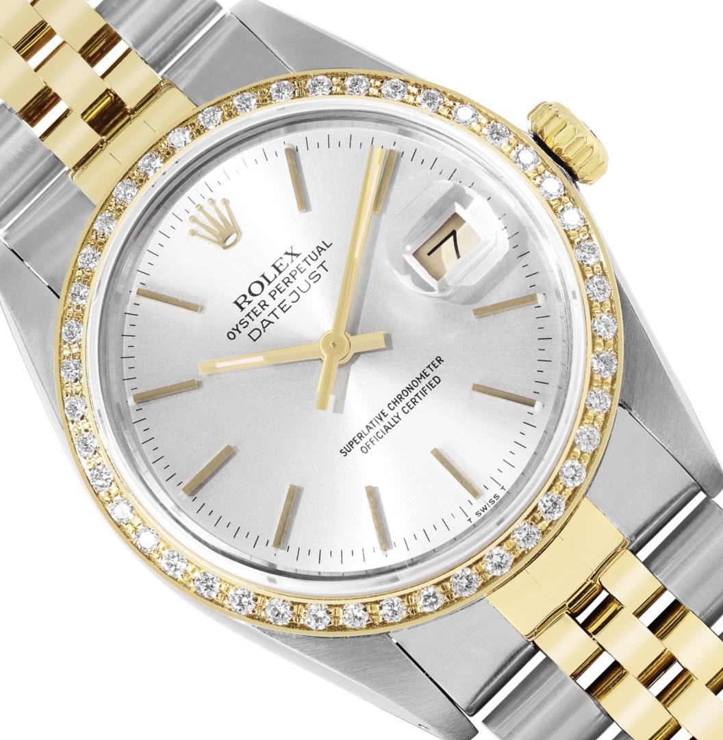 One Mens Pre Owned Yellow Gold Two Tone And Steel Rolex Datejust Polished, Serviced & Electronically Tested, Rolex Yellow Gold & Stainless Steel Case: 36mm, Rolex Yellow Gold Crown, Custom Bezel: New 18K Yellow Gold Beadset Diamond Bezel, Diamond Count: 44 Diamonds, Clarity: SI-VS, Color: G to H. Custom Crystal: New Sapphire With Magnified Date Window. Custom Hands: New Luminecent Hands. Rolex Movement: Automatic Winding Movement 3035. Rolex Dial: Silver Dial With Index Hour Markers and Dash Track With Lumi Dots. Date Window: 3 O'Clock Position Date Display, Quickset, Model: Quickset Datejust. Condition: G-6 Extra Fine. Rolex Bracelet: Two Tone Yellow Gold & Stainless Steel Jubilee Band. Bright Polish. 7.0 Inch Length, Adjustable. Standard Clasp, With Rolex Logo. This Watch Has Been Serviced Time Tested And Is In Excellent Condition It Is Free Of All Scratches And Dents. This Watch Comes With A Rolex Box.