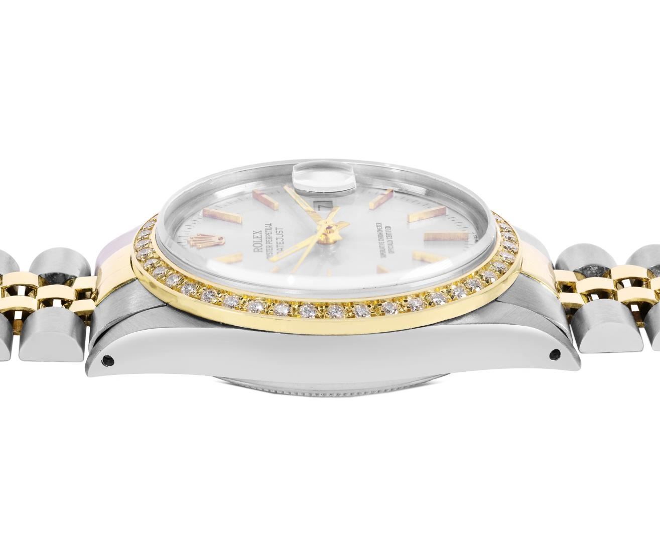 One Mens Pre Owned Yellow Gold Two Tone And Steel Rolex Datejust Polished, Serviced & Electronically Tested, Rolex Yellow Gold & Stainless Steel Case: 36mm, Rolex Yellow Gold Crown, Custom Bezel: New 18K Yellow Gold Beadset Diamond Bezel, Diamond Count: 44 Diamonds, Clarity: SI-VS, Color: G to H. Custom Crystal: New Sapphire With Magnified Date Window. Custom Hands: New Luminecent Hands. Rolex Movement: Automatic Winding Movement 3035. Rolex Dial: Silver Dial With Index Hour Markers and Dash Track With Lumi Dots. Date Window: 3 O'Clock Position Date Display, Quickset, Model: Quickset Datejust. Condition: G-6 Extra Fine. Rolex Bracelet: Two Tone Yellow Gold & Stainless Steel Jubilee Band. Bright Polish. 7.0 Inch Length, Adjustable. Standard Clasp, With Rolex Logo. This Watch Has Been Serviced Time Tested And Is In Excellent Condition It Is Free Of All Scratches And Dents. This Watch Comes With A Rolex Box.