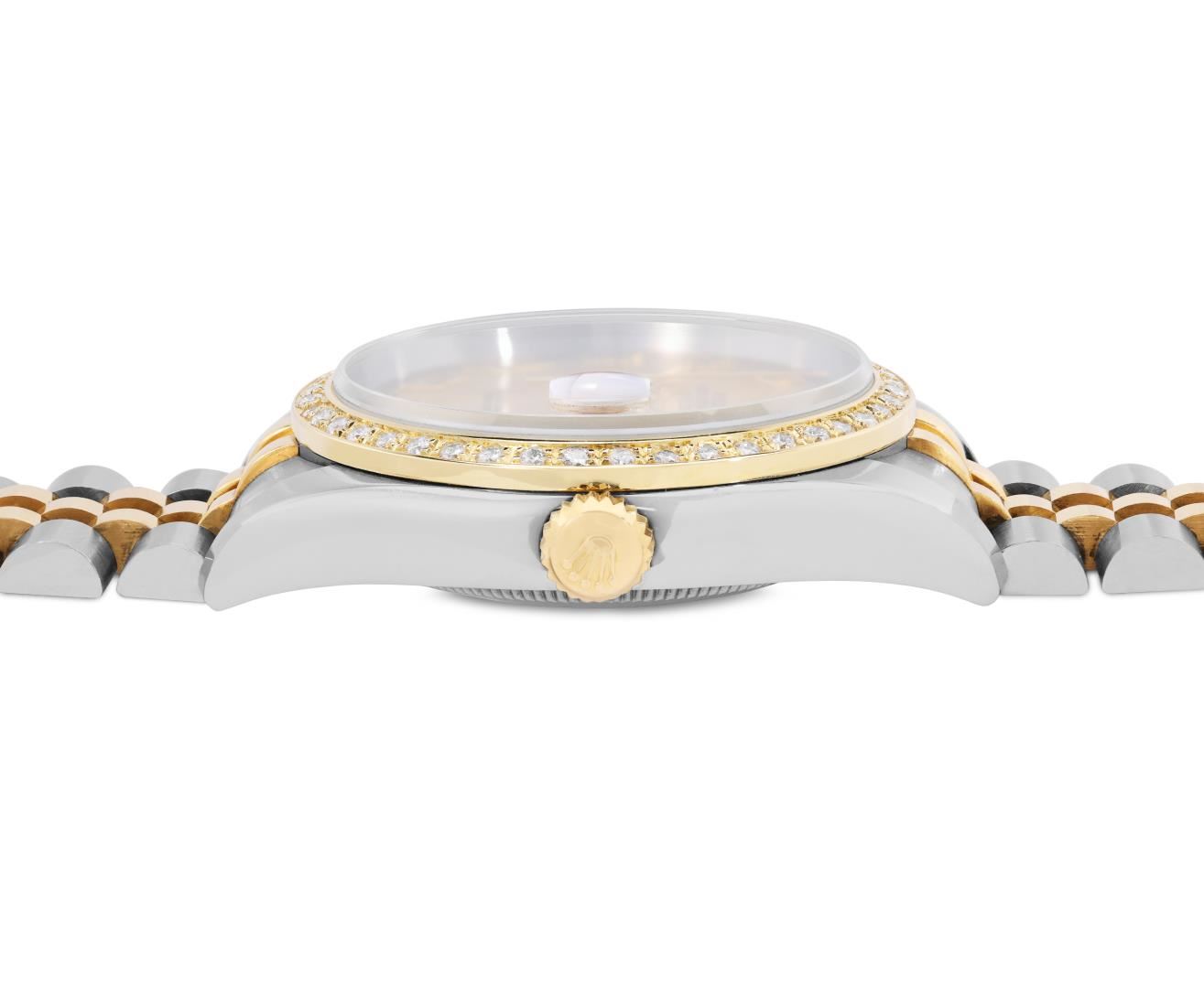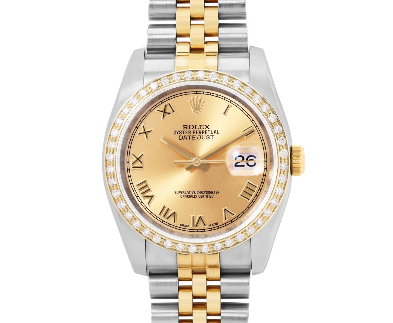 One Mens Pre Owned Quickset Sapphire 18K Yellow Gold And Stainless Steel Rolex Datejust 36MM Polished, Serviced And Electronically Tested, Rolex Yellow Gold And Stainless Steel Case: 36mm, Rolex Yellow Gold Crown, Custom Bezel: New 18K Yellow Gold Beadset Diamond Bezel, Diamond Count: 44 Diamonds. Crystal: Sapphire With Magnified Date Window. Hands: Solid Hands. Rolex Movement: Automatic Winding Movement 3135. Rolex Dial: Factory Champagne Dial With Roman Hour Markers. Date Window: 3 O'Clock Position Date Display, Quickset, Model: 116233 Datejust. Condition: G-6 Extra Fine. Rolex Bracelet: Two Tone 18K Yellow Gold And Stainless Steel Jubilee Band. Bright Polish. 7.0 Inch Length, Adjustable. Hidden Clasp, With Rolex Logo. This Watch Has Been Serviced And Polished It Is Free Of All Scratches And Dents. This Watch Comes With A Role Box.
