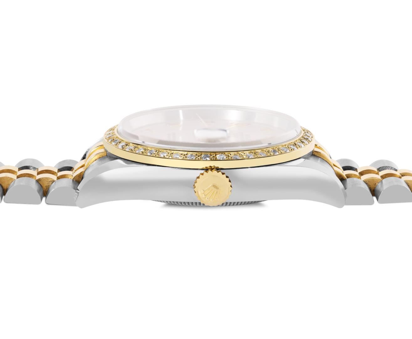 One Mens Pre Owned Quickset Sapphire 18K Yellow Gold And Stainless Steel Rolex Datejust 36MM Polished, Serviced And Electronically Tested, Rolex Yellow Gold And Stainless Steel Case: 36mm, Rolex Yellow Gold Crown, Custom Bezel: New 18K Yellow Gold Beadset Diamond Bezel, Diamond Count: 44 Diamonds. Crystal: Sapphire With Magnified Date Window. Hands: Solid Hands. Rolex Movement: Automatic Winding Movement 3135. Rolex Dial: Factory Cream Dial Arabic Hour Markers. Date Window: 3 O'Clock Position Date Display, Quickset, Model: 116233 Datejust. Condition: G-6 Extra Fine. Rolex Bracelet: Two Tone 18K Yellow Gold And Stainless Steel Jubilee Band. Bright Polish. 7.0 Inch Length, Adjustable. Hidden Clasp, With Rolex Logo. This Watch Has Been Serviced And Polished It Is Free Of All Scratches And Dents. This Watch Comes With A Role Box.