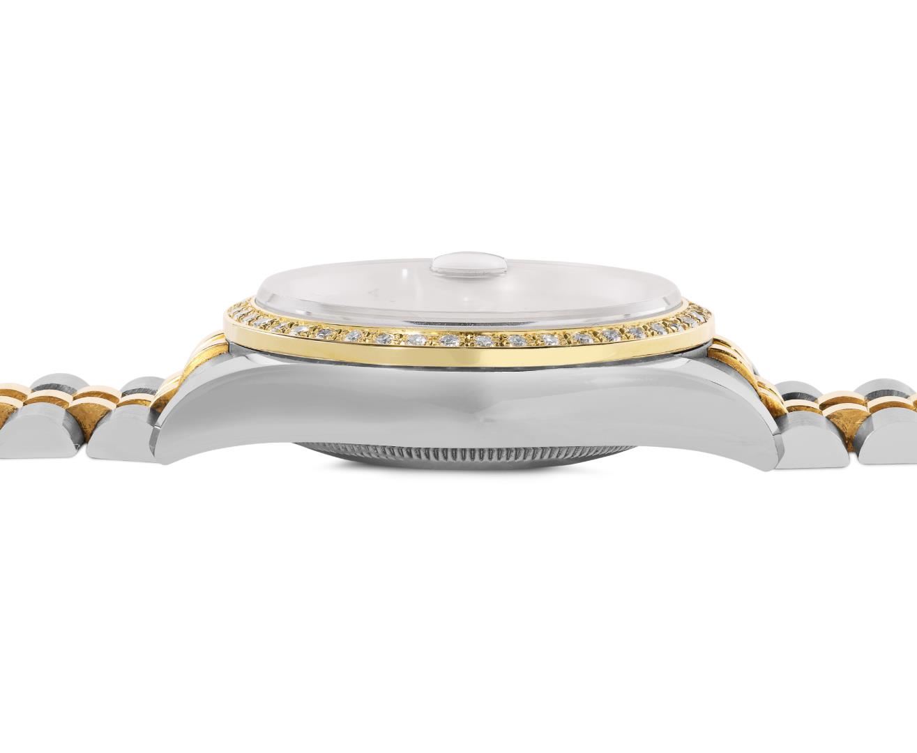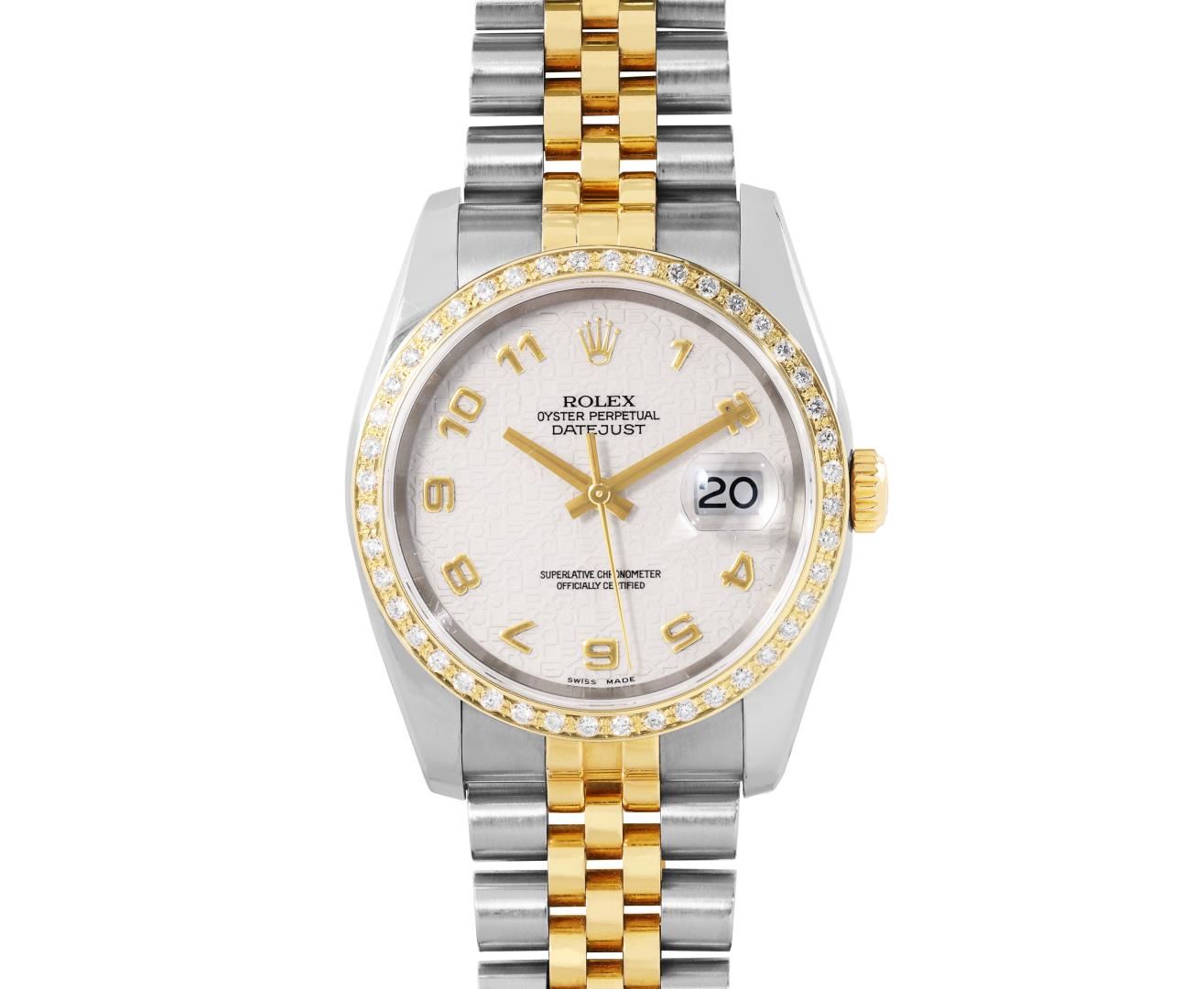 One Mens Pre Owned Quickset Sapphire 18K Yellow Gold And Stainless Steel Rolex Datejust 36MM Polished, Serviced And Electronically Tested, Rolex Yellow Gold And Stainless Steel Case: 36mm, Rolex Yellow Gold Crown, Custom Bezel: New 18K Yellow Gold Beadset Diamond Bezel, Diamond Count: 44 Diamonds. Crystal: Sapphire With Magnified Date Window. Hands: Solid Hands. Rolex Movement: Automatic Winding Movement 3135. Rolex Dial: Factory Cream Dial Arabic Hour Markers. Date Window: 3 O'Clock Position Date Display, Quickset, Model: 116233 Datejust. Condition: G-6 Extra Fine. Rolex Bracelet: Two Tone 18K Yellow Gold And Stainless Steel Jubilee Band. Bright Polish. 7.0 Inch Length, Adjustable. Hidden Clasp, With Rolex Logo. This Watch Has Been Serviced And Polished It Is Free Of All Scratches And Dents. This Watch Comes With A Role Box.