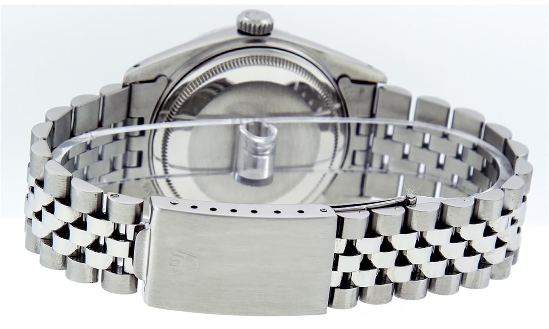 One Pre Owned Stainless Steel Rolex 36MM Datejust Polished Bright with Satin Finish, Serviced & Electronically Tested, Stainless Steel Case: 36mm, Custom Diamond Lugs: 28 Added Diamonds On Lugs. Stainless Steel Crown, Custom Bezel: New 18K White Gold Diamond + Ruby Beadset Bezel, Diamond Count: 36 Diamonds + 4 Rubies. Custom Crystal: New Sapphire With Magnified Date Window. Custom Hands: New Luminescent Hands. Rolex Movement: Automatic Winding Movement 3035. Custom Dial: Custom White Dial With Added Diamond Hour Markers. Date Window: 3 O'Clock Position Date Display, Quickset, Model: Datejust Condition: G-6 Extra Fine. Rolex Bracelet: Stainless Steel Jubilee Band. Bright Polish & Satin Finish. 7.0 Inch Length, Adjustable. Fold Clasp, With Rolex Logo. This Watch Has Been Serviced And Polished And Its Free Of All Dents And Scratches.