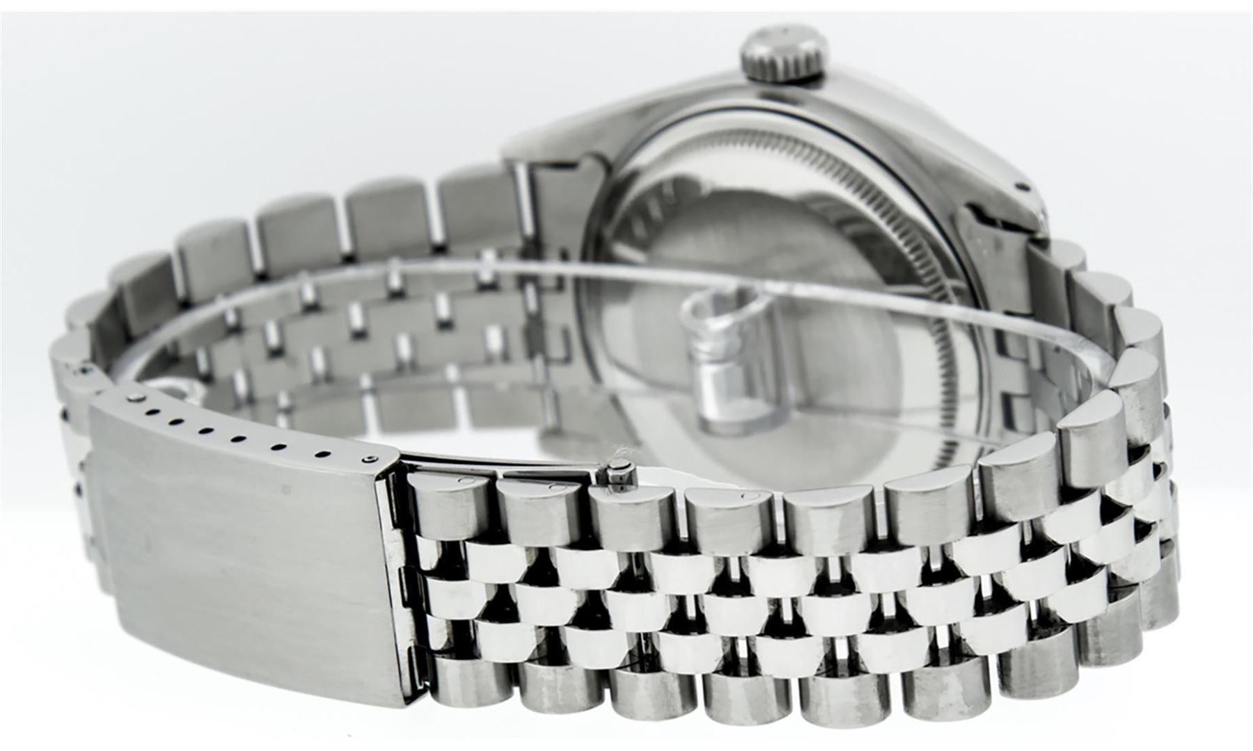 One Pre Owned Stainless Steel Rolex 36MM Datejust Polished Bright with Satin Finish, Serviced & Electronically Tested, Stainless Steel Case: 36mm, Custom Diamond Lugs: 28 Added Diamonds On Lugs. Stainless Steel Crown, Custom Bezel: New 18K White Gold Diamond + Ruby Beadset Bezel, Diamond Count: 36 Diamonds + 4 Rubies. Custom Crystal: New Sapphire With Magnified Date Window. Custom Hands: New Luminescent Hands. Rolex Movement: Automatic Winding Movement 3035. Custom Dial: Custom White Dial With Added Diamond Hour Markers. Date Window: 3 O'Clock Position Date Display, Quickset, Model: Datejust Condition: G-6 Extra Fine. Rolex Bracelet: Stainless Steel Jubilee Band. Bright Polish & Satin Finish. 7.0 Inch Length, Adjustable. Fold Clasp, With Rolex Logo. This Watch Has Been Serviced And Polished And Its Free Of All Dents And Scratches.