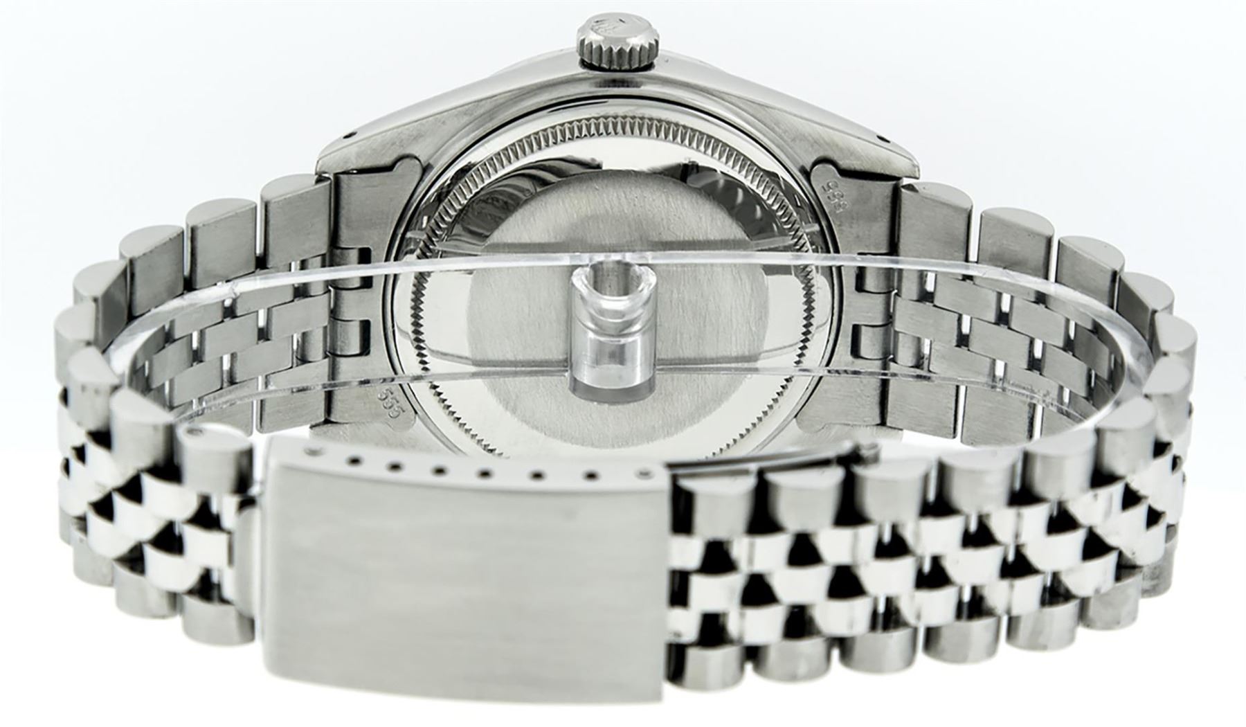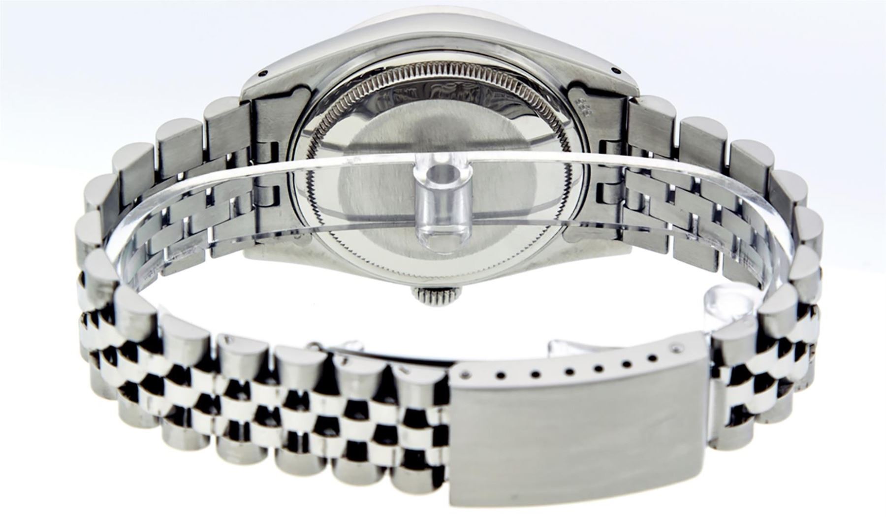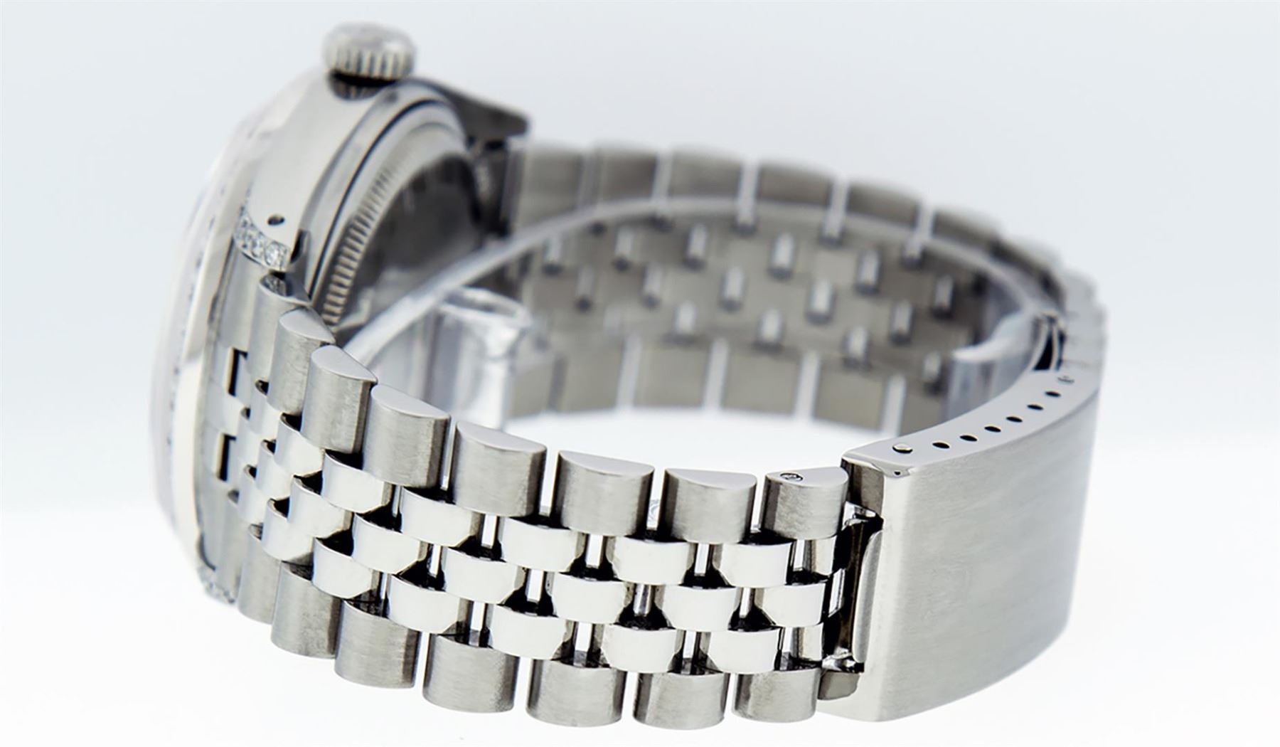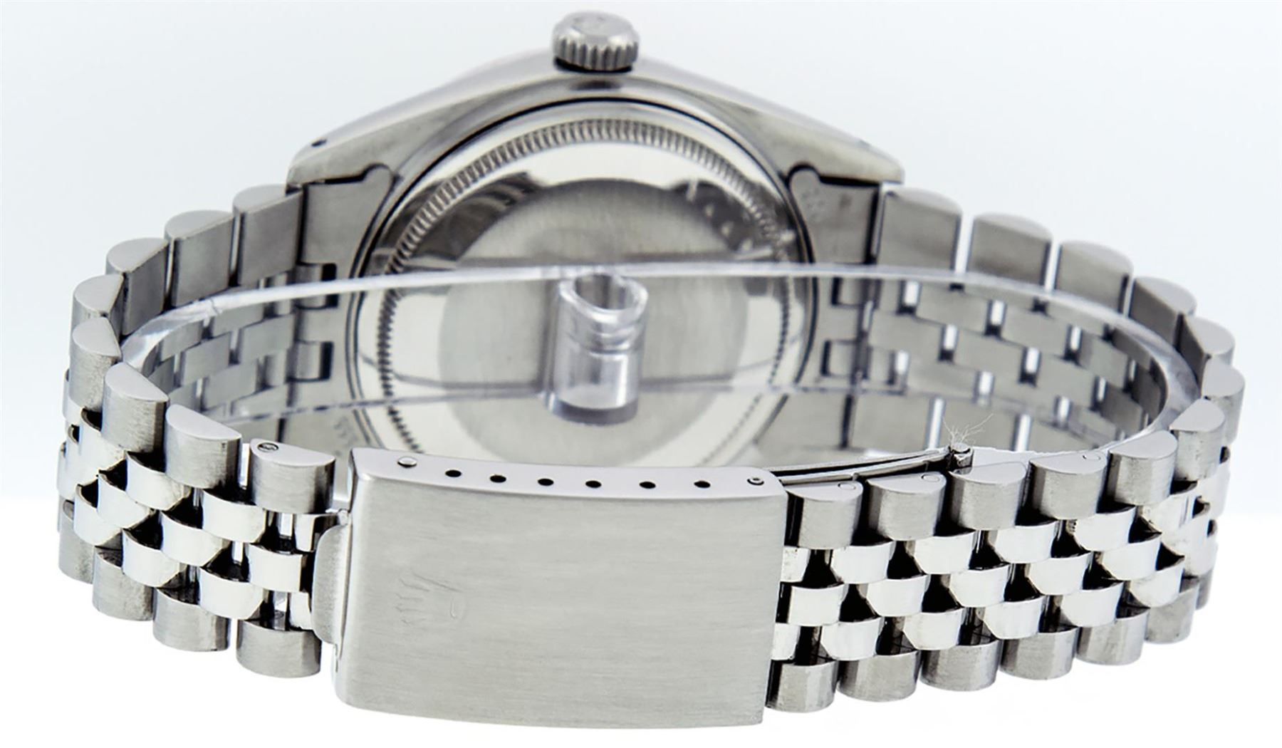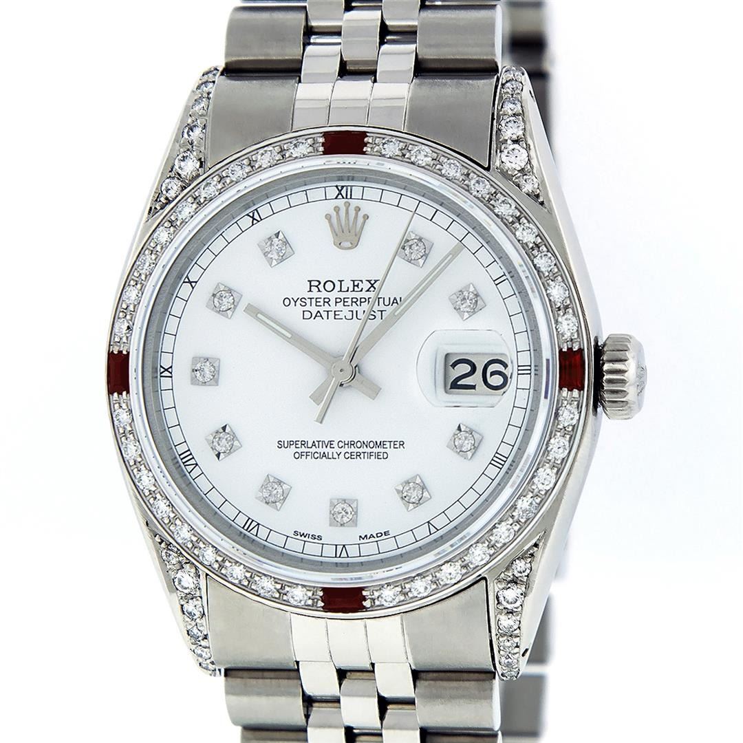 One Pre Owned Stainless Steel Rolex 36MM Datejust Polished Bright with Satin Finish, Serviced & Electronically Tested, Stainless Steel Case: 36mm, Custom Diamond Lugs: 28 Added Diamonds On Lugs. Stainless Steel Crown, Custom Bezel: New 18K White Gold Diamond + Ruby Beadset Bezel, Diamond Count: 36 Diamonds + 4 Rubies. Custom Crystal: New Sapphire With Magnified Date Window. Custom Hands: New Luminescent Hands. Rolex Movement: Automatic Winding Movement 3035. Custom Dial: Custom White Dial With Added Diamond Hour Markers. Date Window: 3 O'Clock Position Date Display, Quickset, Model: Datejust Condition: G-6 Extra Fine. Rolex Bracelet: Stainless Steel Jubilee Band. Bright Polish & Satin Finish. 7.0 Inch Length, Adjustable. Fold Clasp, With Rolex Logo. This Watch Has Been Serviced And Polished And Its Free Of All Dents And Scratches.
