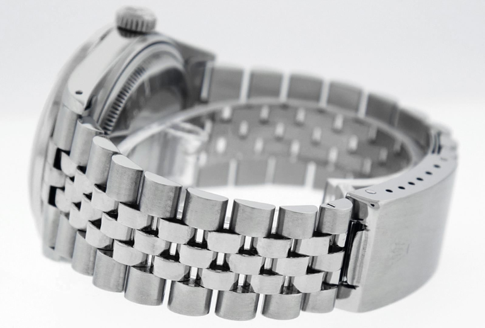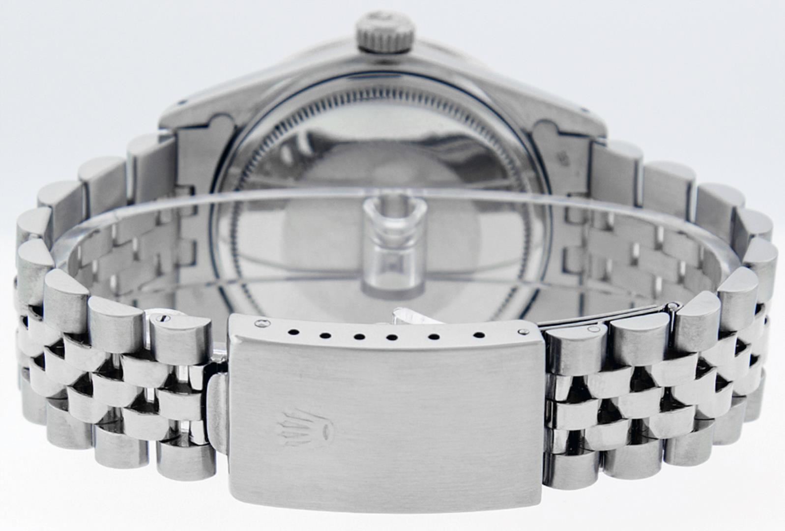 One Pre Owned Stainless Steel 36MM Rolex Datejust Polished, Serviced And Electronically Tested, Rolex Stainless Steel Case: 36mm, Rolex Stainless Steel Crown, Custom Bezel: New 18K White Gold Emerald Beadset Diamond Bezel, Diamond + Gem Count: 36 Diamonds
