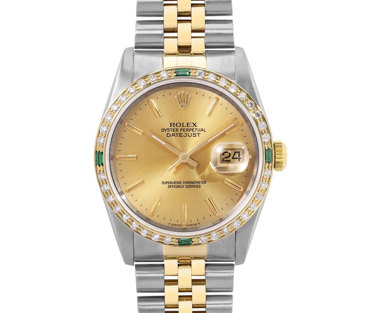 One Mens Pre Owned Quickset Sapphire Two Tone 18K Yellow Gold And Stainless Steel Rolex Datejust Polished, Serviced and Electronically Tested, Yellow Gold And Stainless Steel Case: 36mm, Rolex Yellow Gold Crown, Custom Bezel: New 18K Yellow Gold Emerald Beadset Diamond Bezel, Diamond Count: 36 Diamonds + 4 Emeralds. Custom Crystal: New Sapphire With Magnified Date Window. Custom Hands: New Lumi Hands. Rolex Movement: Automatic Winding Movement 3135. Rolex Factory Dial: Champagne Index Dial With Dash Track And Lumi Dots. Date Window: 3 O'Clock Position Date Display, Quickset, Model: Quickset Datejust. Condition: G-6 Extra Fine. Rolex Bracelet: Two Tone Yellow Gold And Stainless Steel Jubilee Band. Bright Polish. 7.0 Inch Length, Adjustable. Fold Clasp, With Rolex Logo. This Watch Has Been Serviced Time Tested And Is In Excellent Condition It Is Free Of All Scratches And Dents. This Watch Comes With A Rolex Box.