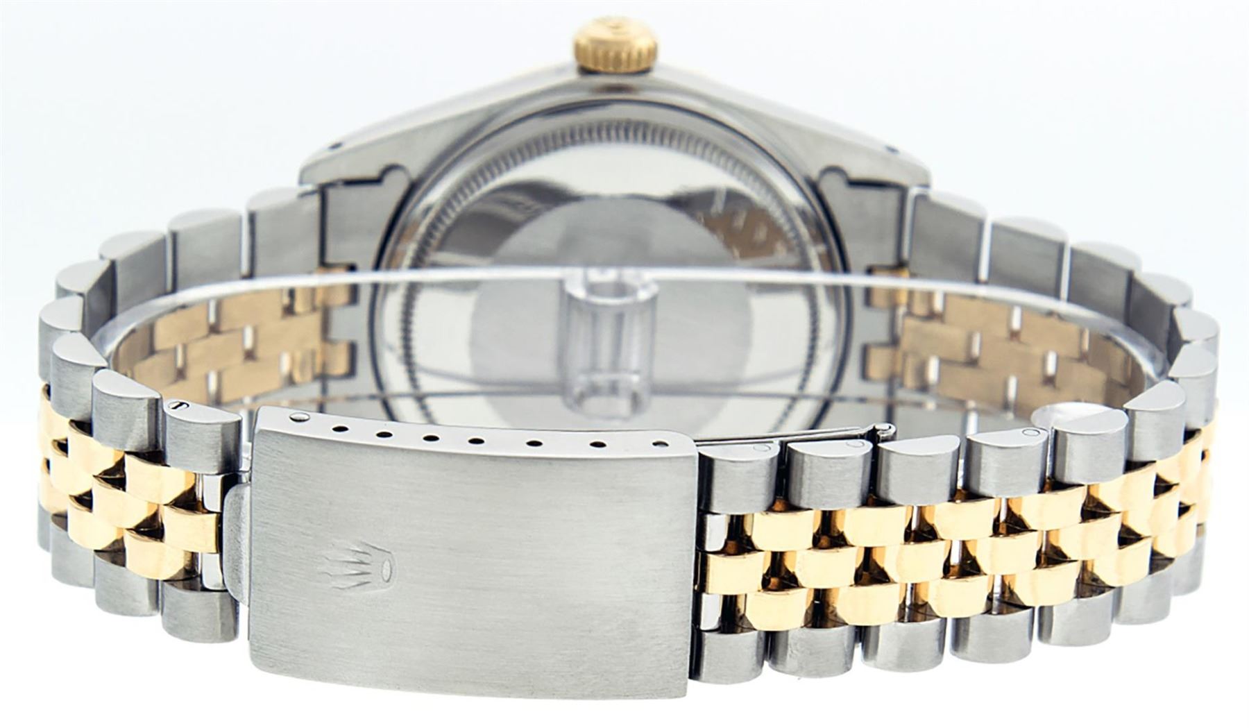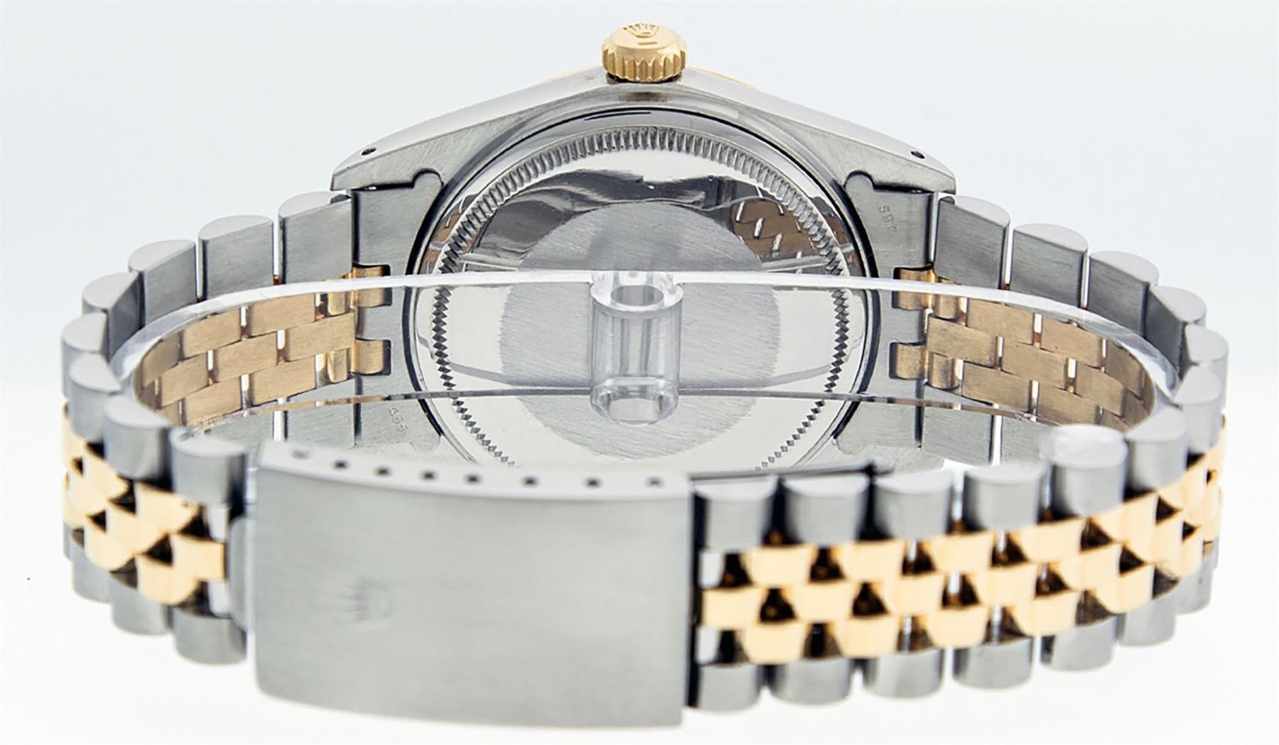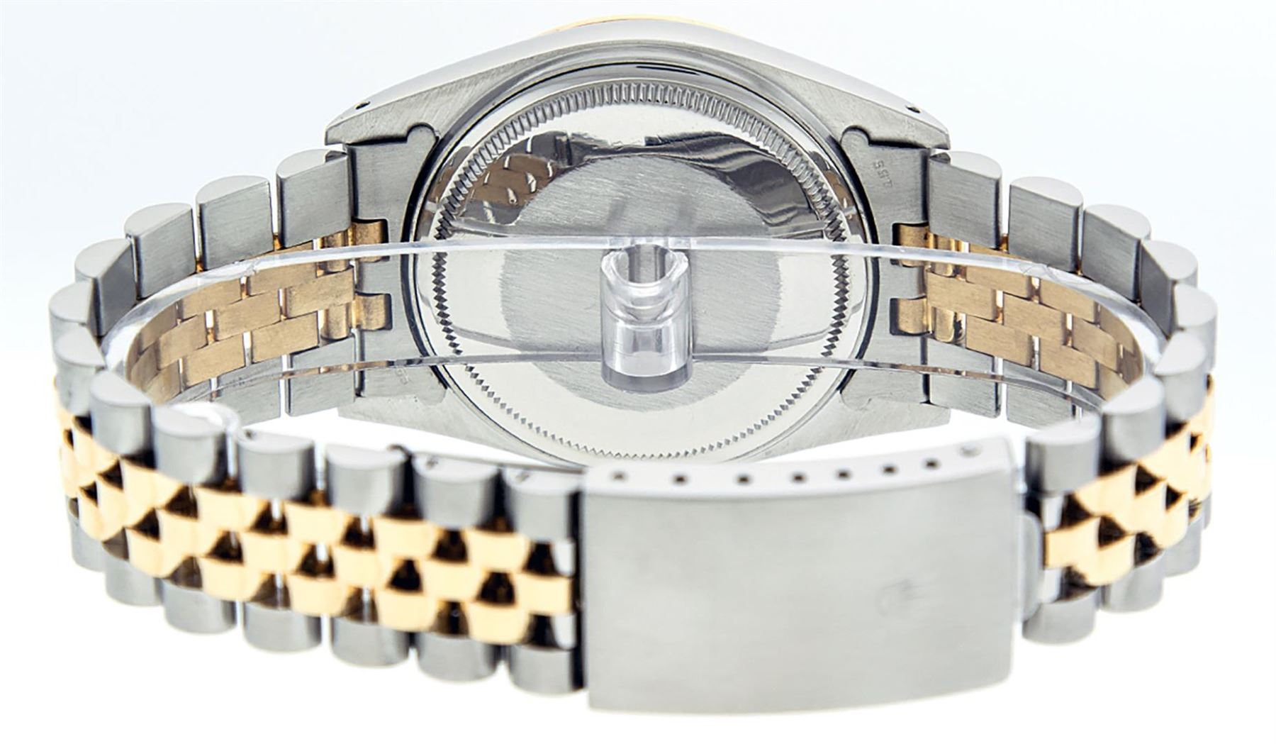 One Mens Pre Owned Rolex Yellow Gold And Stainless Steel Two Tone Rolex Datejust Polished, Serviced & Electronically Tested, Rolex Yellow Gold & Stainless Steel Case: 36mm, Rolex Yellow Gold Crown, Rolex Bezel: Yellow Gold Fluted Bezel. Custom Crystal: New Acrylic With Magnified Date Window. Custom Hands: New Luminescent Hands. Rolex Movement: Automatic Winding Movement 3035. Custom Dial: Custom Champagne Dial With Added Diamonds, Diamond Count: 8 Diamonds + 2 Baguette Diamonds in Dial. Date Window: 3 O'Clock Position Date Display, Quickset, Model: Datejust, Condition: G-6 Extra Fine. Rolex Bracelet: Two Tone Yellow Gold & Stainless Steel Jubilee Band. Bright Polish. 7.0 Inch Length, Adjustable. Standard Clasp, With Rolex Logo. This Watch Has Been Serviced And Polished It Is Free Of All Scratches And Dents.