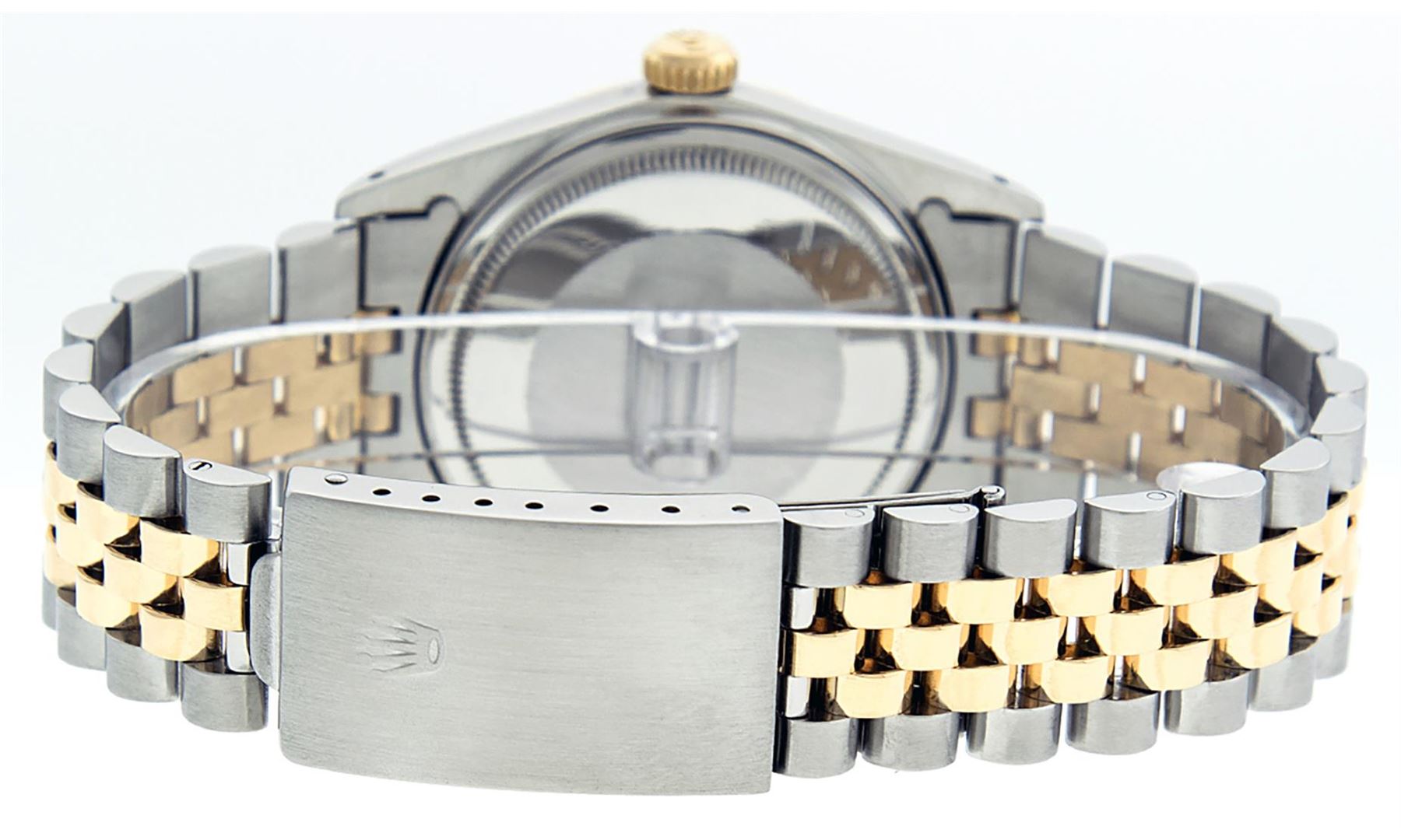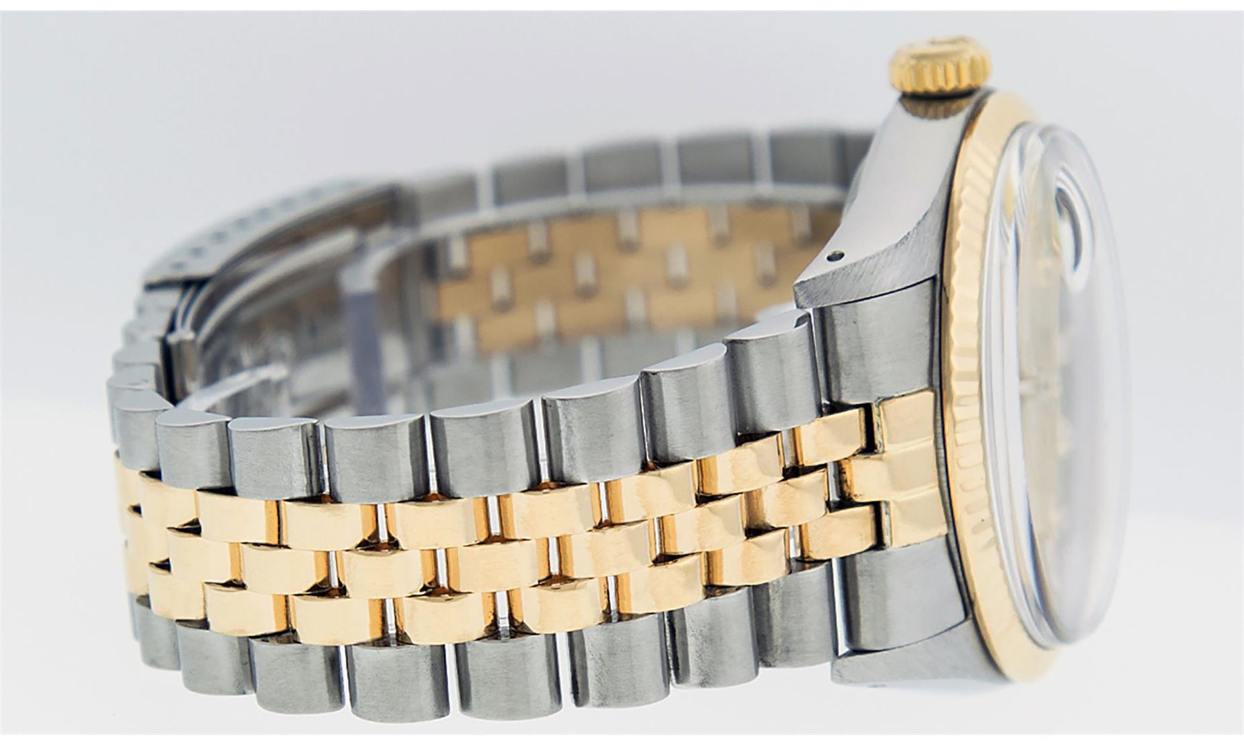 One Mens Pre Owned Rolex Yellow Gold And Stainless Steel Two Tone Rolex Datejust Polished, Serviced & Electronically Tested, Rolex Yellow Gold & Stainless Steel Case: 36mm, Rolex Yellow Gold Crown, Rolex Bezel: Yellow Gold Fluted Bezel. Custom Crystal: New Acrylic With Magnified Date Window. Custom Hands: New Luminescent Hands. Rolex Movement: Automatic Winding Movement 3035. Custom Dial: Custom Champagne Dial With Added Diamonds, Diamond Count: 8 Diamonds + 2 Baguette Diamonds in Dial. Date Window: 3 O'Clock Position Date Display, Quickset, Model: Datejust, Condition: G-6 Extra Fine. Rolex Bracelet: Two Tone Yellow Gold & Stainless Steel Jubilee Band. Bright Polish. 7.0 Inch Length, Adjustable. Standard Clasp, With Rolex Logo. This Watch Has Been Serviced And Polished It Is Free Of All Scratches And Dents.