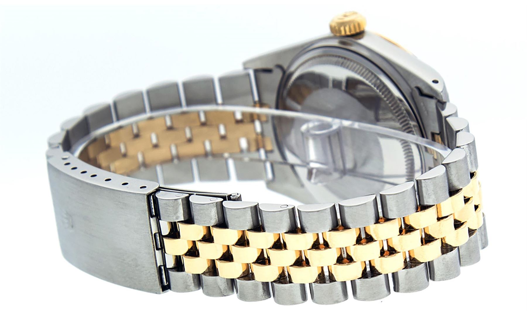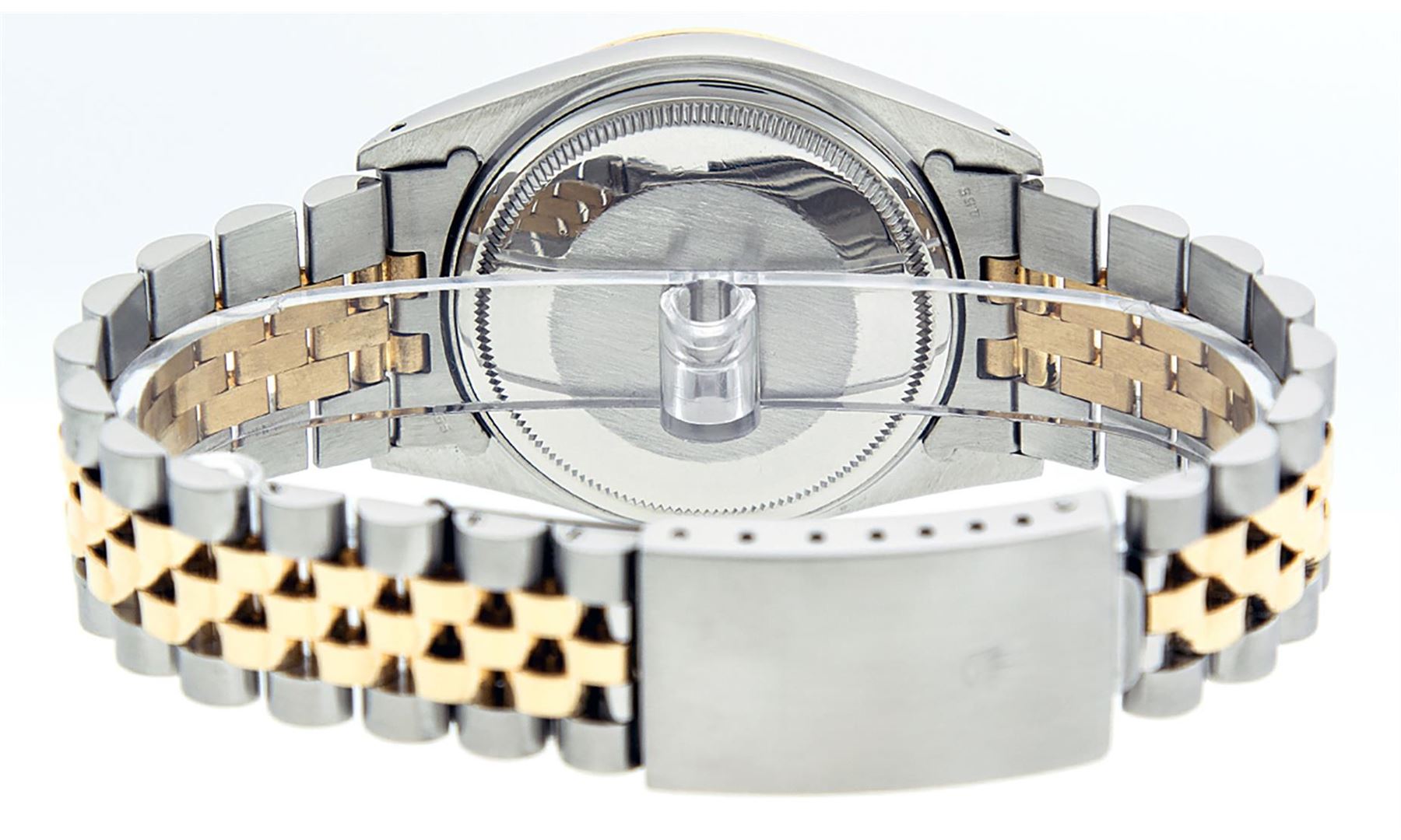 One Mens Pre Owned Rolex Yellow Gold And Stainless Steel Two Tone Rolex Datejust Polished, Serviced & Electronically Tested, Rolex Yellow Gold & Stainless Steel Case: 36mm, Rolex Yellow Gold Crown, Rolex Bezel: Yellow Gold Fluted Bezel. Custom Crystal: New Acrylic With Magnified Date Window. Custom Hands: New Luminescent Hands. Rolex Movement: Automatic Winding Movement 3035. Custom Dial: Custom Champagne Dial With Added Diamonds, Diamond Count: 8 Diamonds + 2 Baguette Diamonds in Dial. Date Window: 3 O'Clock Position Date Display, Quickset, Model: Datejust, Condition: G-6 Extra Fine. Rolex Bracelet: Two Tone Yellow Gold & Stainless Steel Jubilee Band. Bright Polish. 7.0 Inch Length, Adjustable. Standard Clasp, With Rolex Logo. This Watch Has Been Serviced And Polished It Is Free Of All Scratches And Dents.
