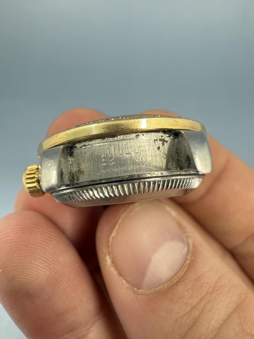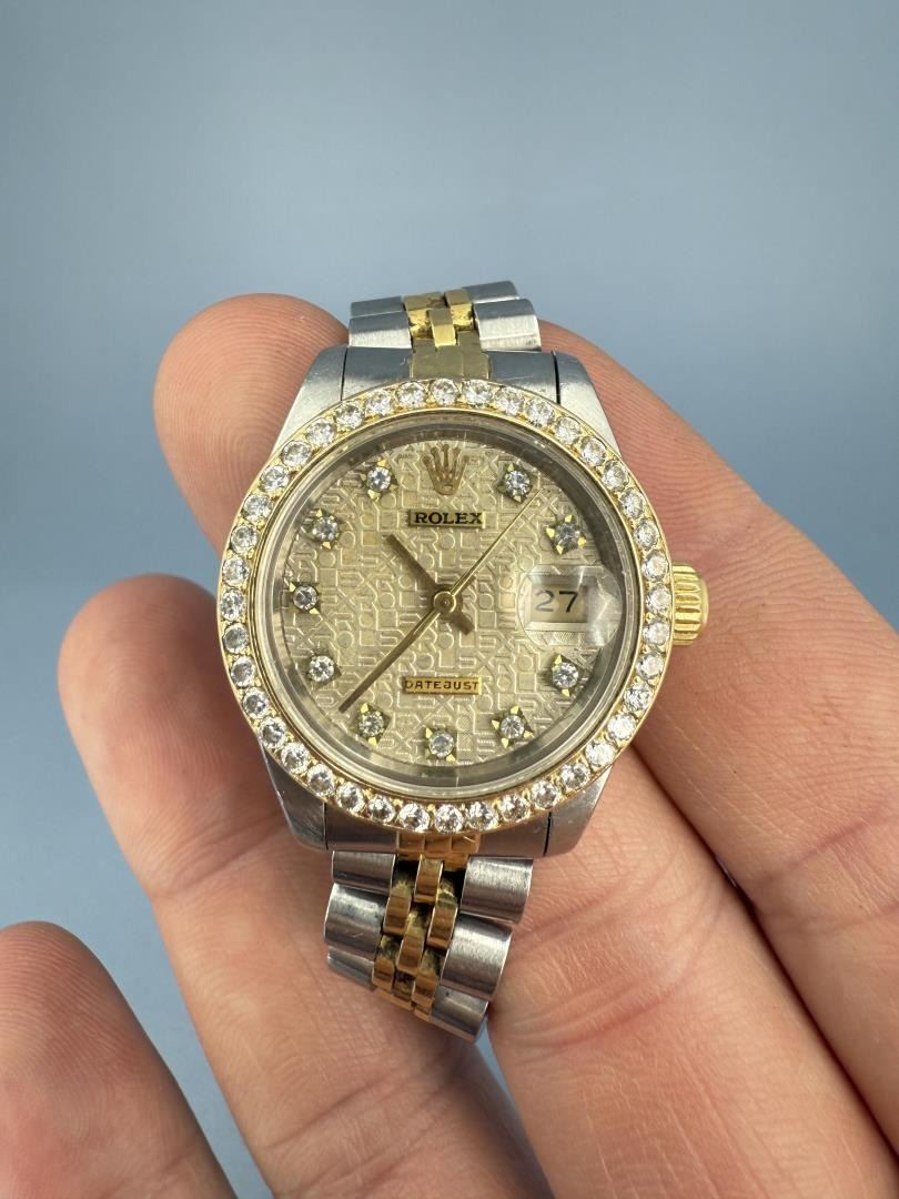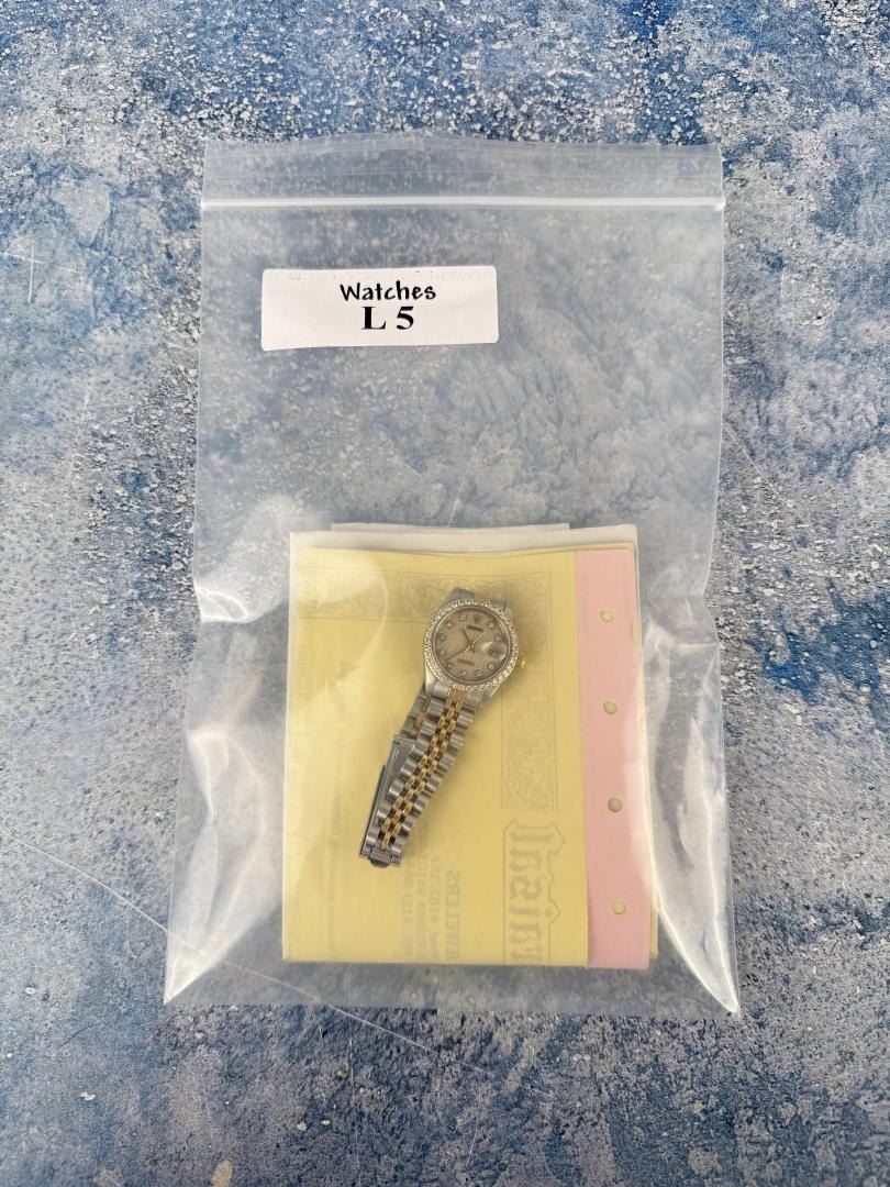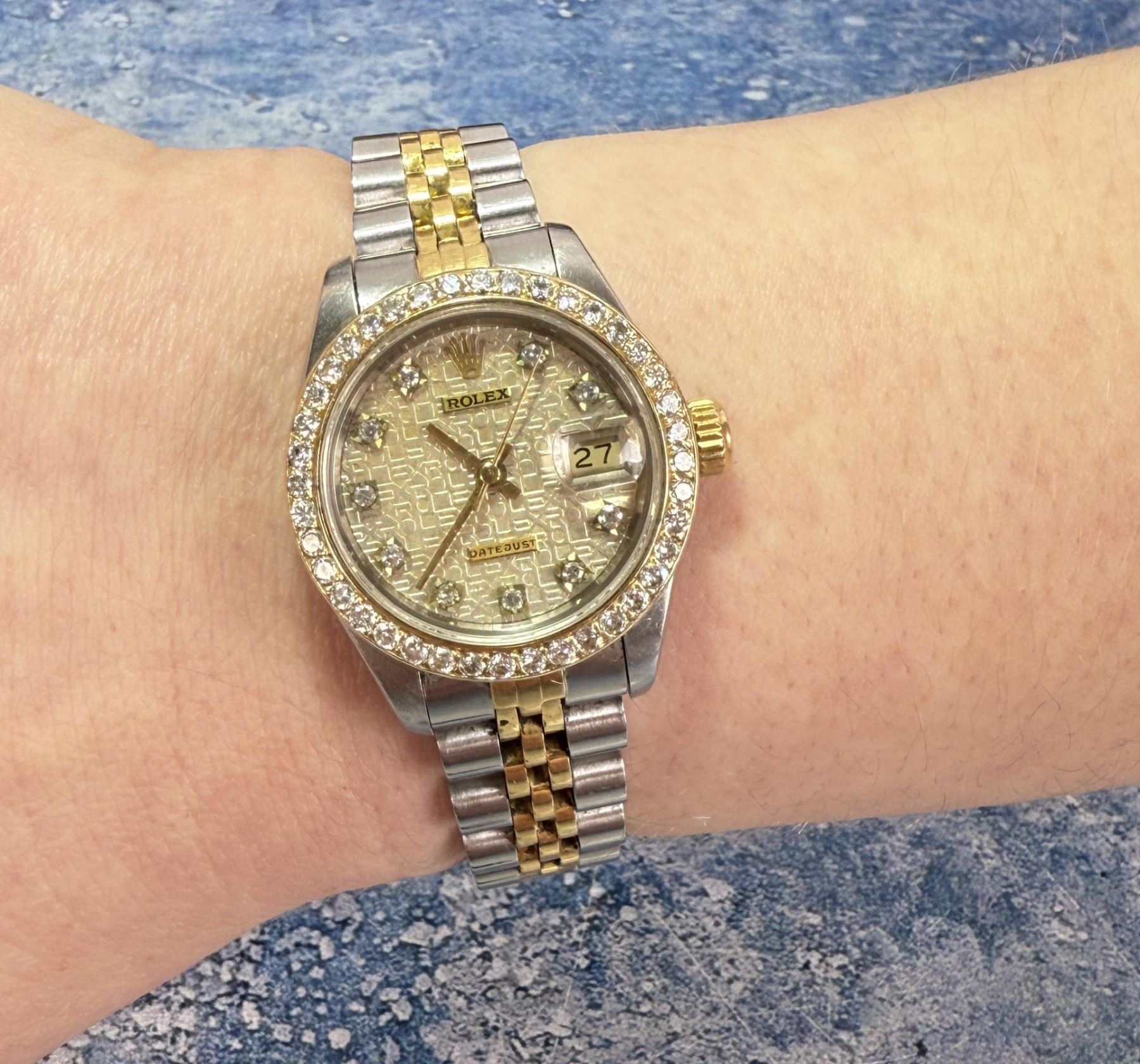 Ladies Size. 69173 reference. Two Tone 18k Gold Stainless Jubilee Band. Factory Champagne Computer Dial with Diamond Indicators. Factory Diamond Bezel. Comes with original purchase papers, no box or card. Watch is currently not running and in need of repair/service. Sold as-is. This lot requires payment via non credit card.