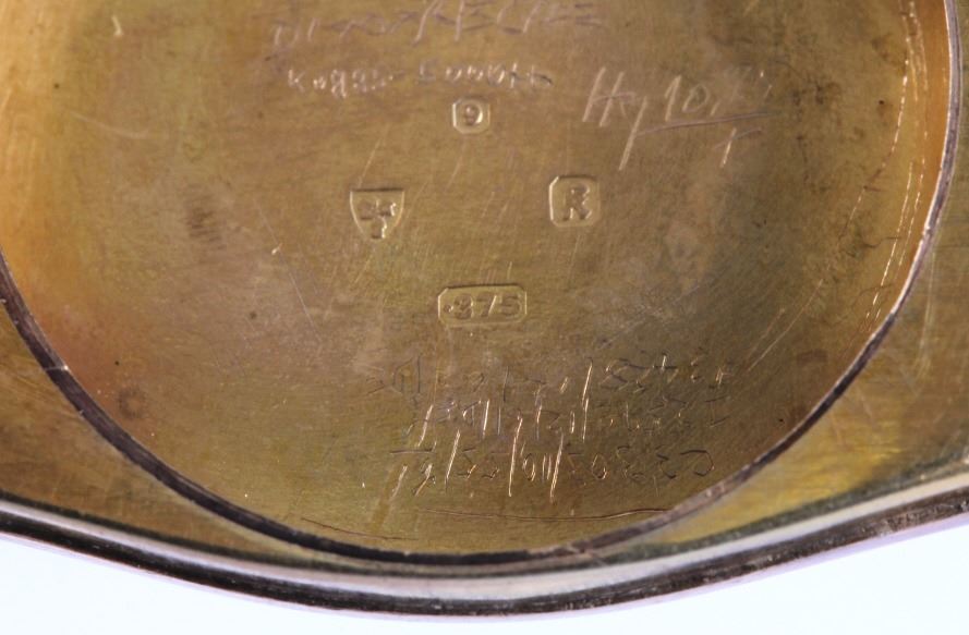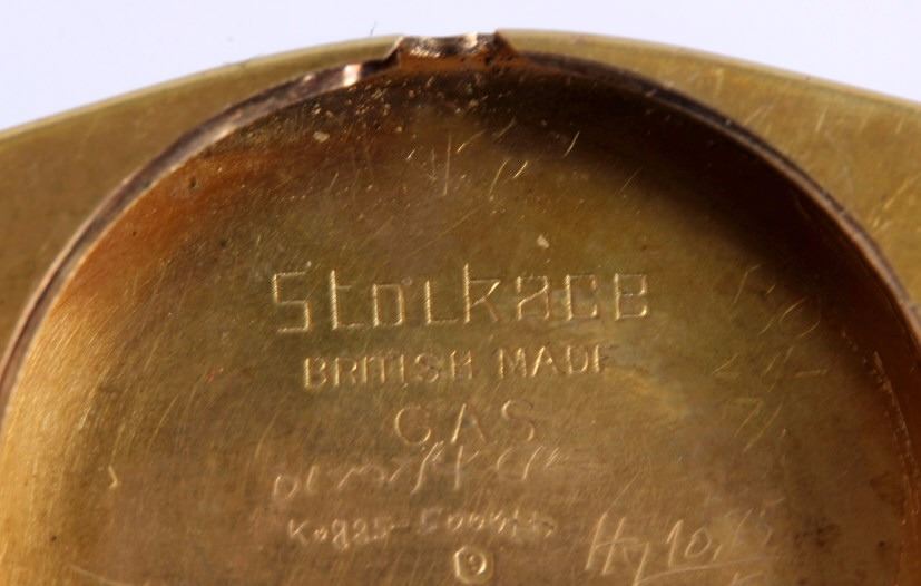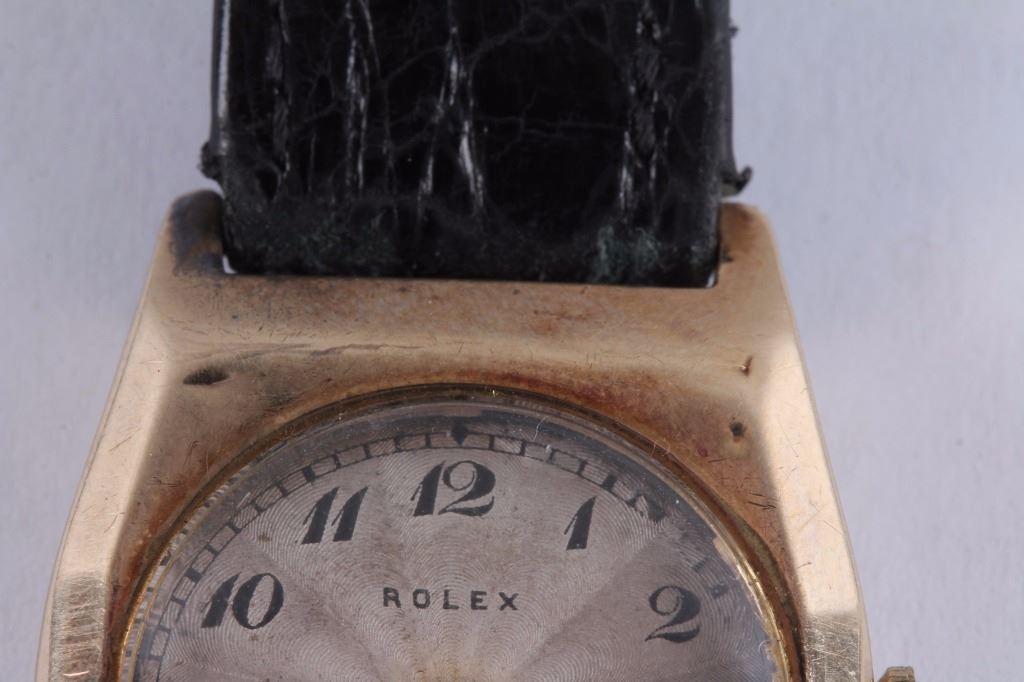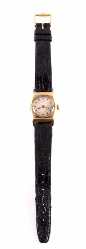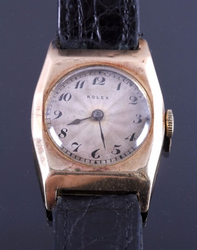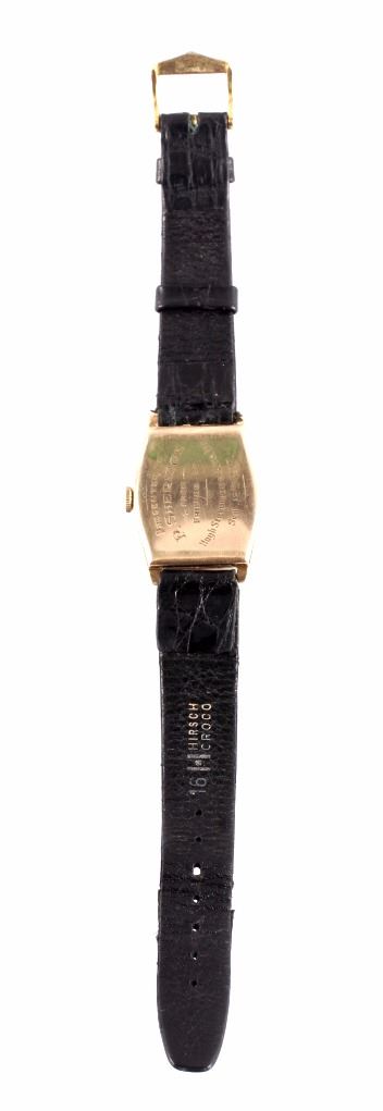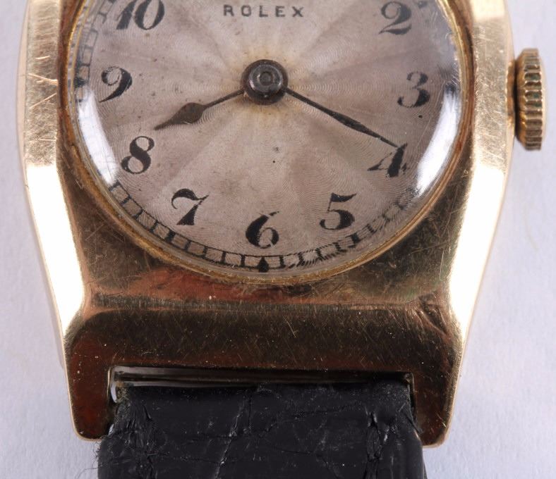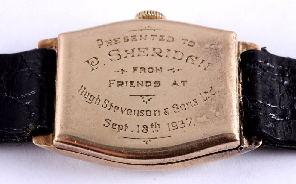 This is a 1937 gold Rolex presentation watch. The movement is marked "Rolex 15 Jewel" on the back and "Rolex" on the face. The back of the case is inscribed "Presented to P. Sheridan From Friends at Hugh Stevenson& Sons Ltd. Sept. 18th 1937". The inside of the case is marked "Stolkace British Made" and ".375" for the 9K gold content. The Rolex presentation watch is in good condition. It has been tested and is in good working condition. The watch measures 1" x 1.5" and 8.5" long overall.