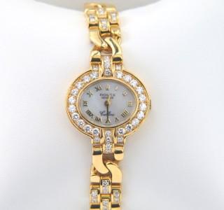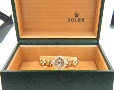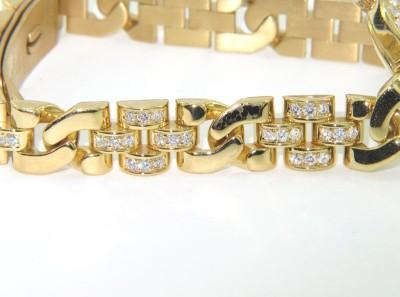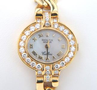 Rolex Cellini 18K Yellow Gold Diamond, Mother of Pearl Dial Watch.The total watch's weight is 62 grams.The total weight of diamond: 3.25 cts. F-G color VS2 clarity.The size of watch head: 22 x 26 mm and 6 mm thick.The length of the watch is 7.25".Swiss Made.Water Resistant.Chain is 9 mm wide