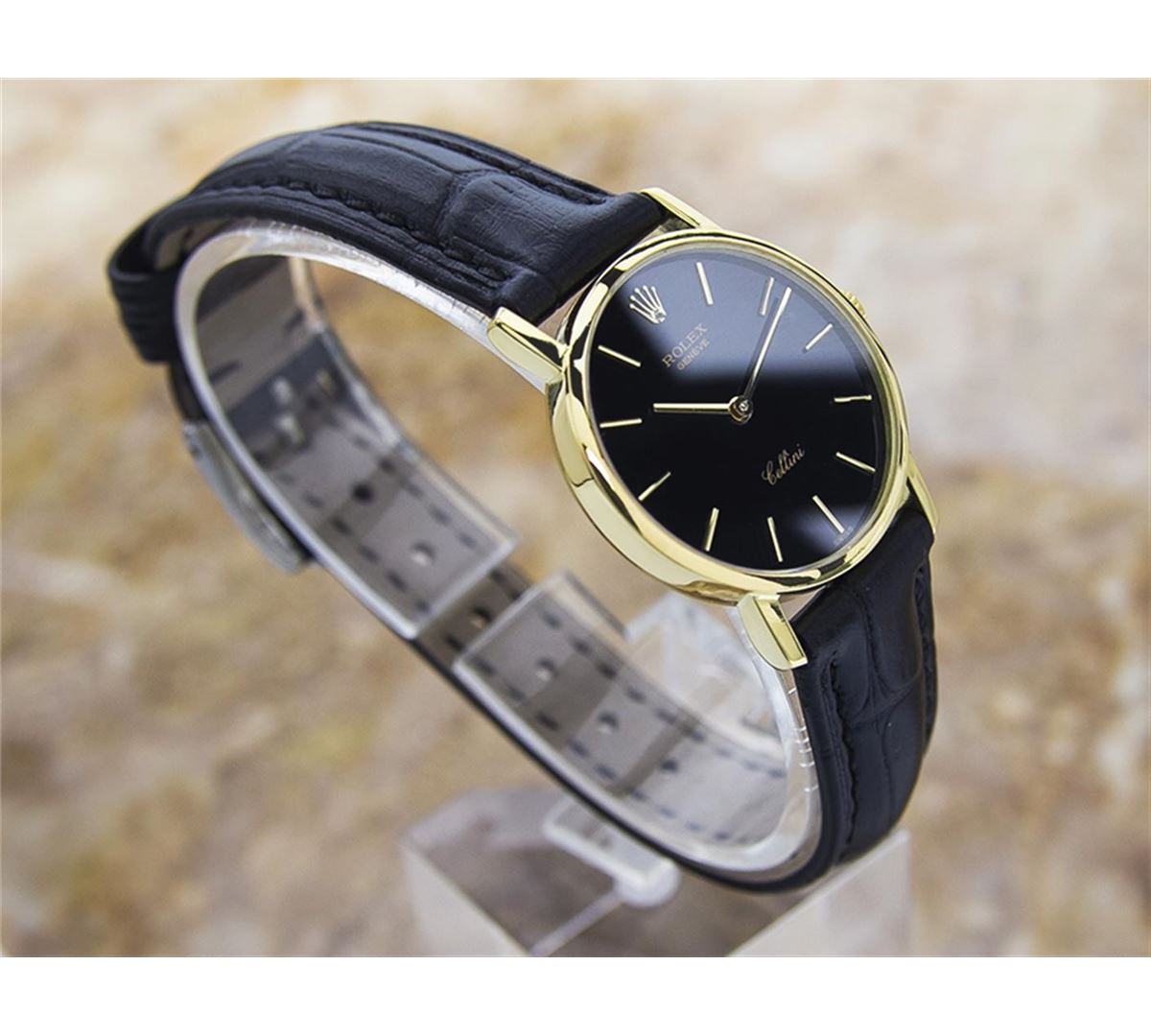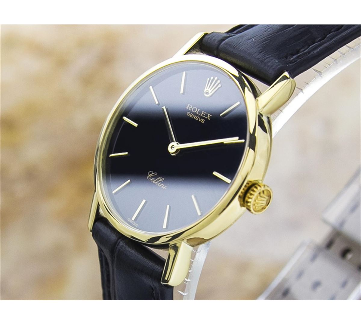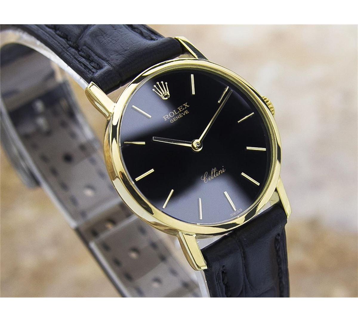 Rolex Cellini 18KT Yellow Gold Manual Watch. Brand: Rolex. Model: CELLINI. Movement: Manual. Case Material: 18K SOLID GOLD. Crystal: SAPPHIRE. Case Size: 26. Band: AFTERMARKET LEATHER BAND.