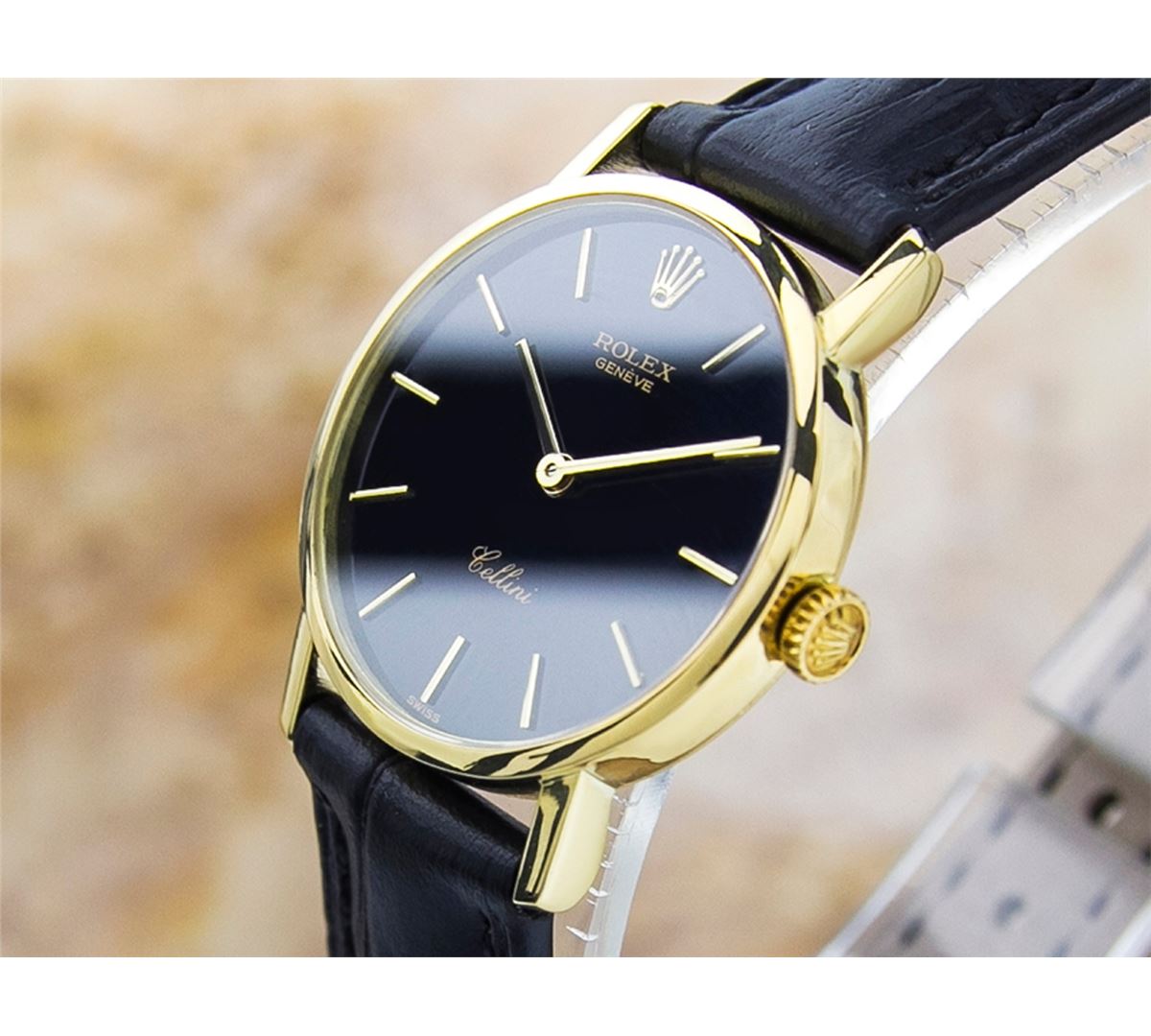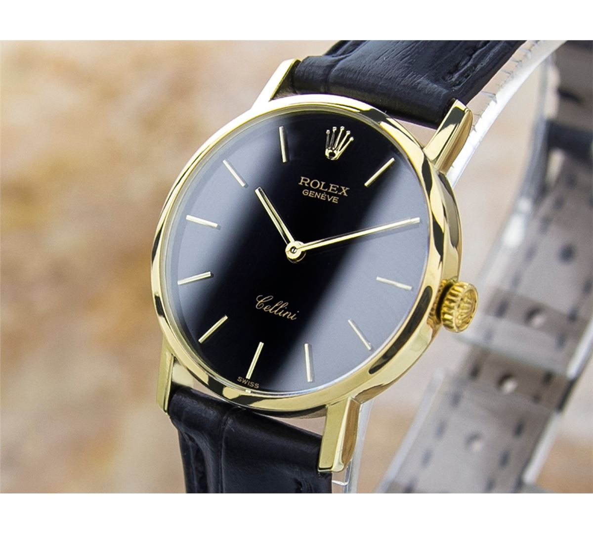 Rolex Cellini 18KT Yellow Gold Manual Watch. Brand: Rolex. Model: CELLINI. Movement: Manual. Case Material: 18K SOLID GOLD. Crystal: SAPPHIRE. Case Size: 26. Band: AFTERMARKET LEATHER BAND.