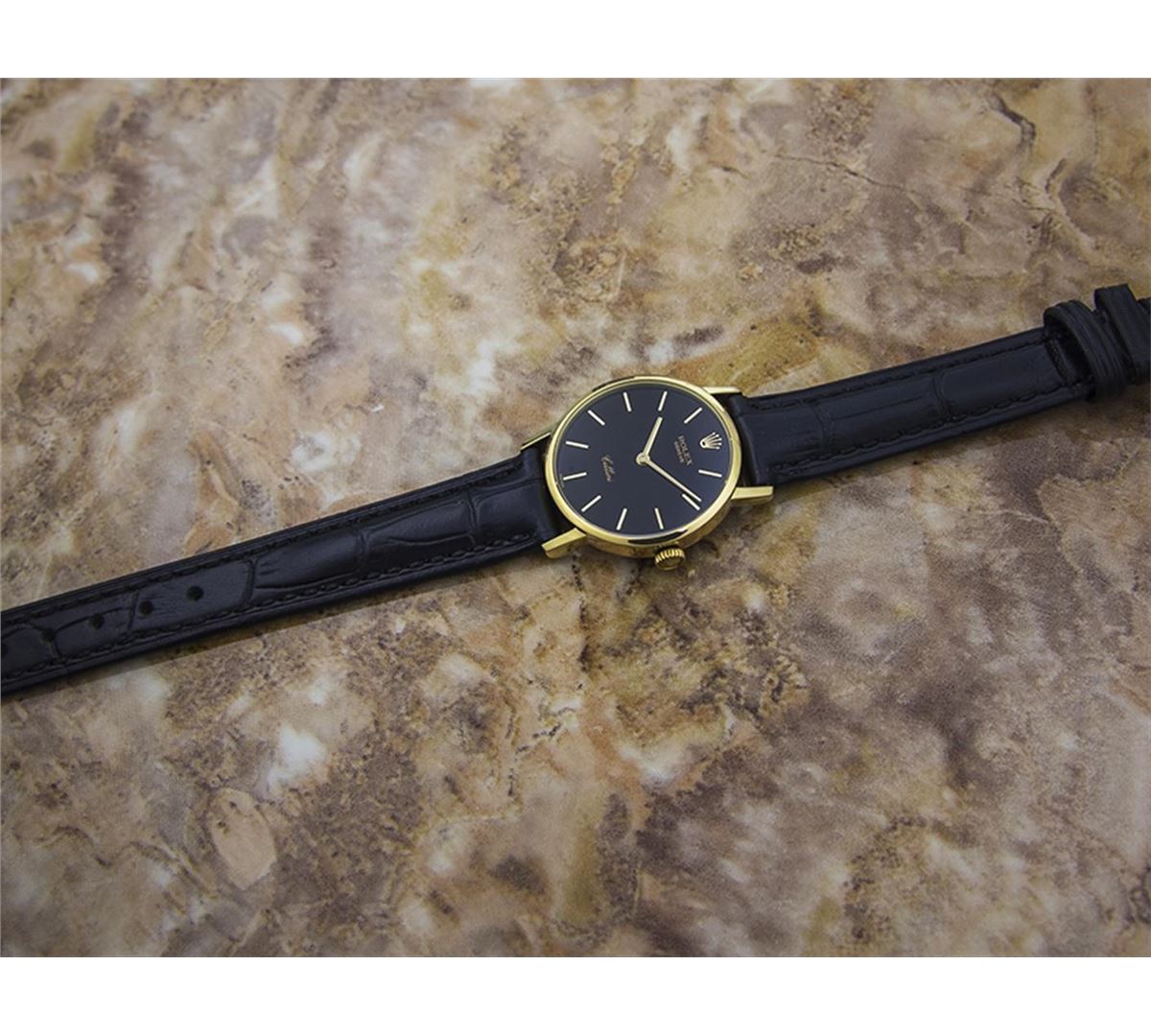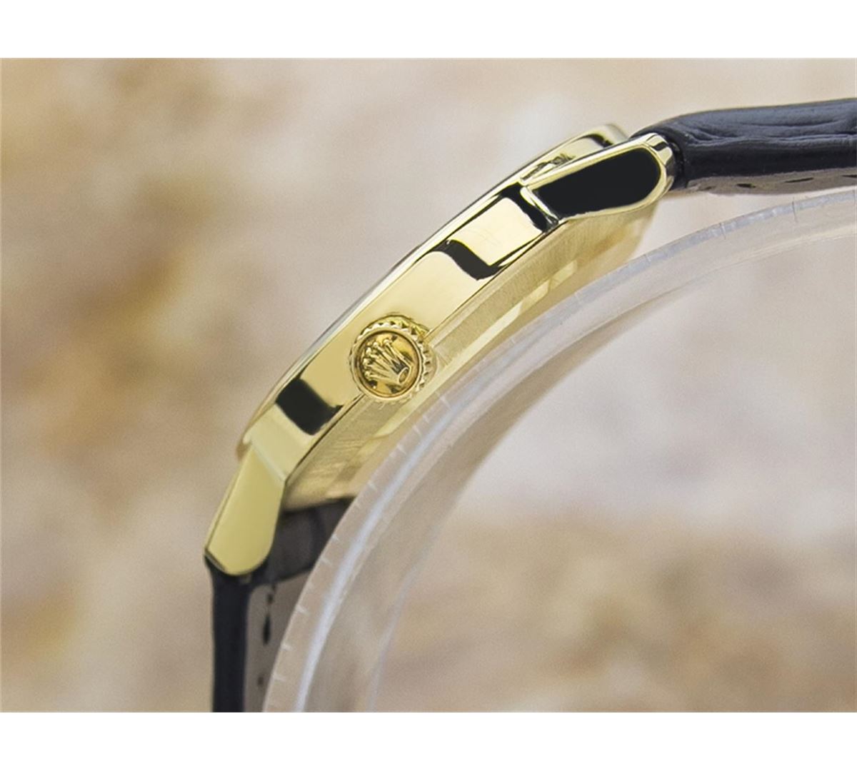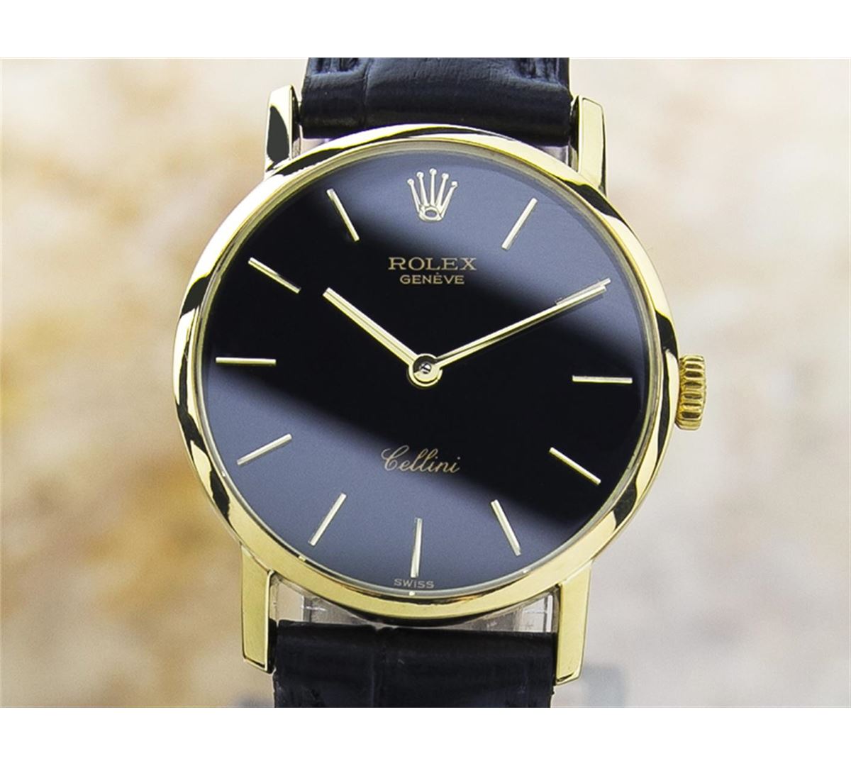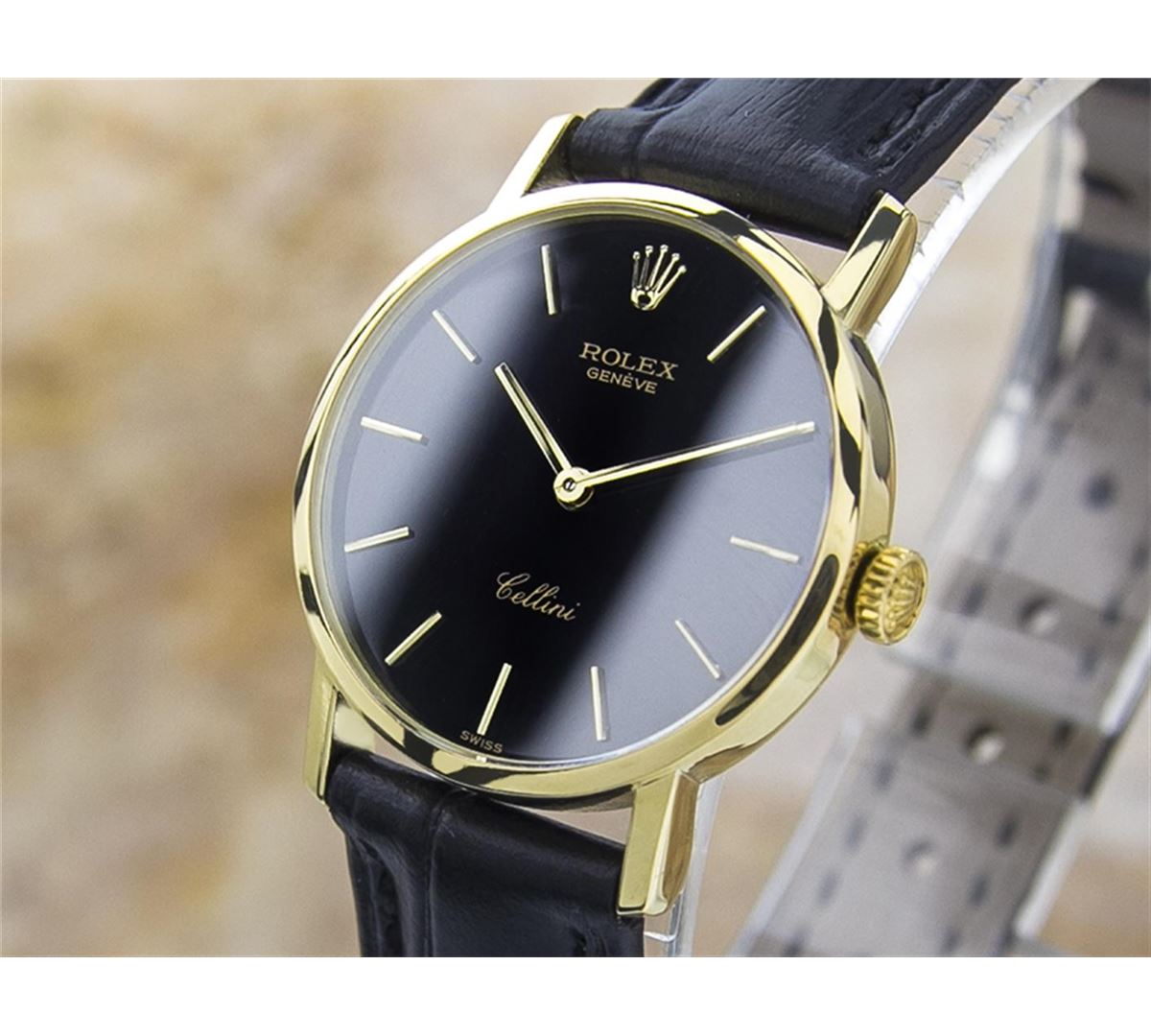 Rolex Cellini 18KT Yellow Gold Manual Watch. Brand: Rolex. Model: CELLINI. Movement: Manual. Case Material: 18K SOLID GOLD. Crystal: SAPPHIRE. Case Size: 26. Band: AFTERMARKET LEATHER BAND.