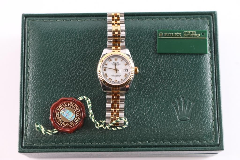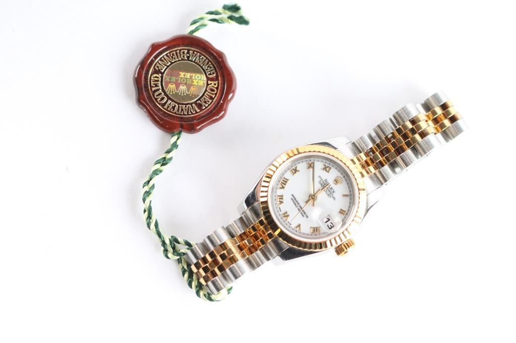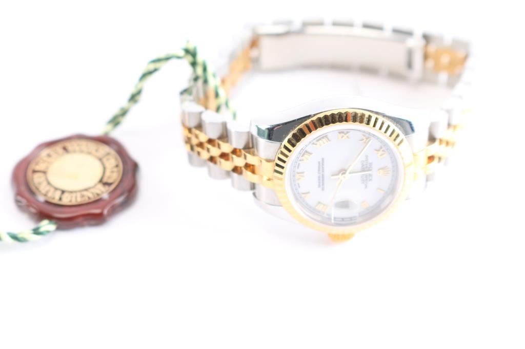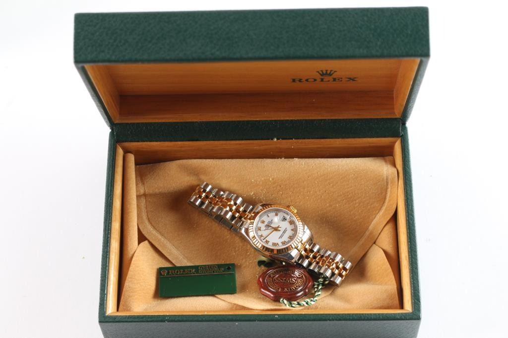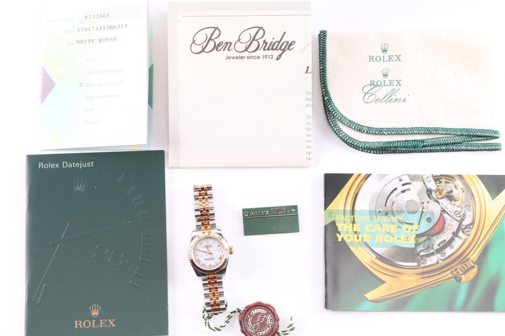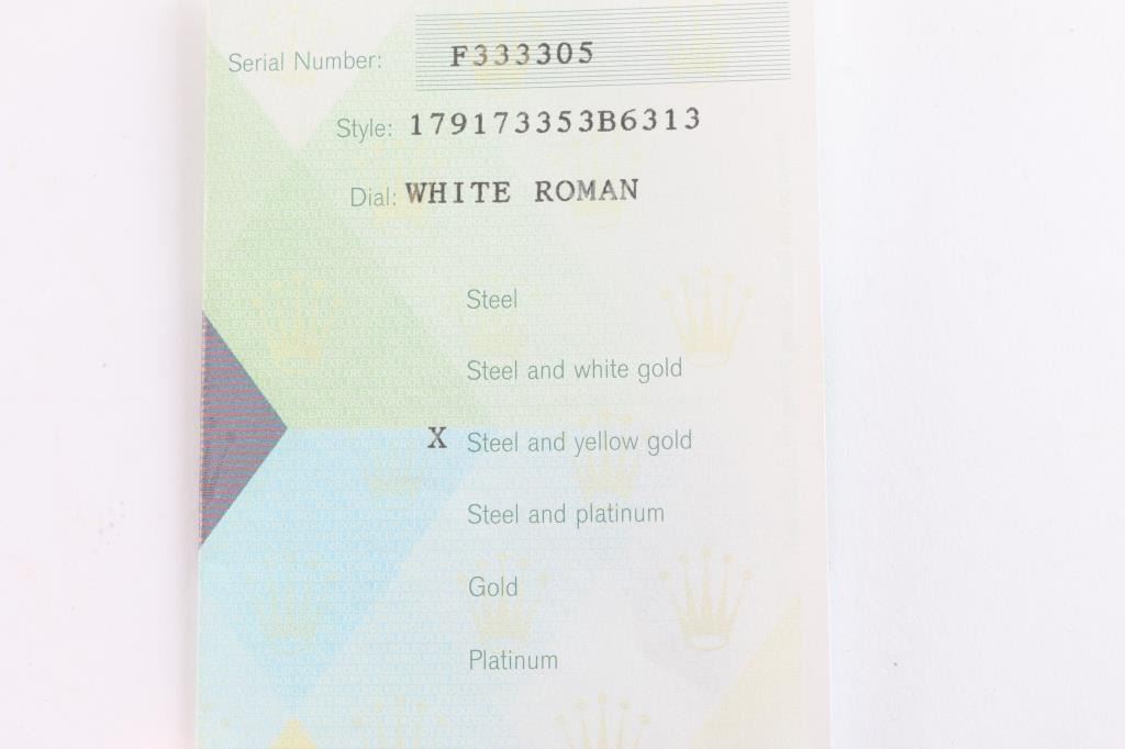 2 tone, gold and stainless wristwatch. Like new in original boxes with tag, paperwork and instructions. Serial # F333305, style 179173353B6313, white Roman dial. Purchased new by our consignor from Ben Bridge Jewelers (Diamond Bar, California) in 2005. Worn on just 3 or 4 special occasions and shows virtually no use.