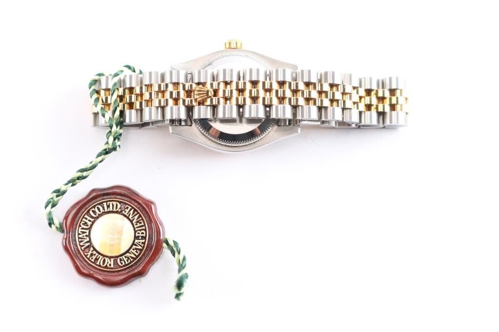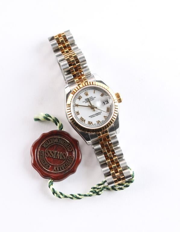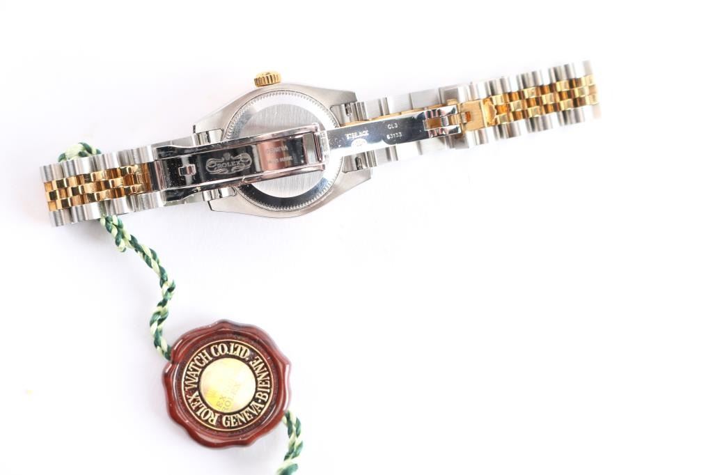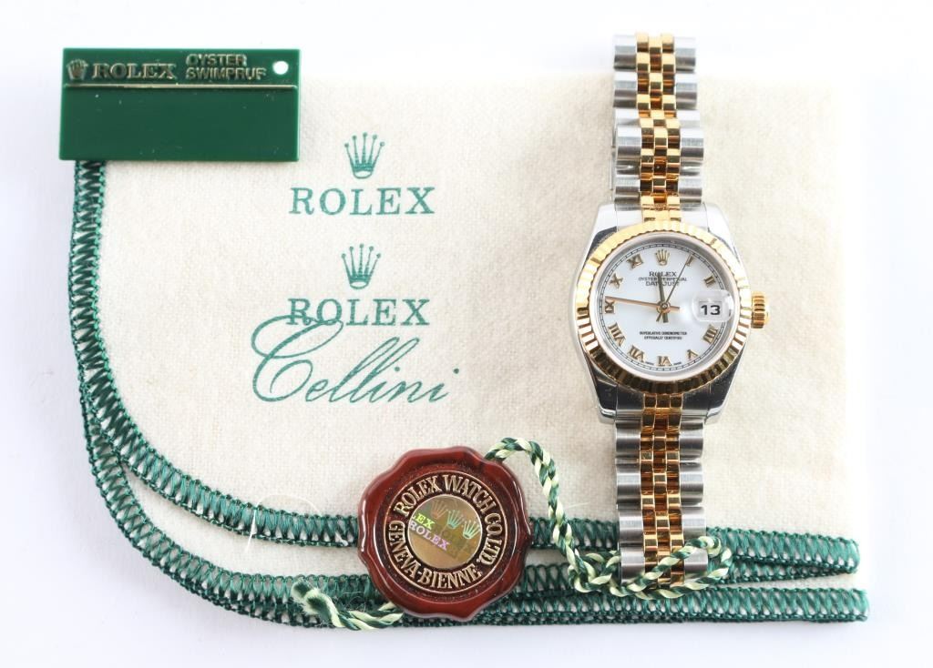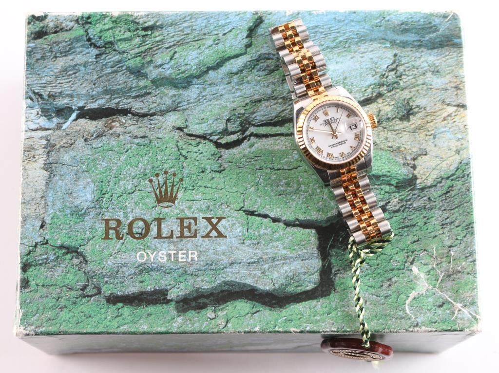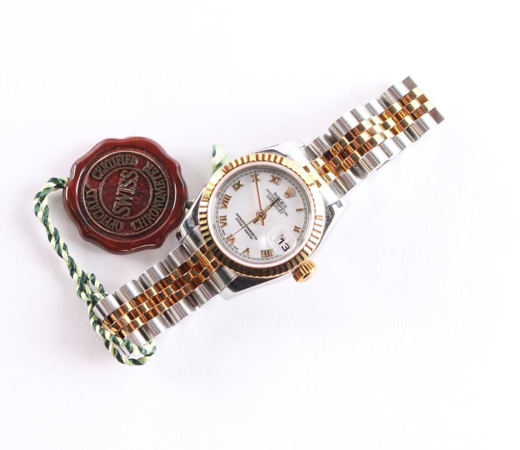 2 tone, gold and stainless wristwatch. Like new in original boxes with tag, paperwork and instructions. Serial # F333305, style 179173353B6313, white Roman dial. Purchased new by our consignor from Ben Bridge Jewelers (Diamond Bar, California) in 2005. Worn on just 3 or 4 special occasions and shows virtually no use.