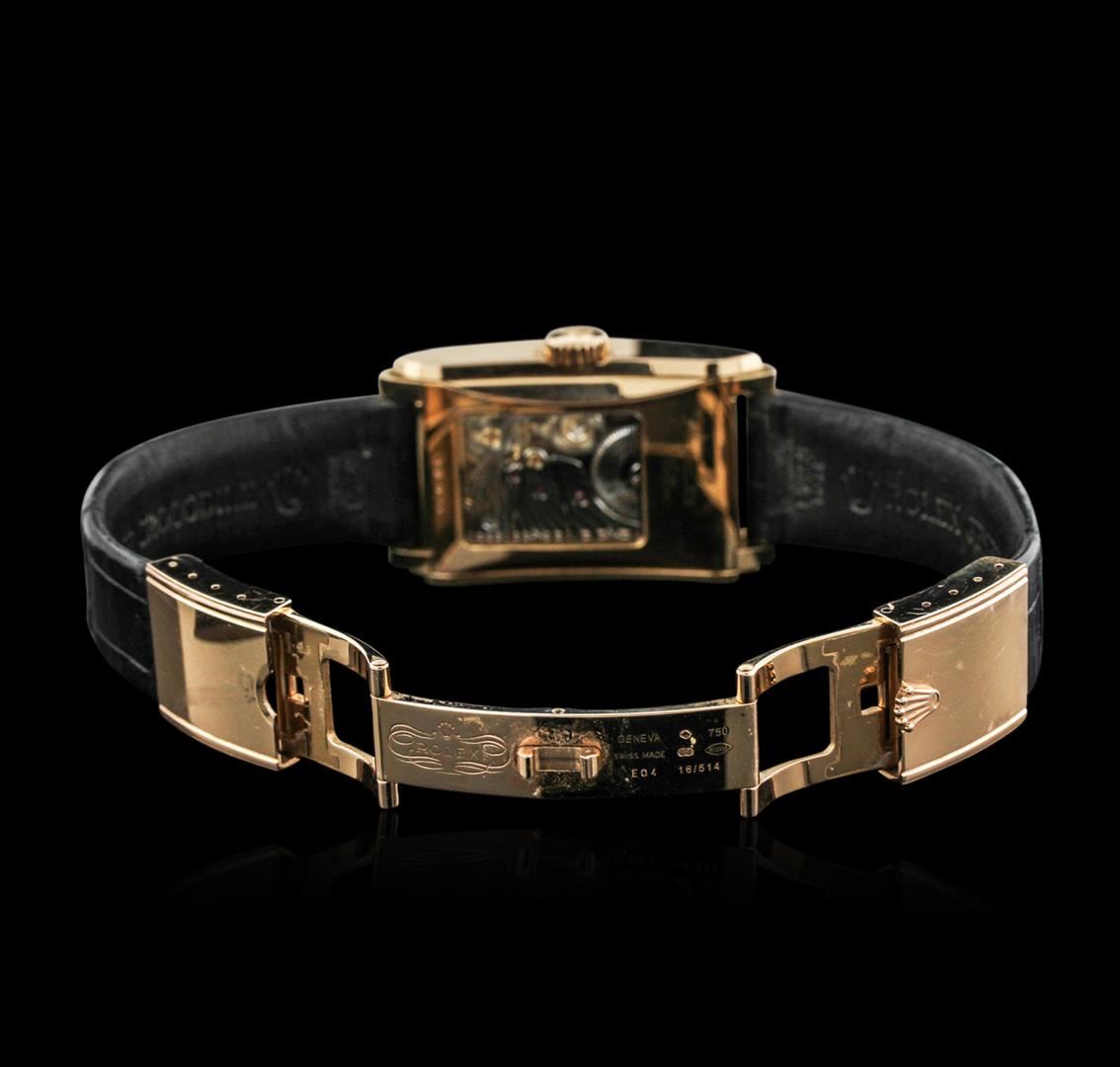 One, Rolex Cellini Prince wristwatch, electronically tested 18KT Rose gold, Tank Case: 44mm x 27mm, Exhibition Case Back: synthetic sapphire section, the border is engraved with the manufacturers name, model, logo, and hallmarks, Bezel: high polish, Logo'd Crown: Crystal: synthetic sapphire. Swiss Rolex Movement: mechanical, Dial: "Rayon Flamm, De La Gloire" Guilloche, with pointed hands, indices, and numerals, signed Rolex Prince, continuous seconds sub dial at the six o'clock position, Bracelet: Rolex, Black crocodile strap, 18KT rose gold Buckle: Rolex concealed deployment clasp, Condition: G-6 Extra Fine. Seven and three quarter inch length, adjustable. Total Weight of Watch110.81 grams. AIG Appraised at $16,000.00.