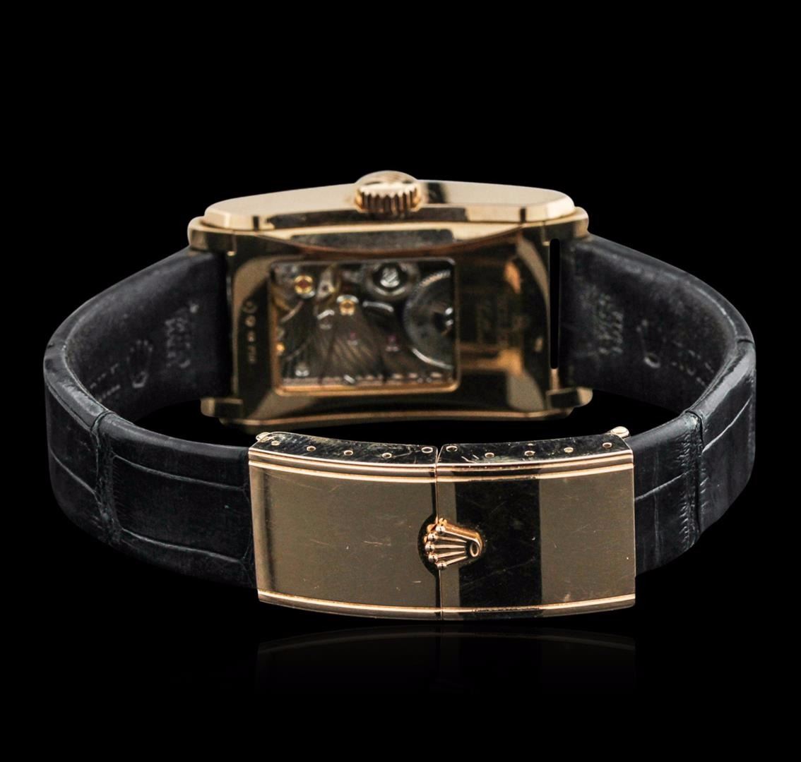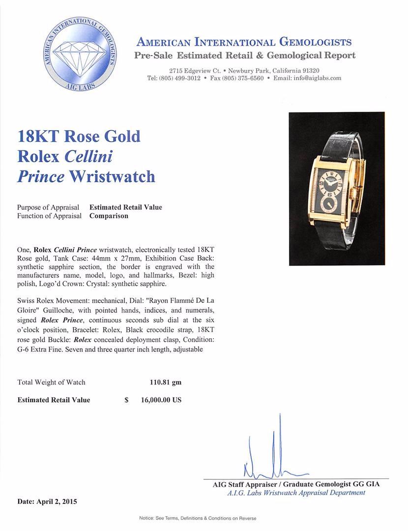 One, Rolex Cellini Prince wristwatch, electronically tested 18KT Rose gold, Tank Case: 44mm x 27mm, Exhibition Case Back: synthetic sapphire section, the border is engraved with the manufacturers name, model, logo, and hallmarks, Bezel: high polish, Logo'd Crown: Crystal: synthetic sapphire. Swiss Rolex Movement: mechanical, Dial: "Rayon Flamm, De La Gloire" Guilloche, with pointed hands, indices, and numerals, signed Rolex Prince, continuous seconds sub dial at the six o'clock position, Bracelet: Rolex, Black crocodile strap, 18KT rose gold Buckle: Rolex concealed deployment clasp, Condition: G-6 Extra Fine. Seven and three quarter inch length, adjustable. Total Weight of Watch110.81 grams. AIG Appraised at $16,000.00.