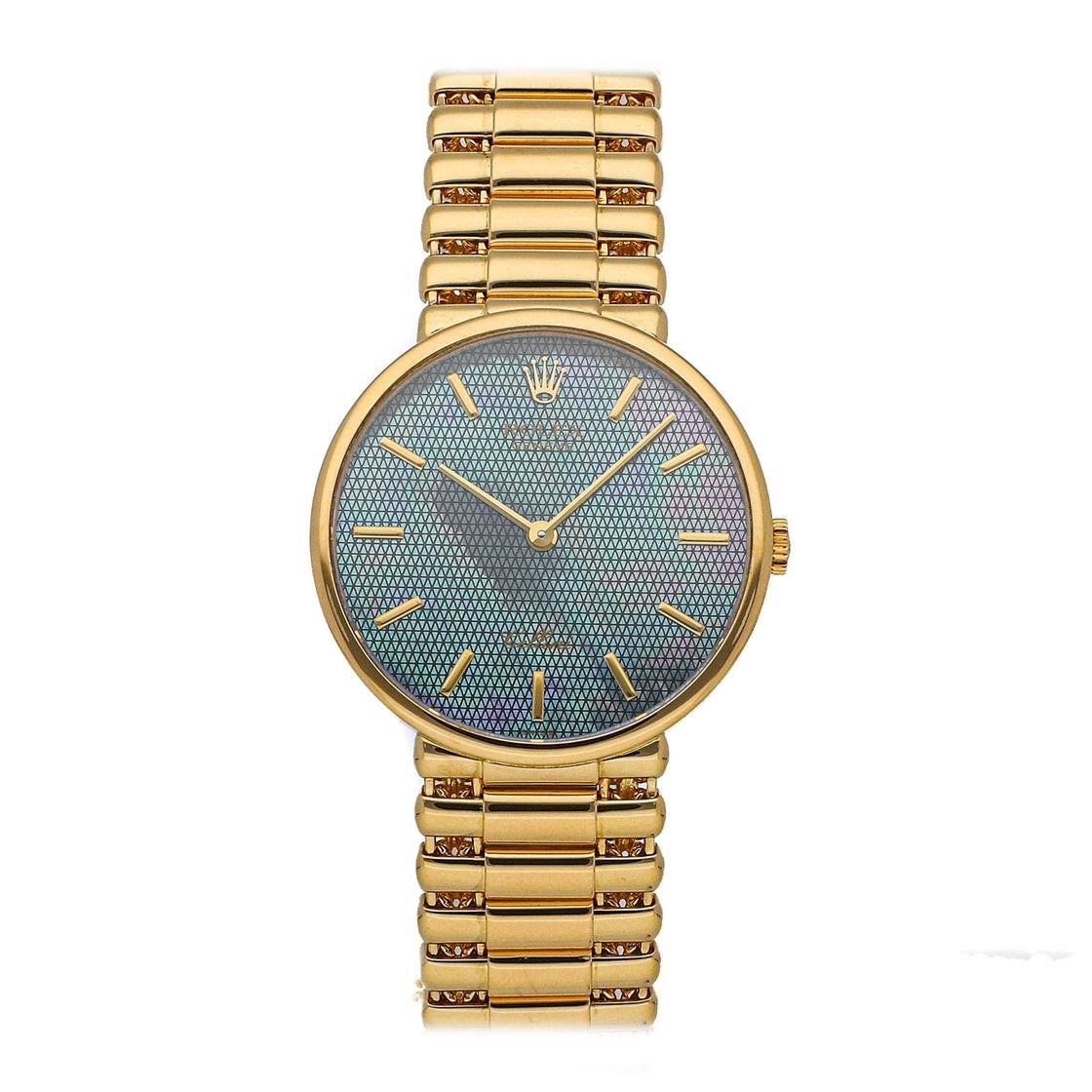 Pre-Owned Rolex Cellini (5162/8) manual-wind watch, features a 32mm 18k yellow gold case surrounding a black mother-of-pearl dial on an 18k yellow gold bracelet with folding buckle. Functions include hours and minutes. This watch comes with the original box and warranty