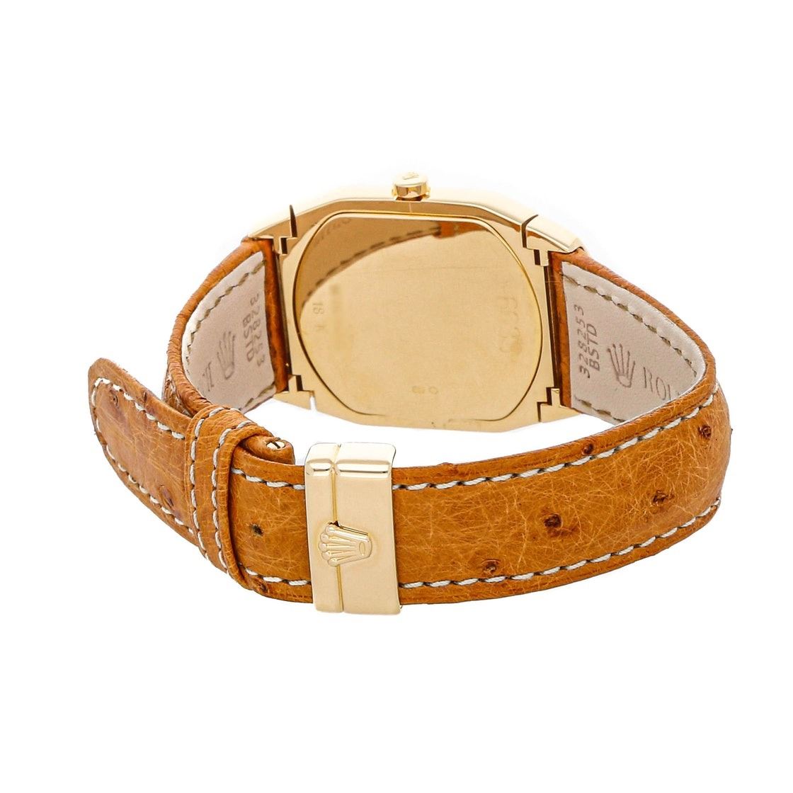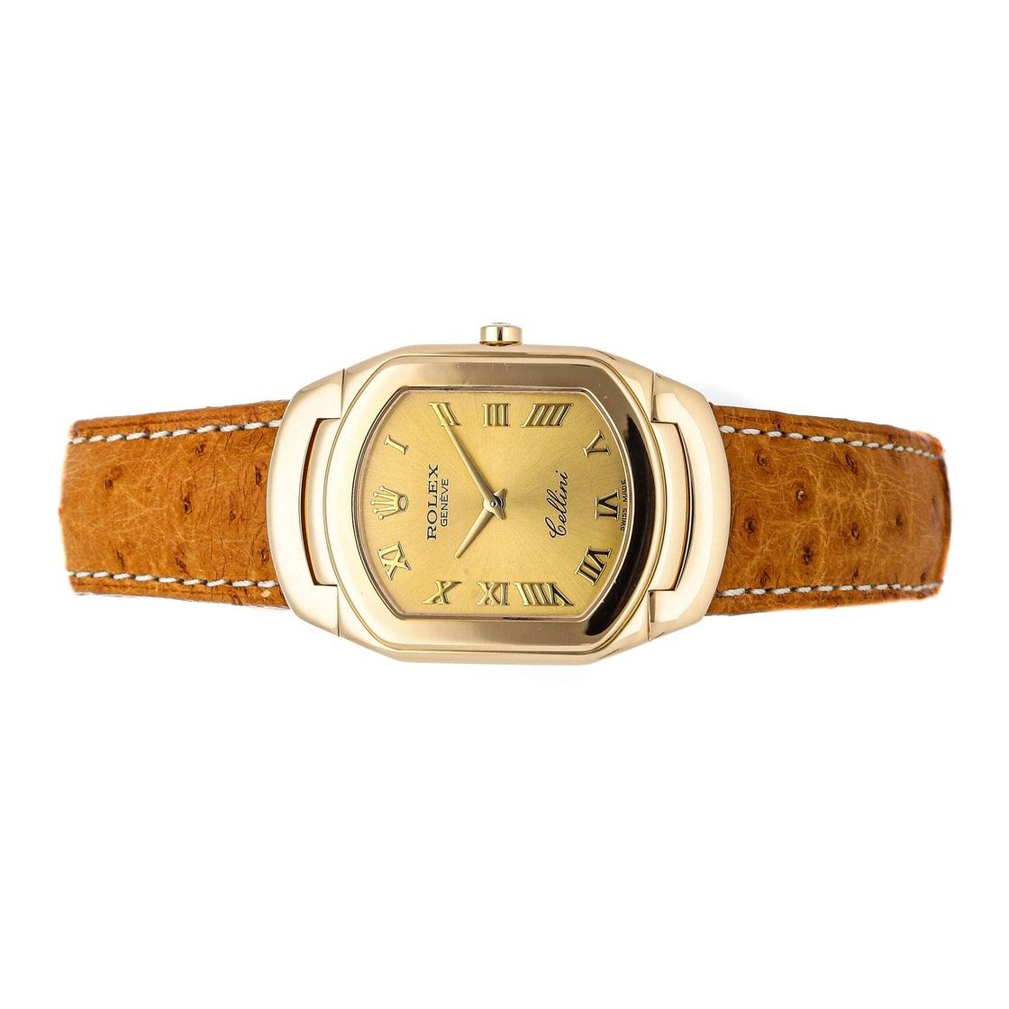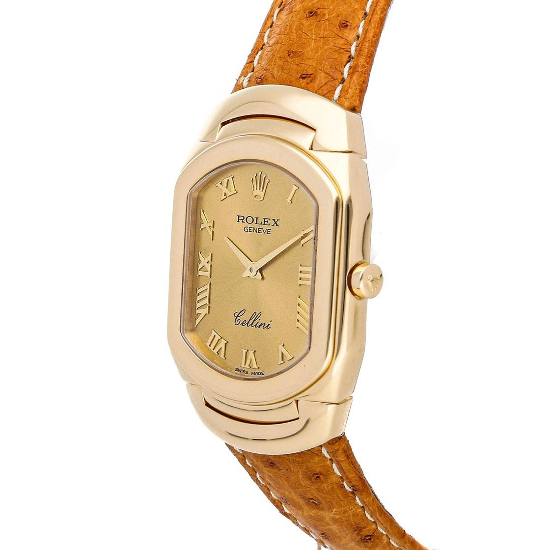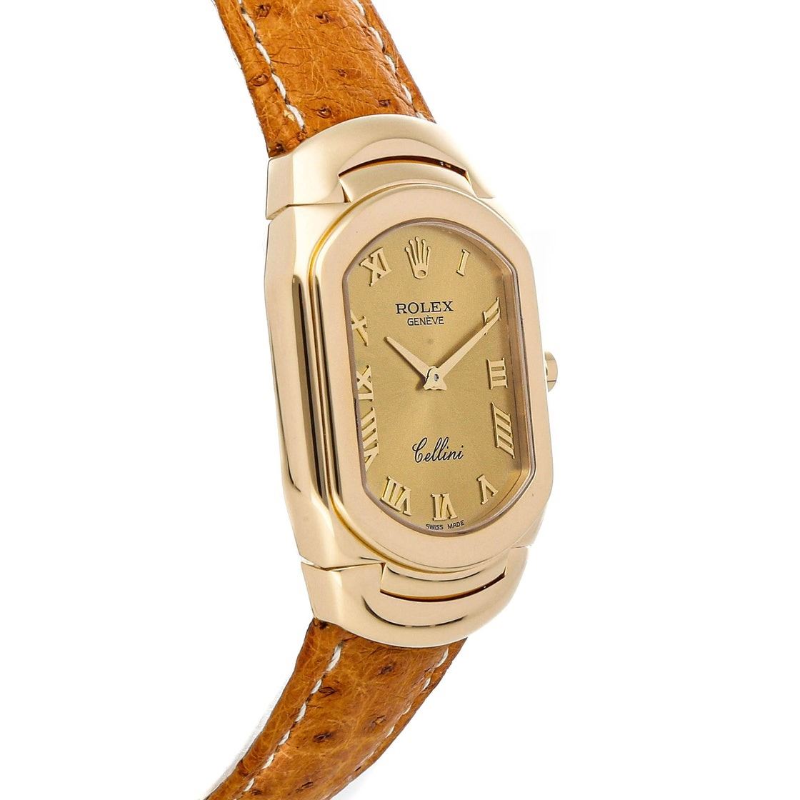 Rolex Cellini (66338) quartz watch, features a 35mm x 29mm 18k yellow gold case surrounding a champagne dial on a brown ostrich strap with an 18k yellow gold deployant buckle.